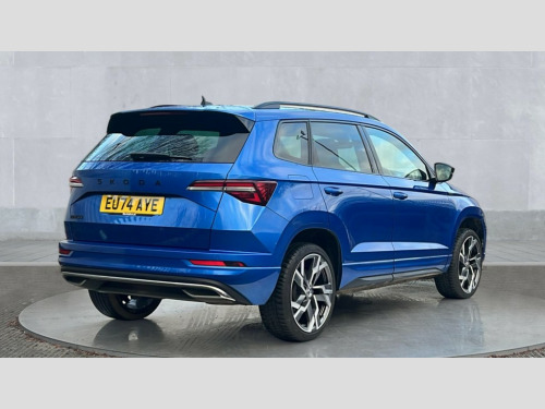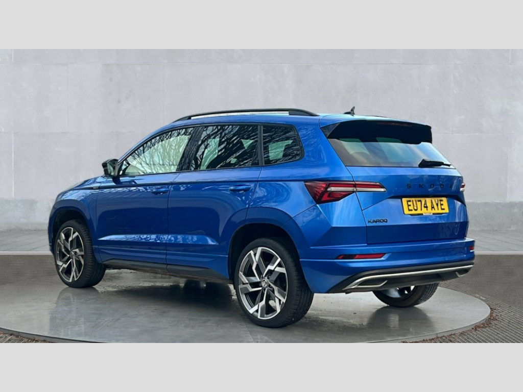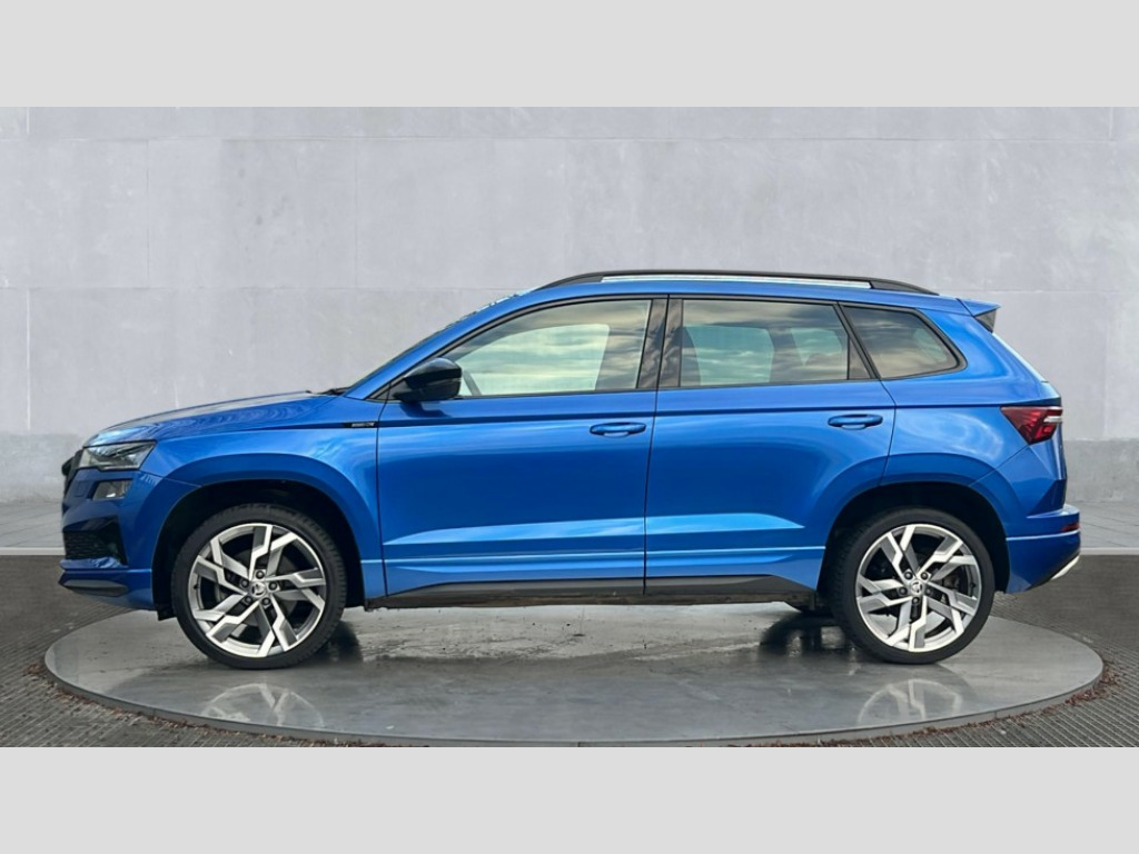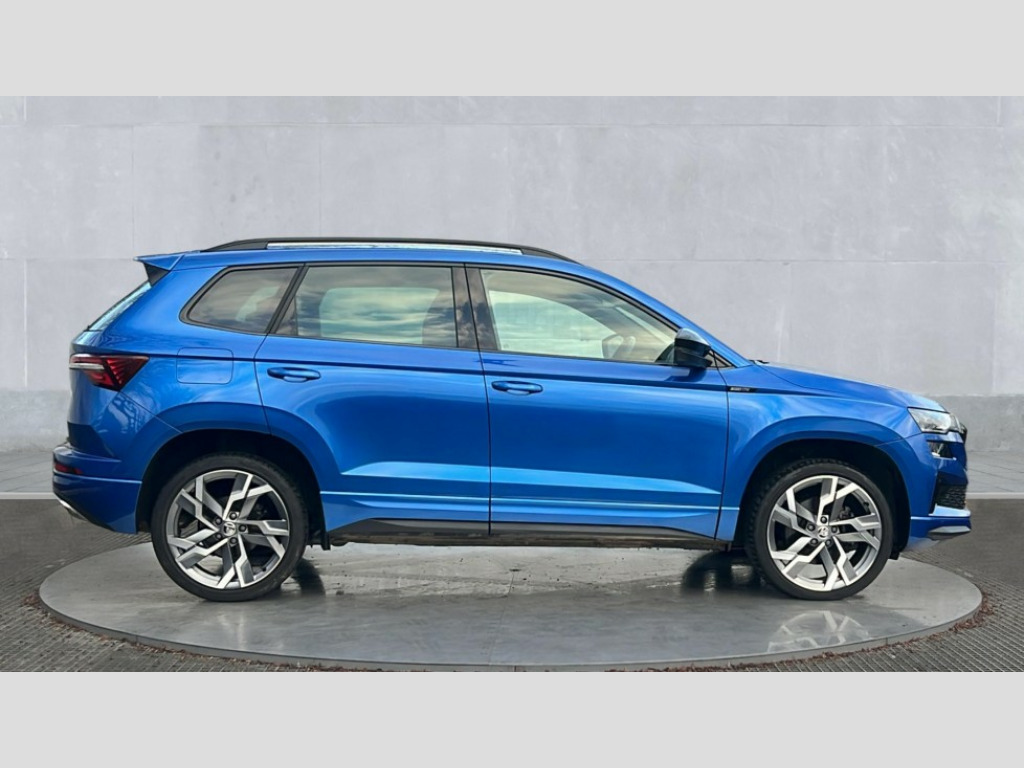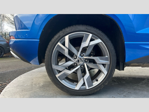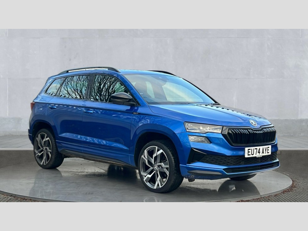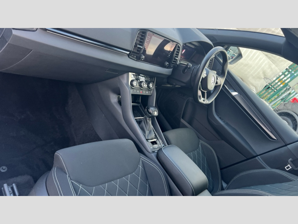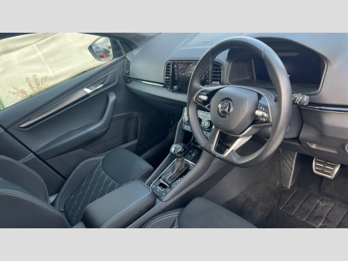 Skoda Karoq 1.5 TSI Sportline 5dr DSG 8" Digital display, Advanced driver attention and drowsiness monitor, Emergency services call system, Outside temperature gauge, Sensor for driver assistance systems, Service interval indicator, SmartLink wireless for Apple and wired for Android, Start/stop system with regenerative braking, USB C Port x 2 in front centre console, Virtual Cockpit - 10.25" digital display, Virtual pedal with electrically operated boot door, Wireless smartphone charging, DAB radio with Bluetooth, USB connection, Acoustic glass, Aero front windscreen wipers with intermittent function, Auto dimming rear view mirror with light and rain sensors, Black door mirrors, Black electric window control buttons, Black radiator grille, Black roof rails, Body colour door handles, Electric front and rear windows with child proof lock, Front door steps with SportLine logo, Heated rear windscreen, LED daytime running lights, LED rear lights with high functionality welcome effect and dynamic indicators, Light assistant (coming/leaving home/tunnel light), Panoramic sliding sunroof, Plastic scuff plates in door apertures, Privacy glass, Protective door side sills in body colour, Rear diffuser, Rear side wing doors, Rear spoiler, Rear window wiper with washer system and intermittent control, Safety reflectors on front doors, Skoda lettering on tailgate in black, Sportline badge on front fender, Sportline decorative inserts with badging, Sports front and rear bumpers, Third brake light, 1.5 litre bottle holders in driver and front passenger door panels, 12V socket in boot, 12v socket in front centre armrest with storage compartment and rear air vents, 2 x Tablet holder, 3 rear height adjustable headrests, 3 seat bench in 2nd row, 3 spoke sports leather heated multifunction steering wheel with DSG paddles, 4 foldable roof handles with rear coat hooks, Black floor carpet, Black roof headlining, Chrome inner door handles, Foldable hooks in the boot, Front head restraints, Height adjustable front three point seats belts with tensioners, Height/reach adjust steering wheel, Ice scraper, Illuminated glovebox, Illuminated luggage compartment, Isofix child seat preparation for front passenger seat, Isofix child seat preparation outer rear, Manual lumbar support for front seats, Pen holder, Pollen filter, Rear boot cover, Rear reading lights, Rear seats fixed folding and divided 60:40, Rubbish bin door, Safety vest holder, Single front passenger seat, Storage box in upper central dashboard closed, Sunvisors with illuminated vanity mirrors, Textile floor mats, Ticket holder, Titan black interior ceiling, Umbrella under passenger seat, Under passenger seat storage compartment, LED Interior lighting pack with Skoda welcome logo - Karoq, Light Pack - Karoq, Non Smokers pack, Automatic door unlocking in case of crash, Automatic fuel cut off in case of crash, Driver airbag, Electronic parking brake with auto hold function, Emergency rear braking signal, ESC (incl. ABS+MSR+ASR+EDS+HBA+DSR+RBS+MKB), Front side airbags, Head airbags, Hill hold control, Knee airbags, Passenger airbag with switch-off function, Pedestrian monitor, Seatbelt reminder signalisation and pretensioner for all seats, Three point seatbelts rear, Two tone horn, Tyre pressure monitor, Alarm with interior monitoring, back up horn and tilt sensor with safe function, Electronic engine immobiliser, Keyless entry and start/stop, Remote central locking with 2 remote folding keys, Black air vent surround, Black centre console, carbon door decor, Satin black dashboard, Satin black door trim, 19" Sagittarius anthracite alloy wheels, Anti-theft wheel bolts protection, Breakdown and tool kit