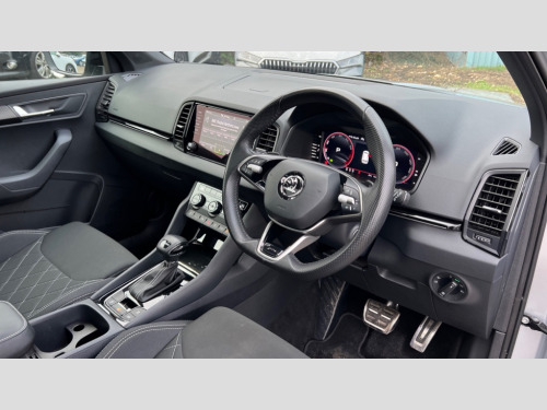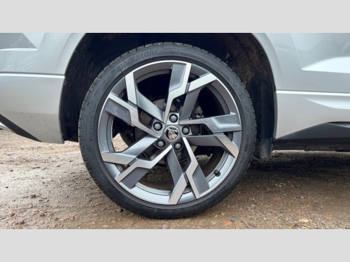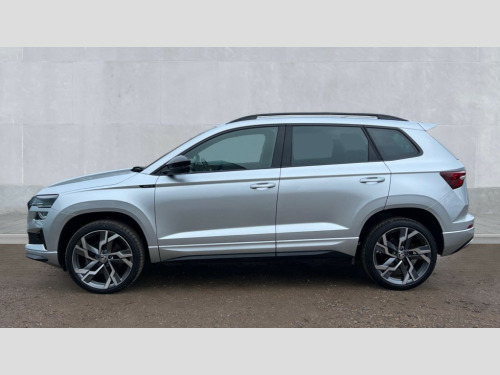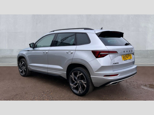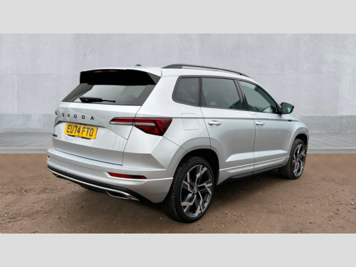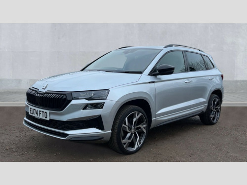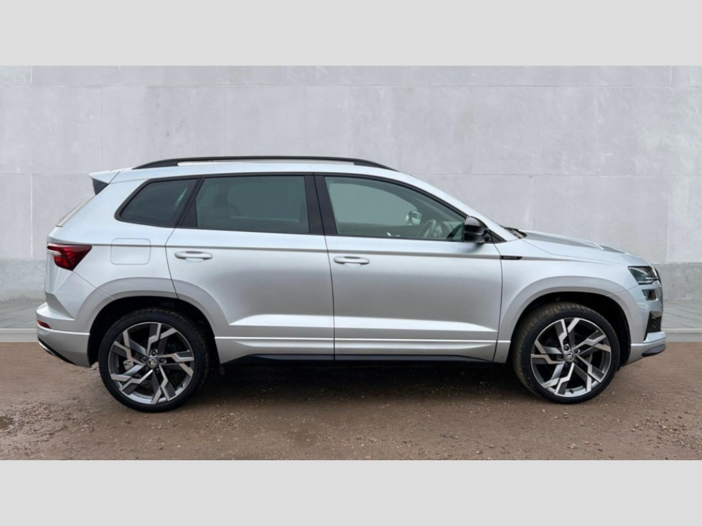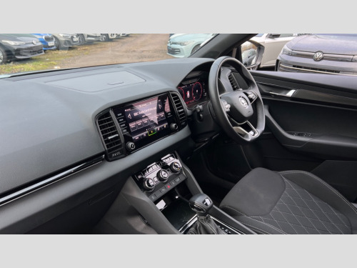Skoda Karoq 1.5 TSI Sportline 5dr DSG 8" Digital display, Advanced driver attention and drowsiness monitor, Emergency services call system, Outside temperature gauge, Sensor for driver assistance systems, Service interval indicator, SmartLink wireless for Apple and wired for Android, Start/stop system with regenerative braking, USB C Port x 2 in front centre console, Virtual Cockpit - 10.25" digital display, Virtual pedal with electrically operated boot door, Wireless smartphone charging, DAB radio with Bluetooth, USB connection, Acoustic glass, Aero front windscreen wipers with intermittent function, Auto dimming rear view mirror with light and rain sensors, Black door mirrors, Black electric window control buttons, Black radiator grille, Black roof rails, Body colour door handles, Electric front and rear windows with child proof lock, Front door steps with SportLine logo, Heated rear windscreen, LED daytime running lights, LED rear lights with high functionality welcome effect and dynamic indicators, Light assistant (coming/leaving home/tunnel light), Panoramic sliding sunroof, Plastic scuff plates in door apertures, Privacy glass, Protective door side sills in body colour, Rear diffuser, Rear side wing doors, Rear spoiler, Rear window wiper with washer system and intermittent control, Safety reflectors on front doors, Skoda lettering on tailgate in black, Sportline badge on front fender, Sportline decorative inserts with badging, Sports front and rear bumpers, Third brake light, 1.5 litre bottle holders in driver and front passenger door panels, 12V socket in boot, 12v socket in front centre armrest with storage compartment and rear air vents, 2 x Tablet holder, 3 rear height adjustable headrests, 3 seat bench in 2nd row, 3 spoke sports leather heated multifunction steering wheel with DSG paddles, 4 foldable roof handles with rear coat hooks, Black floor carpet, Black roof headlining, Chrome inner door handles, Foldable hooks in the boot, Front head restraints, Height adjustable front three point seats belts with tensioners, Height/reach adjust steering wheel, Ice scraper, Illuminated glovebox, Illuminated luggage compartment, Isofix child seat preparation for front passenger seat, Isofix child seat preparation outer rear, Manual lumbar support for front seats, Pen holder, Pollen filter, Rear boot cover, Rear reading lights, Rear seats fixed folding and divided 60:40, Rubbish bin door, Safety vest holder, Single front passenger seat, Storage box in upper central dashboard closed, Sunvisors with illuminated vanity mirrors, Textile floor mats, Ticket holder, Titan black interior ceiling, Umbrella under passenger seat, Under passenger seat storage compartment, LED Interior lighting pack with Skoda welcome logo - Karoq, Light Pack - Karoq, Non Smokers pack, Automatic door unlocking in case of crash, Automatic fuel cut off in case of crash, Driver airbag, Electronic parking brake with auto hold function, Emergency rear braking signal, ESC (incl. ABS+MSR+ASR+EDS+HBA+DSR+RBS+MKB), Front side airbags, Head airbags, Hill hold control, Knee airbags, Passenger airbag with switch-off function, Pedestrian monitor, Seatbelt reminder signalisation and pretensioner for all seats, Three point seatbelts rear, Two tone horn, Tyre pressure monitor, Alarm with interior monitoring, back up horn and tilt sensor with safe function, Electronic engine immobiliser, Keyless entry and start/stop, Remote central locking with 2 remote folding keys, Black air vent surround, Black centre console, carbon door decor, Satin black dashboard, Satin black door trim, 19" Sagittarius anthracite alloy wheels, Anti-theft wheel bolts protection, Breakdown and tool kit