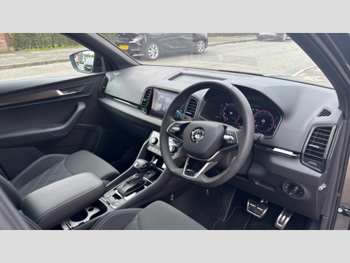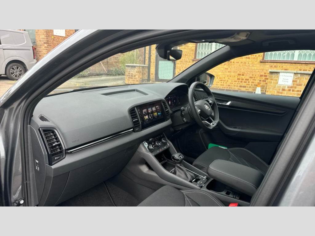Heated front and rear seats 8" Digital display, Advanced driver attention and drowsiness monitor, Emergency services call system, Outside temperature gauge, Sensor for driver assistance systems, Service interval indicator, SmartLink wireless for Apple and wired for Android, Start/stop system with regenerative braking, USB C Port x 2 in front centre console, Virtual Cockpit - 10.25" digital display, Virtual pedal with electrically operated boot door, Wireless smartphone charging, DAB radio with Bluetooth, USB connection, Acoustic glass, Aero front windscreen wipers with intermittent function, Auto dimming rear view mirror with light and rain sensors, Black door mirrors, Black electric window control buttons, Black radiator grille, Black roof rails, Body colour door handles, Electric front and rear windows with child proof lock, Front door steps with SportLine logo, Heated rear windscreen, LED daytime running lights, LED rear lights with high functionality welcome effect and dynamic indicators, Light assistant (coming/leaving home/tunnel light), Panoramic sliding sunroof, Plastic scuff plates in door apertures, Privacy glass, Protective door side sills in body colour, Rear diffuser, Rear side wing doors, Rear spoiler, Rear window wiper with washer system and intermittent control, Safety reflectors on front doors, Skoda lettering on tailgate in black, Sportline badge on front fender, Sportline decorative inserts with badging, Sports front and rear bumpers, Third brake light, Unique dark chrome design logo on alloy wheels, 1.5 litre bottle holders in driver and front passenger door panels, 12V socket in boot, 12v socket in front centre armrest with storage compartment and rear air vents, 2 x Tablet holder, 3 rear height adjustable headrests, 3 seat bench in 2nd row, 3 spoke sports leather heated multifunction steering wheel, 4 foldable roof handles with rear coat hooks, Black floor carpet, Black roof headlining, Chrome inner door handles, Foldable hooks in the boot, Front head restraints, Height adjustable front three point seats belts with tensioners, Height/reach adjust steering wheel, Ice scraper, Illuminated glovebox, Illuminated luggage compartment, Isofix child seat preparation for front passenger seat, Isofix child seat preparation outer rear, Manual lumbar support for front seats, Pen holder, Pollen filter, Rear boot cover, Rear reading lights, Rear seats fixed folding and divided 60:40, Rubbish bin door, Safety vest holder, Single front passenger seat, Skoda lettering on steering wheel, Storage box in upper central dashboard closed, Sunvisors with illuminated vanity mirrors, Textile floor mats, Ticket holder, Titan black interior ceiling, Umbrella under passenger seat, Under passenger seat storage compartment, Ambient Lighting Package - Karoq, Columbus pack - Karoq, LED Interior lighting pack with Skoda welcome logo - Karoq, Light Pack - Karoq, Non Smokers pack, Performance pack - Karoq, Winter plus pack with heated front and rear seats - Karoq, Automatic door unlocking in case of crash, Automatic fuel cut off in case of crash, Driver airbag, Electronic parking brake with auto hold function, Emergency rear braking signal, ESC (incl. ABS+MSR+ASR+EDS+HBA+DSR+RBS+MKB), Front side airbags, Head airbags, Hill hold control, Knee airbags, Passenger airbag with switch-off function, Pedestrian monitor, Seatbelt reminder signalisation and pretensioner for all seats, Three point seatbelts rear, Two tone horn, Tyre pressure monitor, Alarm with interior monitoring, back up horn and tilt sensor with safe function, Electronic engine immobiliser, Keyless entry and start/stop, Remote central locking with 2 remote folding keys, Black air vent surround, Black centre console, carbon door decor, Satin black dashboard, Satin black door trim, 19" Sagittarius anthracite alloy wheels, Anti-theft wheel bolts protection, Breakdown and tool kit