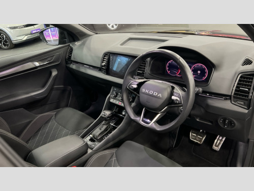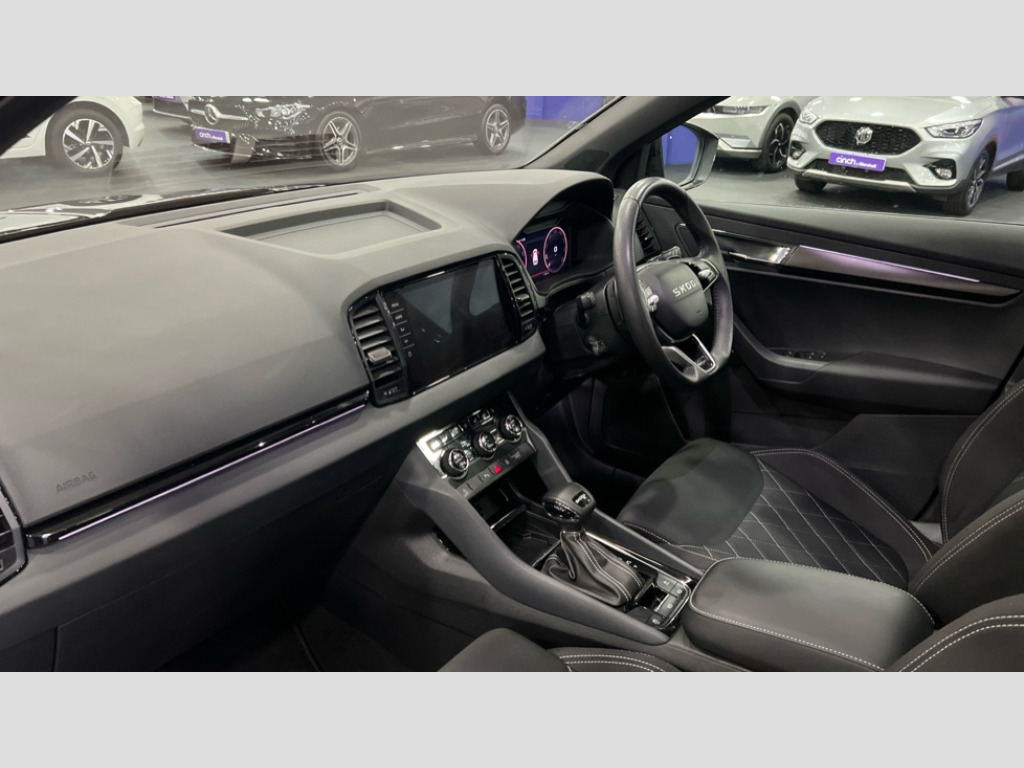Skoda Karoq 1.5 TSI Sportline Edition 5dr DSG Advanced driver attention and drowsiness monitor, Emergency services call system, Outside temperature gauge, Sensor for driver assistance systems, Service interval indicator, SmartLink wireless for Apple and wired for Android, Start/stop system with regenerative braking, Traffic sign recognition, USB C Port x 2 in front centre console, Virtual Cockpit - 10.25" digital display, Virtual pedal with electrically operated boot door, Wireless smartphone charging, DAB radio with Bluetooth, USB connection, Acoustic glass, Aero front windscreen wipers with intermittent function, Auto dimming rear view mirror with light and rain sensors, Black door mirrors, Black electric window control buttons, Black radiator grille, Black roof rails, Body colour door handles, Electric front and rear windows with child proof lock, Extended rear roof spoiler, Front door steps with SportLine logo, Heated rear windscreen, LED daytime running lights, LED rear lights with high functionality welcome effect and dynamic indicators, Light assistant (coming/leaving home/tunnel light), Panoramic sliding sunroof, Plastic scuff plates in door apertures, Privacy glass, Protective door side sills in body colour, Rear diffuser, Rear side wing doors, Rear window wiper with washer system and intermittent control, Safety reflectors on front doors, Skoda lettering on tailgate in black, Sportline badge on front fender, Sports front and rear bumpers, Third brake light, Unique dark chrome design logo on alloy wheels, 1.5 litre bottle holders in driver and front passenger door panels, 12V socket in boot, 12v socket in front centre armrest with storage compartment and rear air vents, 2 x Tablet holder, 3 rear height adjustable headrests, 3 seat bench in 2nd row, 3 spoke sports leather heated multifunction steering wheel with DSG paddles, 4 foldable roof handles with rear coat hooks, Black floor carpet, Cargo elements in boot, Chrome inner door handles, Foldable hooks in the boot, Front head restraints, Height adjustable front three point seats belts with tensioners, Height/reach adjust steering wheel, Ice scraper, Illuminated glovebox, Illuminated luggage compartment, Isofix child seat preparation for front passenger seat, Isofix child seat preparation outer rear, Manual lumbar support for front seats, Pen holder, Pollen filter, Rear backrest release from boot, Rear boot cover, Rear package tray, Rear reading lights, Rear seats fixed folding and divided 60:40, Rubbish bin door, Safety vest holder, Single front passenger seat, Skoda lettering on steering wheel, Sportline decorative inserts, Storage box in upper central dashboard closed, Sunvisors with illuminated vanity mirrors, Textile floor mats, Ticket holder, Titan black interior ceiling, Umbrella under passenger seat, Under passenger seat storage compartment, Columbus pack - Karoq, LED Interior lighting pack with Skoda welcome logo - Karoq, Light Pack - Karoq, Non Smokers pack, Performance pack - Karoq, Winter plus pack with heated front and rear seats - Karoq, Automatic door unlocking in case of crash, Automatic fuel cut off in case of crash, Driver airbag, Electronic parking brake with auto hold function, Emergency rear braking signal, ESC (incl. ABS+MSR+ASR+EDS+HBA+DSR+RBS+MKB), Front side airbags, Head airbags, Hill hold control, Knee airbags, Passenger airbag with switch-off function, Pedestrian monitor, Seatbelt reminder signalisation and pretensioner for all seats, Three point seatbelts rear, Two tone horn, Tyre pressure monitor, Alarm with interior monitoring, back up horn and tilt sensor with safe function, Electronic engine immobiliser, Keyless entry and start/stop, Remote central locking with 2 remote folding keys, Black air vent surround, Black centre console, carbon door decor, Satin black dashboard, Satin black door trim, 19" Sagittarius anthracite alloy wheels, Anti-theft wheel bolts protection, Breakdown and tool kit