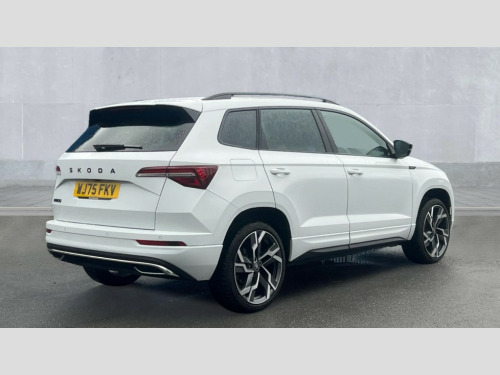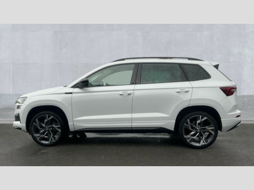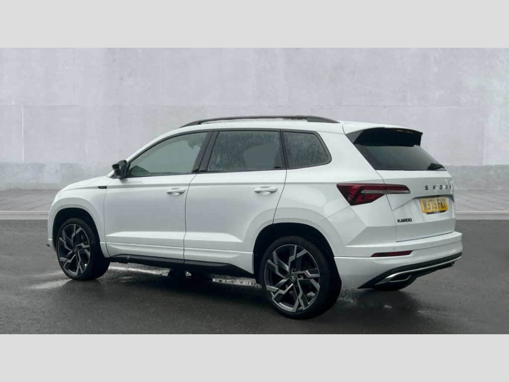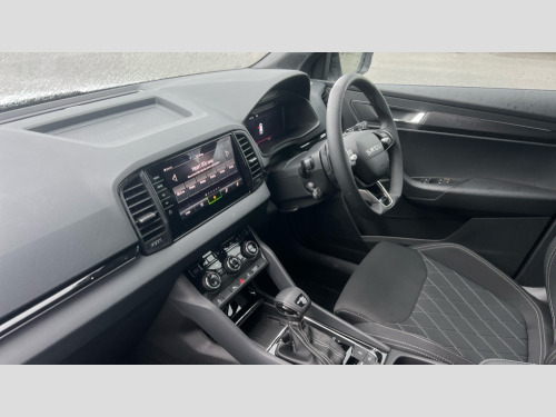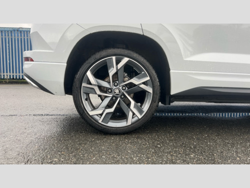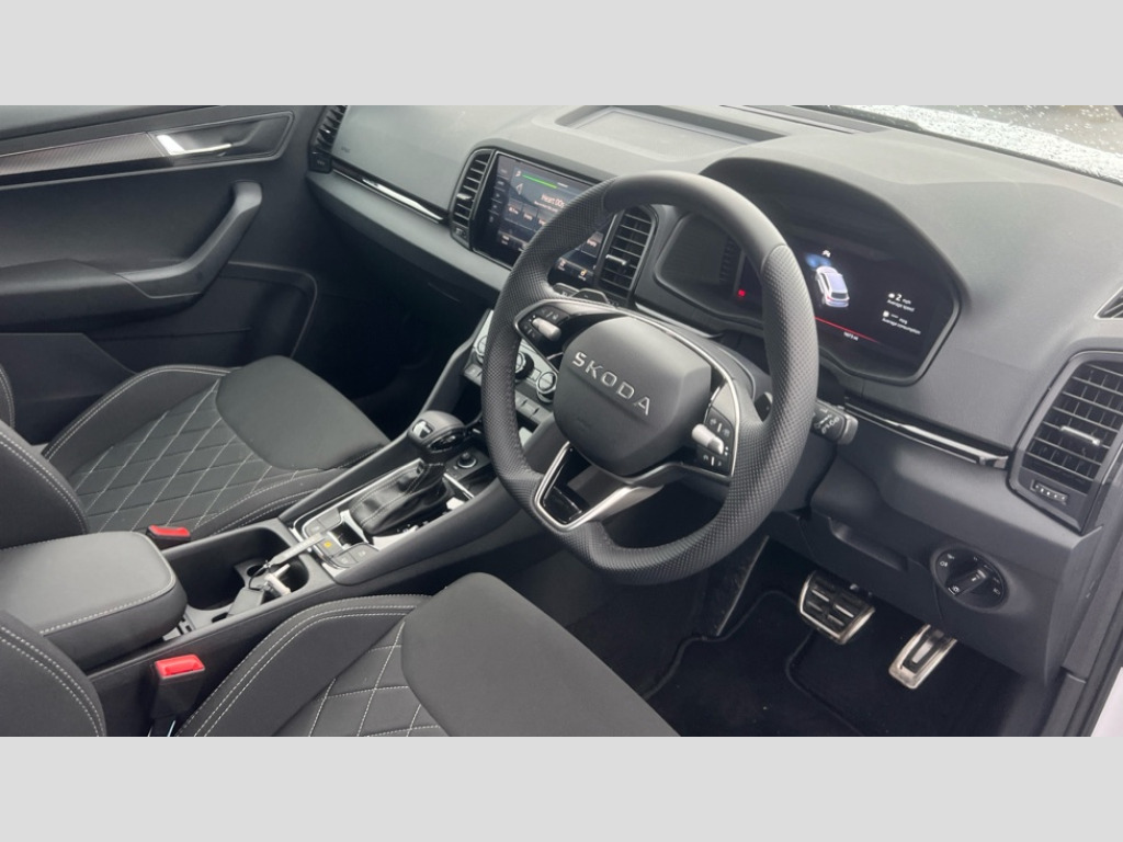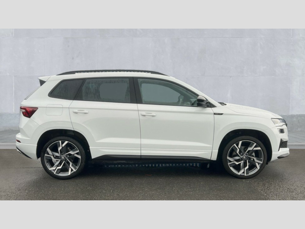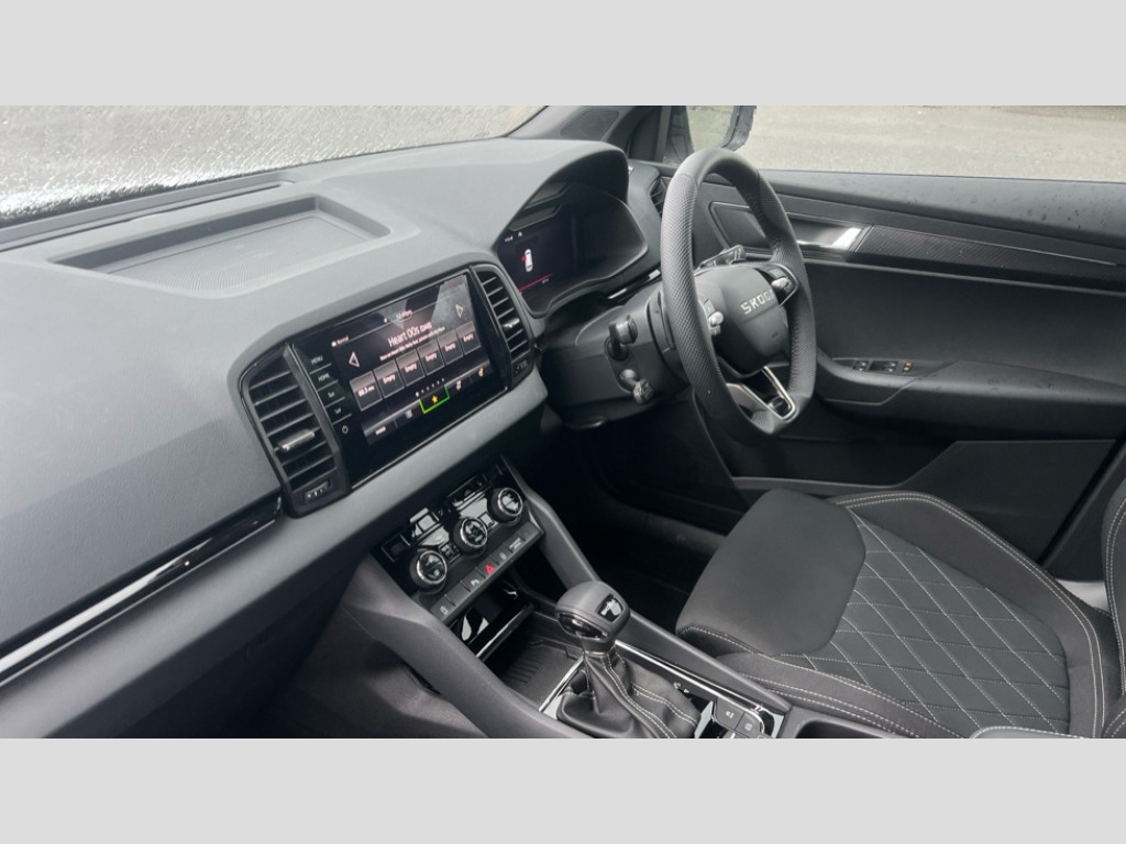 Skoda Karoq 1.5 TSI Sportline Edition 5dr DSG Advanced driver attention and drowsiness monitor, Emergency services call system, Outside temperature gauge, Sensor for driver assistance systems, Service interval indicator, SmartLink wireless for Apple and wired for Android, Start/stop system with regenerative braking, Traffic sign recognition, USB C Port x 2 in front centre console, Virtual Cockpit - 10.25" digital display, Virtual pedal with electrically operated boot door, Wireless smartphone charging, DAB radio with Bluetooth, USB connection, Acoustic glass, Aero front windscreen wipers with intermittent function, Auto dimming rear view mirror with light and rain sensors, Black door mirrors, Black electric window control buttons, Black radiator grille, Black roof rails, Body colour door handles, Electric front and rear windows with child proof lock, Extended rear roof spoiler, Front door steps with SportLine logo, Heated rear windscreen, LED daytime running lights, LED rear lights with high functionality welcome effect and dynamic indicators, Light assistant (coming/leaving home/tunnel light), Panoramic sliding sunroof, Plastic scuff plates in door apertures, Privacy glass, Protective door side sills in body colour, Rear diffuser, Rear side wing doors, Rear window wiper with washer system and intermittent control, Safety reflectors on front doors, Skoda lettering on tailgate in black, Sportline badge on front fender, Sports front and rear bumpers, Third brake light, Unique dark chrome design logo on alloy wheels, 1.5 litre bottle holders in driver and front passenger door panels, 12V socket in boot, 12v socket in front centre armrest with storage compartment and rear air vents, 2 x Tablet holder, 3 rear height adjustable headrests, 3 seat bench in 2nd row, 3 spoke sports leather heated multifunction steering wheel with DSG paddles, 4 foldable roof handles with rear coat hooks, Black floor carpet, Cargo elements in boot, Chrome inner door handles, Foldable hooks in the boot, Front head restraints, Height adjustable front three point seats belts with tensioners, Height/reach adjust steering wheel, Ice scraper, Illuminated glovebox, Illuminated luggage compartment, Isofix child seat preparation for front passenger seat, Isofix child seat preparation outer rear, Manual lumbar support for front seats, Pen holder, Pollen filter, Rear backrest release from boot, Rear boot cover, Rear package tray, Rear reading lights, Rear seats fixed folding and divided 60:40, Rubbish bin door, Safety vest holder, Single front passenger seat, Skoda lettering on steering wheel, Sportline decorative inserts, Storage box in upper central dashboard closed, Sunvisors with illuminated vanity mirrors, Textile floor mats, Ticket holder, Titan black interior ceiling, Umbrella under passenger seat, Under passenger seat storage compartment, Columbus pack - Karoq, LED Interior lighting pack with Skoda welcome logo - Karoq, Light Pack - Karoq, Non Smokers pack, Performance pack - Karoq, Winter plus pack with heated front and rear seats - Karoq, Automatic door unlocking in case of crash, Automatic fuel cut off in case of crash, Driver airbag, Electronic parking brake with auto hold function, Emergency rear braking signal, ESC (incl. ABS+MSR+ASR+EDS+HBA+DSR+RBS+MKB), Front side airbags, Head airbags, Hill hold control, Knee airbags, Passenger airbag with switch-off function, Pedestrian monitor, Power operated child safety locks, Seatbelt reminder signalisation and pretensioner for all seats, Three point seatbelts rear, Two tone horn, Tyre pressure monitor, Alarm with interior monitoring, back up horn and tilt sensor with safe function, Electronic engine immobiliser, Keyless entry and start/stop, Remote central locking with 2 remote folding keys, Black air vent surround, Black centre console, carbon door decor, Satin black dashboard, Satin black door trim, 19" Sagittarius anthracite alloy wheels, Anti-theft wheel bolts protection, Breakdown and tool kit