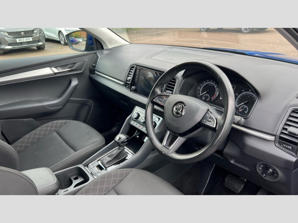 Skoda Karoq 1.6 TDI SE 5dr DSG Driver alert system, Driver fatigue sensor, Driver profile selection, Electro-mechanical PAS, Outside temperature gauge, Service interval indicator, Start/stop system with regenerative braking, Diesel particulate filter, DAB radio with Bluetooth, SD card slot, USB connection, Acoustic glass, Aero front windscreen wipers with intermittent function, Automatic headlight control system, Black electric window control buttons, Body colour door mirrors and handles, Body coloured bumpers, Electric front and rear windows with child proof lock, Electrically adjustable heated folding and auto dimming door mirrors, Heated rear windscreen, LED rear lights with high functionality, Light assistant (coming/leaving home/tunnel light), Privacy glass, Safety reflectors on front doors, Third brake light, 1.5 litre bottle holders in driver and front passenger door panels, 12V socket in boot, 12v socket in front centre armrest with storage compartment and rear air vents, 2 Folding hooks and nets in boot, 2 Front readings lights for driver and passenger, 3 rear height adjustable headrests, 4 foldable roof handles with rear coat hooks, 4 lashing points on luggage floor, Backrest release, Cargo elements in boot, Chrome inner door handles, Driver and passenger seats height adjust, Dual zone climate control, Folding tables on the front seat backrests, Front head restraints, Front seat and rear pockets, Height adjustable front three point seats belts with tensioners, Height/reach adjust steering wheel, Ice scraper, Illuminated and cooled glovebox, Illuminated luggage compartment, Isofix child seat preparation outer rear, Manual lumbar support for front seats, Net programme in boot, Pen holder, Pollen filter, Rear boot cover, Rear reading lights, Rear seats fixed folding and divided 60:40, Safety vest holder, Storage box in upper central dashboard closed, Sunvisors with illuminated vanity mirrors, Umbrella under passenger seat, Airbags - Front side, head, knee and curtain, Automatic door unlocking in case of crash, Automatic fuel cut off in case of crash, Driver airbag, Electronic parking brake with auto hold function, Emergency rear braking signal, ESC including ABS, MSR, ASR, EDS, HBA, DSR, RBS, MKB and traction control, Front assist radar scanning of the space in front of the car with automatic braking, Hill hold control, Passenger airbag with switch-off function, Pedestrian monitor, Seatbelt reminder signalisation and pretensioner for all seats, Three point seatbelts rear, Two tone horn, Tyre pressure display, Tyre pressure monitor, Alarm with interior monitoring, back up horn and tilt sensor with safe function, Electronic engine immobiliser, Remote central locking with 2 remote folding keys, Chrome framed air vents, Storage on wheel cover