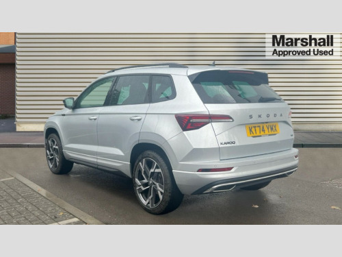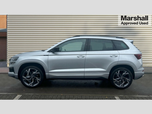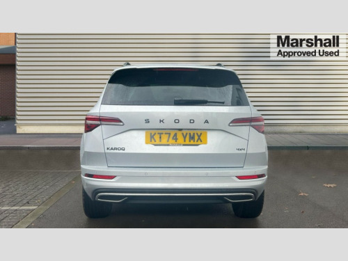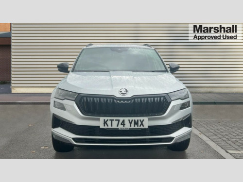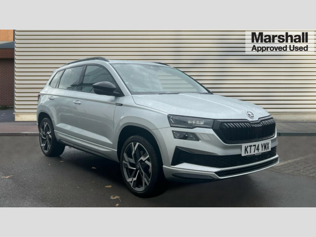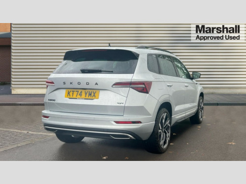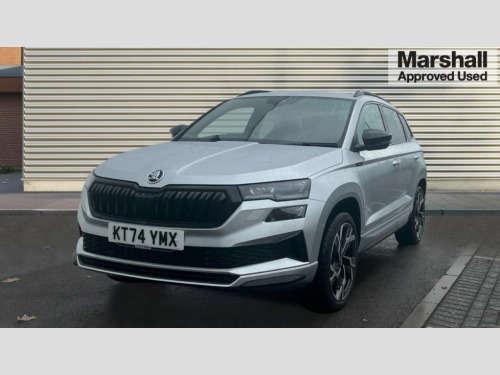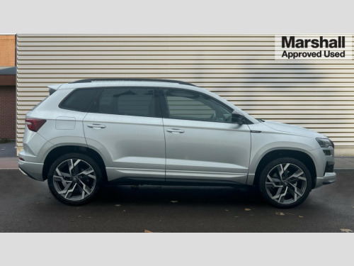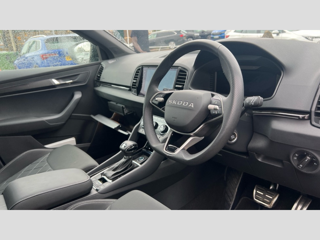 Skoda Karoq 2.0 TDI [150] Sportline 4x4 5dr DSG 8" Digital display, Advanced driver attention and drowsiness monitor, Emergency services call system, Outside temperature gauge, Sensor for driver assistance systems, Service interval indicator, SmartLink wireless for Apple and wired for Android, Start/stop system with regenerative braking, USB C Port x 2 in front centre console, Virtual Cockpit - 10.25" digital display, Virtual pedal with electrically operated boot door, Wireless smartphone charging, Diesel particulate filter, DAB radio with Bluetooth, USB connection, Acoustic glass, Aero front windscreen wipers with intermittent function, Auto dimming rear view mirror with light and rain sensors, Black door mirrors, Black electric window control buttons, Black radiator grille, Black roof rails, Body colour door handles, Electric front and rear windows with child proof lock, Front door steps with SportLine logo, Heated rear windscreen, LED daytime running lights, LED rear lights with high functionality welcome effect and dynamic indicators, Light assistant (coming/leaving home/tunnel light), Panoramic sliding sunroof, Plastic scuff plates in door apertures, Privacy glass, Protective door side sills in body colour, Rear diffuser, Rear side wing doors, Rear spoiler, Rear window wiper with washer system and intermittent control, Safety reflectors on front doors, Skoda lettering on tailgate in black, Sportline badge on front fender, Sportline decorative inserts with badging, Sports front and rear bumpers, Third brake light, 1.5 litre bottle holders in driver and front passenger door panels, 12V socket in boot, 12v socket in front centre armrest with storage compartment and rear air vents, 2 x Tablet holder, 3 rear height adjustable headrests, 3 seat bench in 2nd row, 3 spoke sports leather heated multifunction steering wheel with DSG paddles, 4 foldable roof handles with rear coat hooks, Black floor carpet, Black roof headlining, Chrome inner door handles, Foldable hooks in the boot, Front head restraints, Height adjustable front three point seats belts with tensioners, Height/reach adjust steering wheel, Ice scraper, Illuminated glovebox, Illuminated luggage compartment, Isofix child seat preparation for front passenger seat, Isofix child seat preparation outer rear, Manual lumbar support for front seats, Pen holder, Pollen filter, Rear boot cover, Rear reading lights, Rear seats fixed folding and divided 60:40, Rubbish bin door, Safety vest holder, Single front passenger seat, Storage box in upper central dashboard closed, Sunvisors with illuminated vanity mirrors, Textile floor mats, Ticket holder, Titan black interior ceiling, Umbrella under passenger seat, Under passenger seat storage compartment, LED Interior lighting pack with Skoda welcome logo - Karoq, Light Pack - Karoq, Non Smokers pack, Automatic door unlocking in case of crash, Automatic fuel cut off in case of crash, Driver airbag, Electronic parking brake with auto hold function, Emergency rear braking signal, ESC (incl. ABS+MSR+ASR+EDS+HBA+DSR+RBS+MKB), Front side airbags, Head airbags, Hill hold control, Knee airbags, Passenger airbag with switch-off function, Pedestrian monitor, Seatbelt reminder signalisation and pretensioner for all seats, Three point seatbelts rear, Two tone horn, Tyre pressure monitor, Alarm with interior monitoring, back up horn and tilt sensor with safe function, Electronic engine immobiliser, Keyless entry and start/stop, Remote central locking with 2 remote folding keys, Black air vent surround, Black centre console, carbon door decor, Satin black dashboard, Satin black door trim, 19" Sagittarius anthracite alloy wheels, Anti-theft wheel bolts protection, Breakdown and tool kit