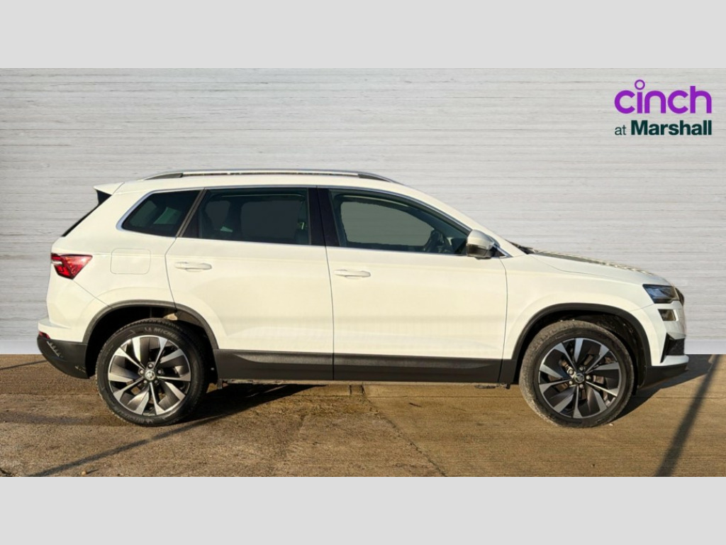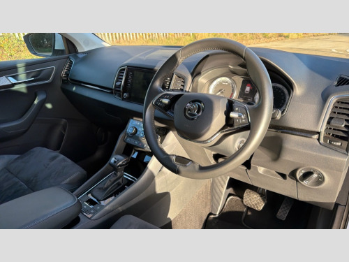 Skoda Karoq 2.0 TDI SE L 5dr DSG Care connect, Drive mode selector, Driver fatigue sensor, Electro-mechanical PAS, Emergency services call system, Multifunction colour trip computer, Outside temperature gauge, Service interval indicator, SmartLink wireless for Apple and wired for Android, Start/stop system with regenerative braking, USB C Port x 2 in front centre console, Diesel particulate filter, 8 Speakers, DAB radio with Bluetooth, USB connection, Acoustic glass, Aero front windscreen wipers with intermittent function, Auto dimming rear view mirror with light and rain sensors, Automatic headlight control system, Black electric window control buttons, Body colour door mirrors and handles, Body coloured bumpers, Electric front and rear windows with child proof lock, Electrically adjustable heated folding and auto dimming door mirrors, Heated rear windscreen, LED daytime running lights, LED Headlights, LED rear lights with high functionality welcome effect and dynamic indicators, Light assistant (coming/leaving home/tunnel light), Privacy glass, Rear side wing doors, Rear spoiler, Rear wiper, Safety reflectors on front doors, Third brake light, 1.5 litre bottle holders in driver and front passenger door panels, 12V socket in boot, 12v socket in front centre armrest with storage compartment and rear air vents, 2 Folding hooks and nets in boot, 2 spoke leather heated multifunction steering wheel with DSG paddles, 2 x Tablet holder, 3 rear height adjustable headrests, 3 seat bench in 2nd row, 4 foldable roof handles with rear coat hooks, Black floor carpet, Chrome inner door handles, Decorative door sills with KAROQ badging, Double sided boot floor, Foldable hooks in the boot, Folding tables on the front seat backrests, Front head restraints, Height adjustable driver and passenger seat, Height adjustable front three point seats belts with tensioners, Height/reach adjust steering wheel, Ice scraper, Illuminated and cooled glovebox, Illuminated luggage compartment, Interior noise suppression, Isofix child seat preparation for front passenger seat, Isofix child seat preparation outer rear, Manual lumbar support for front seats, Pen holder, Pollen filter, Rear boot cover, Rear reading lights, Retractable parcel shelf attachable to tailgate, Rubbish bin door, Safety vest holder, Single front passenger seat, Storage box in upper central dashboard closed, Sunvisors with illuminated vanity mirrors, Textile floor mats, Umbrella under passenger seat, VarioFlex seats with standard rear seat release, Chrome roof rails + chrome pack - Karoq, Parking pack - Karoq, Airbags - Front side, head, knee and curtain, Automatic door unlocking in case of crash, Automatic fuel cut off in case of crash, Child locks on rear doors, Driver airbag, Electronic parking brake with auto hold function, Emergency rear braking signal, ESC including ABS, MSR, ASR, EDS, HBA, DSR, RBS, MKB and traction control, Front assist radar scanning of the space in front of the car with automatic braking, Hill hold control, Passenger airbag with switch-off function, Pedestrian monitor, Seatbelt reminder signalisation and pretensioner for all seats, Three point seatbelts rear, Two tone horn, Tyre pressure display, Tyre pressure monitor, Alarm with interior monitoring, back up horn and tilt sensor with safe function, Electronic engine immobiliser, Keyless entry and start/stop system with SAFE system, Remote central locking with 2 remote folding keys, Chrome framed air vents, 18" Miran alloy wheels in black, Anti-theft wheel bolts protection, Storage on wheel cover