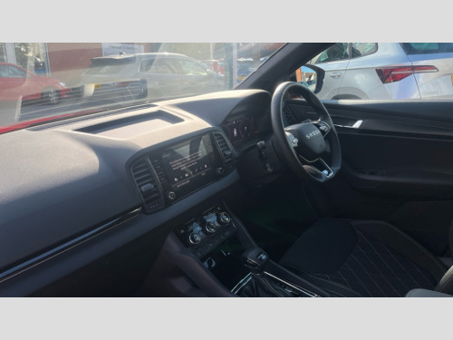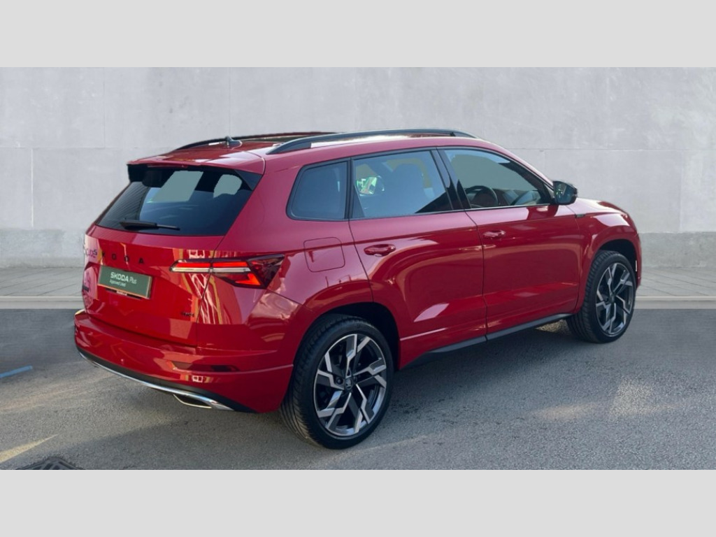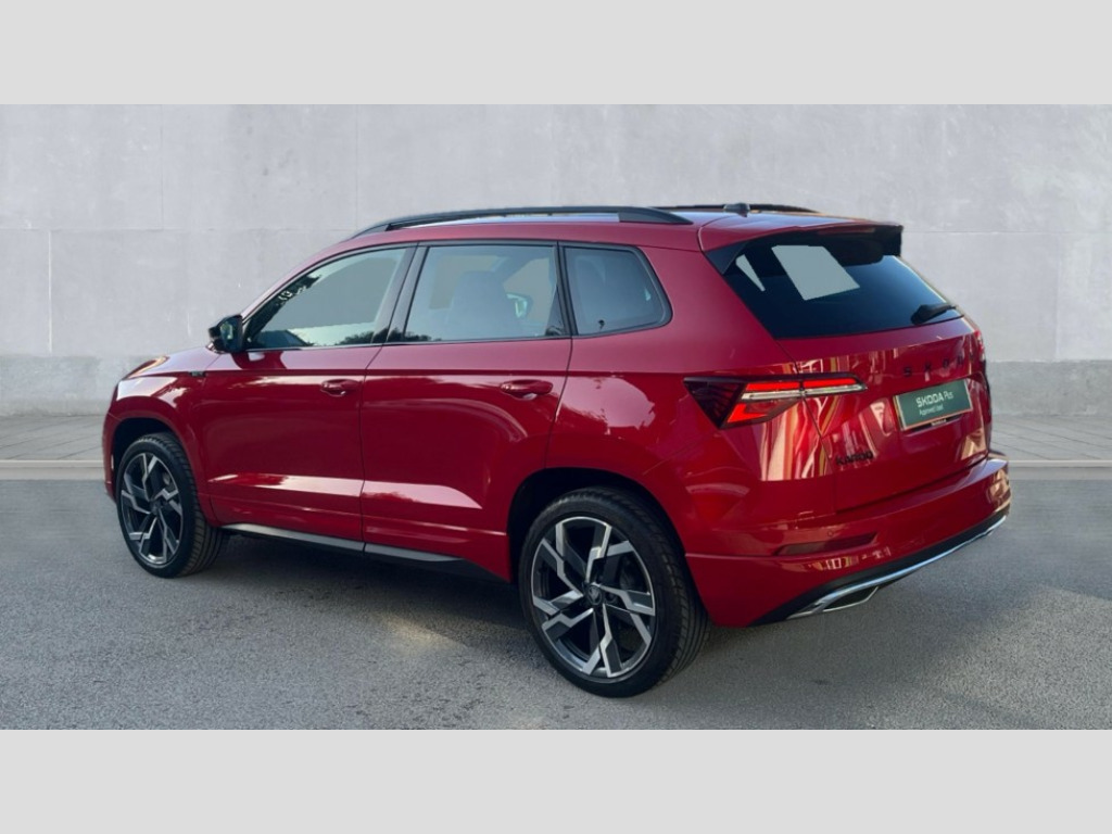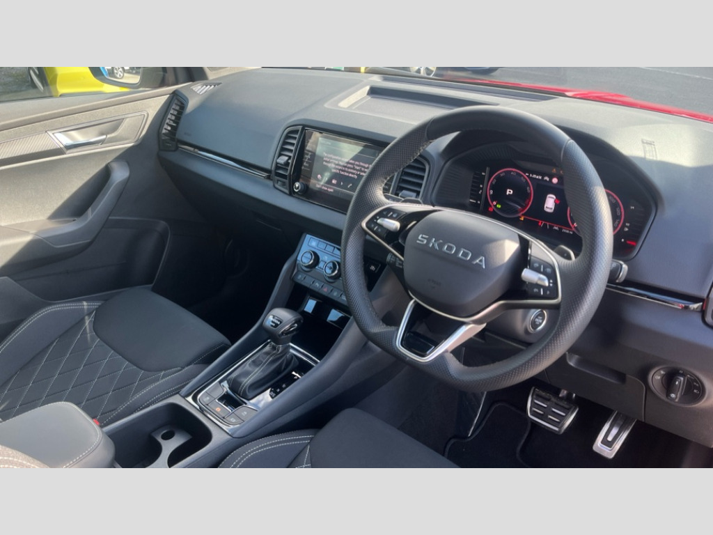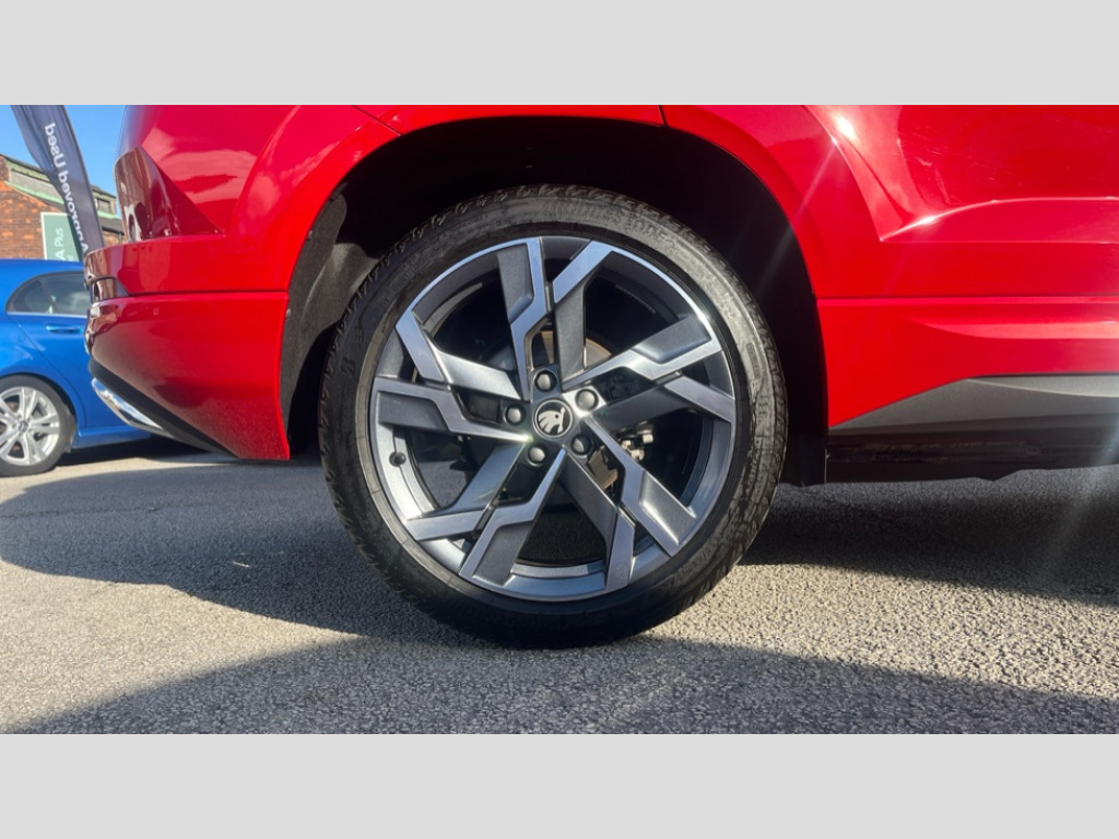 Black styling 8" Digital display, Advanced driver attention and drowsiness monitor, Emergency services call system, Outside temperature gauge, Sensor for driver assistance systems, Service interval indicator, SmartLink wireless for Apple and wired for Android, Start/stop system with regenerative braking, USB C Port x 2 in front centre console, Virtual Cockpit - 10.25" digital display, Virtual pedal with electrically operated boot door, Wireless smartphone charging, DAB radio with Bluetooth, USB connection, Acoustic glass, Aero front windscreen wipers with intermittent function, Auto dimming rear view mirror with light and rain sensors, Black door mirrors, Black electric window control buttons, Black radiator grille, Black roof rails, Body colour door handles, Electric front and rear windows with child proof lock, Front door steps with SportLine logo, Heated rear windscreen, LED daytime running lights, LED rear lights with high functionality welcome effect and dynamic indicators, Light assistant (coming/leaving home/tunnel light), Panoramic sliding sunroof, Plastic scuff plates in door apertures, Privacy glass, Protective door side sills in body colour, Rear diffuser, Rear side wing doors, Rear spoiler, Rear window wiper with washer system and intermittent control, Safety reflectors on front doors, Skoda lettering on tailgate in black, Sportline badge on front fender, Sportline decorative inserts with badging, Sports front and rear bumpers, Third brake light, 1.5 litre bottle holders in driver and front passenger door panels, 12V socket in boot, 12v socket in front centre armrest with storage compartment and rear air vents, 2 x Tablet holder, 3 rear height adjustable headrests, 3 seat bench in 2nd row, 3 spoke sports leather heated multifunction steering wheel with DSG paddles, 4 foldable roof handles with rear coat hooks, Black floor carpet, Black roof headlining, Chrome inner door handles, Foldable hooks in the boot, Front head restraints, Height adjustable front three point seats belts with tensioners, Height/reach adjust steering wheel, Ice scraper, Illuminated glovebox, Illuminated luggage compartment, Isofix child seat preparation for front passenger seat, Isofix child seat preparation outer rear, Manual lumbar support for front seats, Pen holder, Pollen filter, Rear boot cover, Rear reading lights, Rear seats fixed folding and divided 60:40, Rubbish bin door, Safety vest holder, Single front passenger seat, Storage box in upper central dashboard closed, Sunvisors with illuminated vanity mirrors, Textile floor mats, Ticket holder, Titan black interior ceiling, Umbrella under passenger seat, Under passenger seat storage compartment, LED Interior lighting pack with Skoda welcome logo - Karoq, Light Pack - Karoq, Non Smokers pack, Automatic door unlocking in case of crash, Automatic fuel cut off in case of crash, Driver airbag, Electronic parking brake with auto hold function, Emergency rear braking signal, ESC (incl. ABS+MSR+ASR+EDS+HBA+DSR+RBS+MKB), Front side airbags, Head airbags, Hill hold control, Knee airbags, Passenger airbag with switch-off function, Pedestrian monitor, Seatbelt reminder signalisation and pretensioner for all seats, Three point seatbelts rear, Two tone horn, Tyre pressure monitor, Alarm with interior monitoring, back up horn and tilt sensor with safe function, Electronic engine immobiliser, Keyless entry and start/stop, Remote central locking with 2 remote folding keys, Black air vent surround, Black centre console, carbon door decor, Satin black dashboard, Satin black door trim, 19" Sagittarius anthracite alloy wheels, Anti-theft wheel bolts protection, Breakdown and tool kit