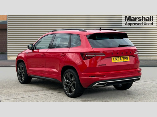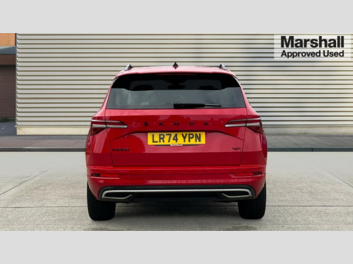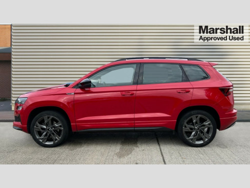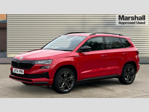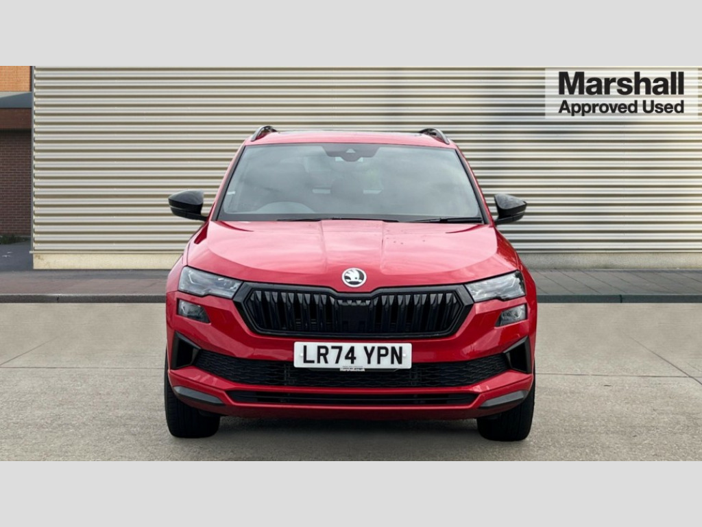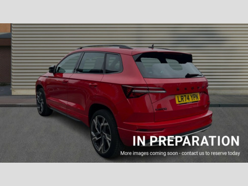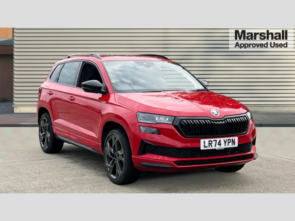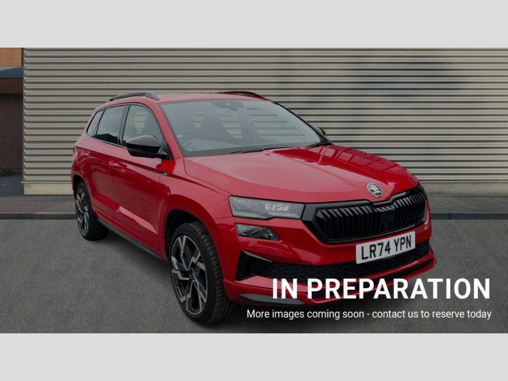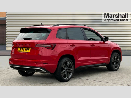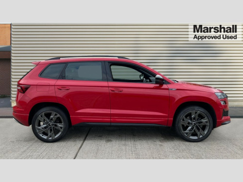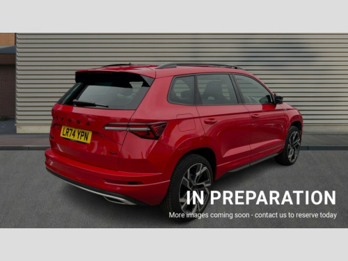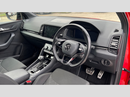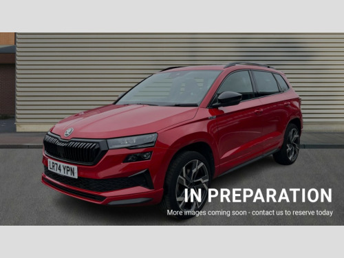 Skoda Karoq 2.0 TSI Sportline 4x4 5dr DSG 8" Digital display, Advanced driver attention and drowsiness monitor, Emergency services call system, Outside temperature gauge, Sensor for driver assistance systems, Service interval indicator, SmartLink wireless for Apple and wired for Android, Start/stop system with regenerative braking, USB C Port x 2 in front centre console, Virtual Cockpit - 10.25" digital display, Virtual pedal with electrically operated boot door, Wireless smartphone charging, DAB radio with Bluetooth, USB connection, Acoustic glass, Aero front windscreen wipers with intermittent function, Auto dimming rear view mirror with light and rain sensors, Black door mirrors, Black electric window control buttons, Black radiator grille, Black roof rails, Body colour door handles, Electric front and rear windows with child proof lock, Front door steps with SportLine logo, Heated rear windscreen, LED daytime running lights, LED rear lights with high functionality welcome effect and dynamic indicators, Light assistant (coming/leaving home/tunnel light), Panoramic sliding sunroof, Plastic scuff plates in door apertures, Privacy glass, Protective door side sills in body colour, Rear diffuser, Rear side wing doors, Rear spoiler, Rear window wiper with washer system and intermittent control, Safety reflectors on front doors, Skoda lettering on tailgate in black, Sportline badge on front fender, Sportline decorative inserts with badging, Sports front and rear bumpers, Third brake light, 1.5 litre bottle holders in driver and front passenger door panels, 12V socket in boot, 12v socket in front centre armrest with storage compartment and rear air vents, 2 x Tablet holder, 3 rear height adjustable headrests, 3 seat bench in 2nd row, 3 spoke sports leather heated multifunction steering wheel with DSG paddles, 4 foldable roof handles with rear coat hooks, Black floor carpet, Black roof headlining, Chrome inner door handles, Foldable hooks in the boot, Front head restraints, Height adjustable front three point seats belts with tensioners, Height/reach adjust steering wheel, Ice scraper, Illuminated glovebox, Illuminated luggage compartment, Isofix child seat preparation for front passenger seat, Isofix child seat preparation outer rear, Manual lumbar support for front seats, Pen holder, Pollen filter, Rear boot cover, Rear reading lights, Rear seats fixed folding and divided 60:40, Rubbish bin door, Safety vest holder, Single front passenger seat, Storage box in upper central dashboard closed, Sunvisors with illuminated vanity mirrors, Textile floor mats, Ticket holder, Titan black interior ceiling, Umbrella under passenger seat, Under passenger seat storage compartment, LED Interior lighting pack with Skoda welcome logo - Karoq, Light Pack - Karoq, Non Smokers pack, Automatic door unlocking in case of crash, Automatic fuel cut off in case of crash, Driver airbag, Electronic parking brake with auto hold function, Emergency rear braking signal, ESC (incl. ABS+MSR+ASR+EDS+HBA+DSR+RBS+MKB), Front side airbags, Head airbags, Hill hold control, Knee airbags, Passenger airbag with switch-off function, Pedestrian monitor, Seatbelt reminder signalisation and pretensioner for all seats, Three point seatbelts rear, Two tone horn, Tyre pressure monitor, Alarm with interior monitoring, back up horn and tilt sensor with safe function, Electronic engine immobiliser, Keyless entry and start/stop, Remote central locking with 2 remote folding keys, Black air vent surround, Black centre console, carbon door decor, Satin black dashboard, Satin black door trim, 19" Sagittarius anthracite alloy wheels, Anti-theft wheel bolts protection, Breakdown and tool kit