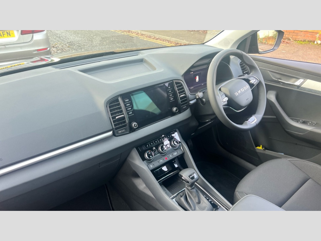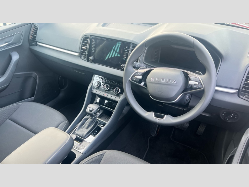 Skoda Karoq 1.5 TSI SE Edition 5dr DSG Advanced driver attention and drowsiness monitor, Amundsen navigation system with 8" touchscreen display and integrated WLAN and web radio, Electro-mechanical PAS, Emergency services call system, Lane assist, Outside temperature gauge, Sensor for driver assistance systems, Service interval indicator, SmartLink wireless for Apple and wired for Android, Start/stop system with regenerative braking, Traffic sign recognition, USB C Port x 2 in front centre console, Virtual Cockpit - 10.25" digital display, Wireless smartphone charging, 8 Speakers, DAB radio with Bluetooth, USB connection, Acoustic glass, Aero front windscreen wipers with intermittent function, Auto dimming rear view mirror with light and rain sensors, Black electric window control buttons, Body colour door mirrors and handles, Electric front and rear windows with child proof lock, Electrically adjustable heated folding and auto dimming door mirrors, Front fog lights, Headlight range control, Heated rear windscreen, LED daytime running lights, LED Headlights, LED rear lights with high functionality welcome effect and dynamic indicators, Light assistant (coming/leaving home/tunnel light), Plastic scuff plates in door apertures, Privacy glass, Rear side wing doors, Rear window wiper with washer system and intermittent control, Safety reflectors on front doors, Third brake light, Unique dark chrome design logo on alloy wheels, 1.5 litre bottle holders in driver and front passenger door panels, 12V socket in boot, 12v socket in front centre armrest with storage compartment and rear air vents, 2 spoke leather heated multifunction steering wheel with DSG paddles, 2 x Tablet holder, 3 rear height adjustable headrests, 3 seat bench in 2nd row, 4 foldable roof handles with rear coat hooks, Black floor carpet, Cargo elements in boot, Chrome inner door handles, Driver/front passenger reading lights, Foldable hooks in the boot, Folding tables on the front seat backrests, Front head restraints, Height adjustable driver and passenger seat, Height adjustable front three point seats belts with tensioners, Height/reach adjust steering wheel, Ice scraper, Illuminated glovebox, Illuminated luggage compartment, Interior noise suppression, Isofix child seat preparation for front passenger seat, Isofix child seat preparation outer rear, Loft fabric upholstery, Manual lumbar support for front seats, Pearl grey interior ceiling, Pen holder, Pollen filter, Rear boot cover, Rear package tray, Rear reading lights, Rubbish bin door, Safety vest holder, Single front passenger seat, Skoda lettering on steering wheel, Storage box in upper central dashboard closed, Sunvisors with illuminated vanity mirrors, Textile floor mats, Ticket holder, Umbrella under passenger seat, Under passenger seat storage compartment, Non Smokers pack, Parking pack - Karoq, Winter pack with heated front seats - Karoq, Automatic door unlocking in case of crash, Automatic fuel cut off in case of crash, Driver airbag, Electronic parking brake with auto hold function, Emergency rear braking signal, ESC (incl. ABS+MSR+ASR+EDS+HBA+DSR+RBS+MKB), Front assist, Front side airbags, Head airbags, Hill hold control, Knee airbags, Passenger airbag with switch-off function, Pedestrian monitor, Power operated child safety locks, Seatbelt reminder signalisation and pretensioner for all seats, Three point seatbelts rear, Two tone horn, Tyre pressure monitor, Alarm with interior monitoring, back up horn and tilt sensor with safe function, Electronic engine immobiliser, Keyless entry and start/stop, Remote central locking with 2 remote folding keys, Anodized cross door decor, Black centre console, Chrome framed air vents, Satin black dashboard, Satin black door trim, Anti-theft wheel bolts protection, Breakdown and tool kit