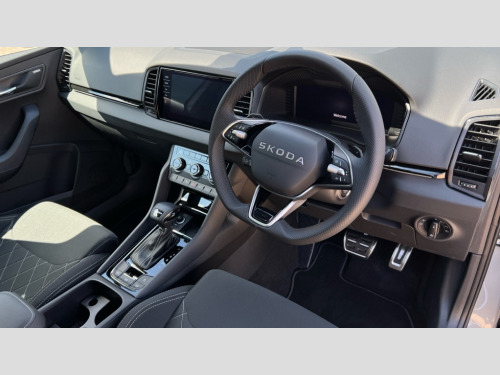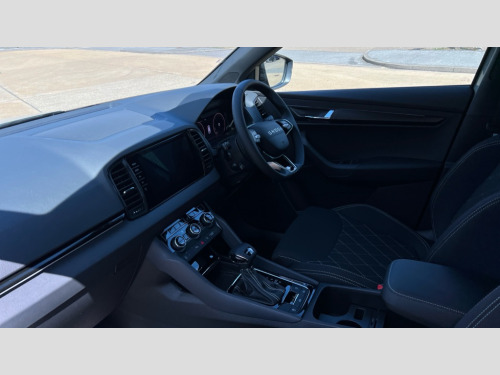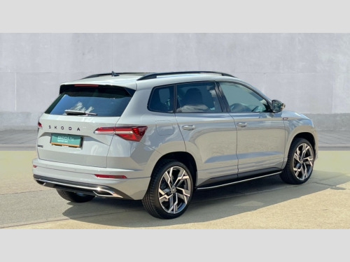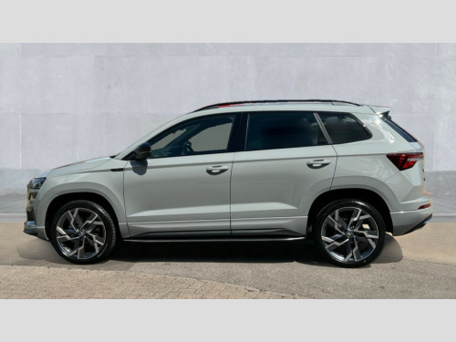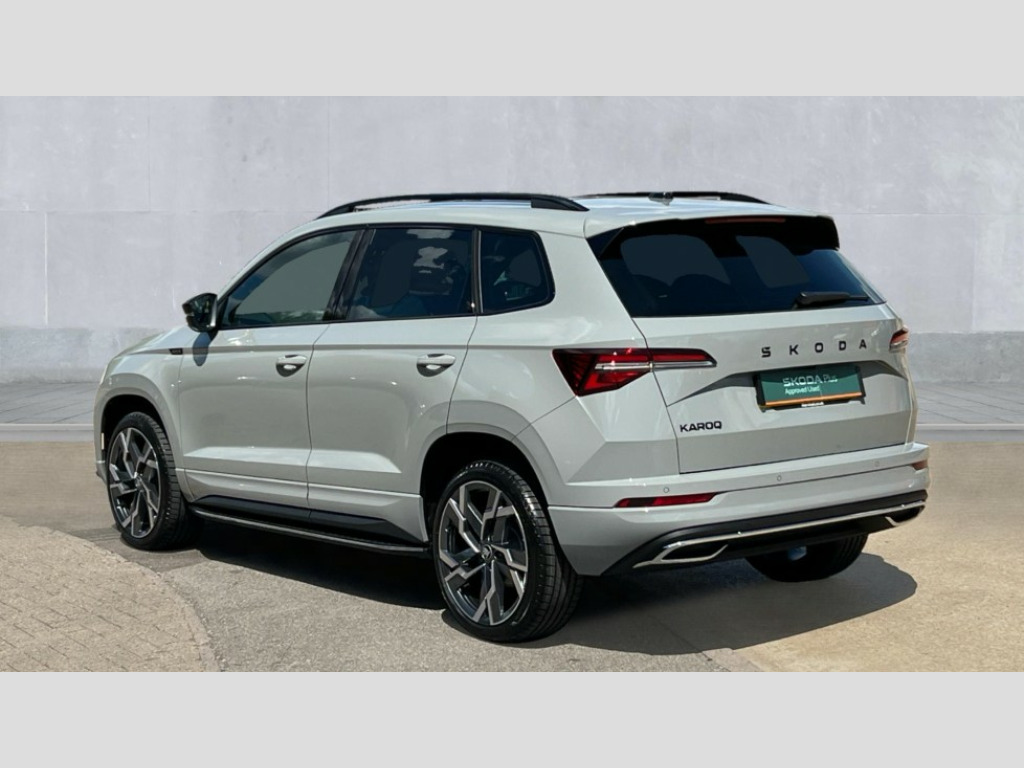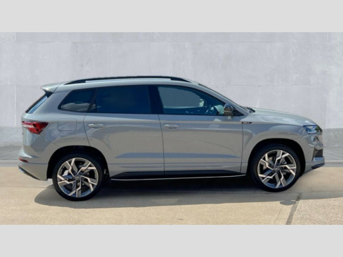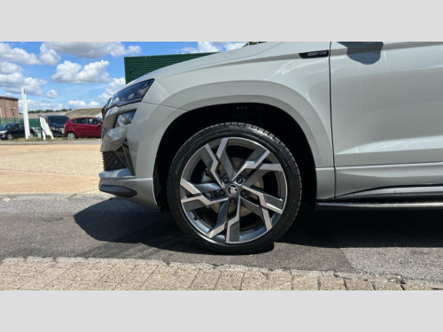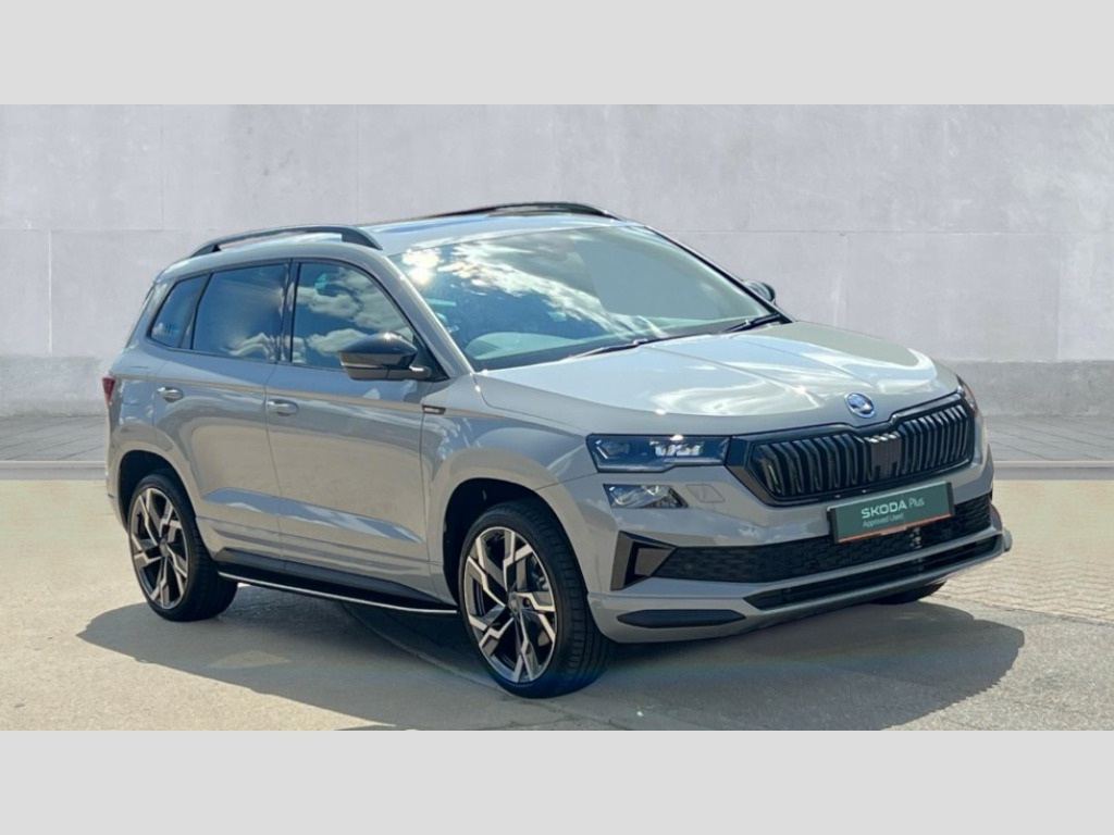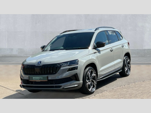 Skoda Karoq 1.5 TSI Sportline Edition 5dr DSG Advanced driver attention and drowsiness monitor, Emergency services call system, Outside temperature gauge, Sensor for driver assistance systems, Service interval indicator, SmartLink wireless for Apple and wired for Android, Start/stop system with regenerative braking, Traffic sign recognition, USB C Port x 2 in front centre console, Virtual Cockpit - 10.25" digital display, Virtual pedal with electrically operated boot door, Wireless smartphone charging, DAB radio with Bluetooth, USB connection, Acoustic glass, Aero front windscreen wipers with intermittent function, Auto dimming rear view mirror with light and rain sensors, Black door mirrors, Black electric window control buttons, Black radiator grille, Black roof rails, Body colour door handles, Electric front and rear windows with child proof lock, Extended rear roof spoiler, Front door steps with SportLine logo, Heated rear windscreen, LED daytime running lights, LED rear lights with high functionality welcome effect and dynamic indicators, Light assistant (coming/leaving home/tunnel light), Panoramic sliding sunroof, Plastic scuff plates in door apertures, Privacy glass, Protective door side sills in body colour, Rear diffuser, Rear side wing doors, Rear window wiper with washer system and intermittent control, Safety reflectors on front doors, Skoda lettering on tailgate in black, Sportline badge on front fender, Sports front and rear bumpers, Third brake light, Unique dark chrome design logo on alloy wheels, 1.5 litre bottle holders in driver and front passenger door panels, 12V socket in boot, 12v socket in front centre armrest with storage compartment and rear air vents, 2 x Tablet holder, 3 rear height adjustable headrests, 3 seat bench in 2nd row, 3 spoke sports leather heated multifunction steering wheel with DSG paddles, 4 foldable roof handles with rear coat hooks, Black floor carpet, Cargo elements in boot, Chrome inner door handles, Foldable hooks in the boot, Front head restraints, Height adjustable front three point seats belts with tensioners, Height/reach adjust steering wheel, Ice scraper, Illuminated glovebox, Illuminated luggage compartment, Isofix child seat preparation for front passenger seat, Isofix child seat preparation outer rear, Manual lumbar support for front seats, Pen holder, Pollen filter, Rear backrest release from boot, Rear boot cover, Rear package tray, Rear reading lights, Rear seats fixed folding and divided 60:40, Rubbish bin door, Safety vest holder, Single front passenger seat, Skoda lettering on steering wheel, Sportline decorative inserts, Storage box in upper central dashboard closed, Sunvisors with illuminated vanity mirrors, Textile floor mats, Ticket holder, Titan black interior ceiling, Umbrella under passenger seat, Under passenger seat storage compartment, Columbus pack - Karoq, LED Interior lighting pack with Skoda welcome logo - Karoq, Light Pack - Karoq, Non Smokers pack, Performance pack - Karoq, Winter plus pack with heated front and rear seats - Karoq, Automatic door unlocking in case of crash, Automatic fuel cut off in case of crash, Driver airbag, Electronic parking brake with auto hold function, Emergency rear braking signal, ESC (incl. ABS+MSR+ASR+EDS+HBA+DSR+RBS+MKB), Front side airbags, Head airbags, Hill hold control, Knee airbags, Passenger airbag with switch-off function, Pedestrian monitor, Seatbelt reminder signalisation and pretensioner for all seats, Three point seatbelts rear, Two tone horn, Tyre pressure monitor, Alarm with interior monitoring, back up horn and tilt sensor with safe function, Electronic engine immobiliser, Keyless entry and start/stop, Remote central locking with 2 remote folding keys, Black air vent surround, Black centre console, carbon door decor, Satin black dashboard, Satin black door trim, 19" Sagittarius anthracite alloy wheels, Anti-theft wheel bolts protection, Breakdown and tool kit