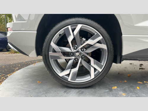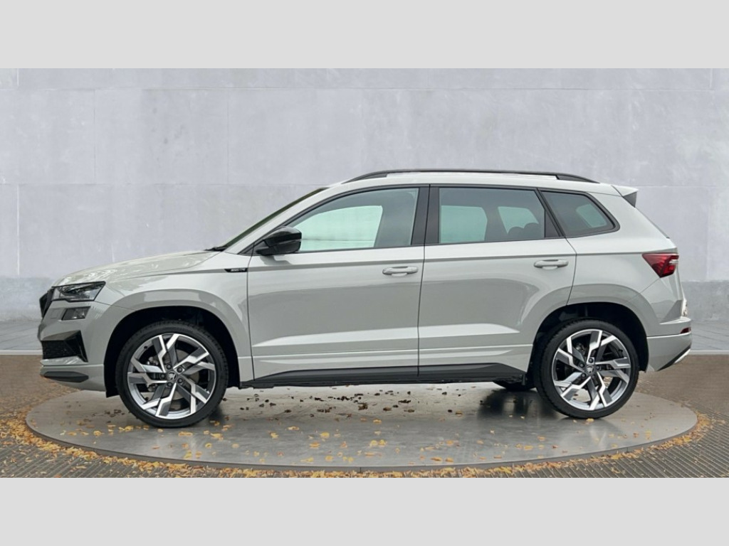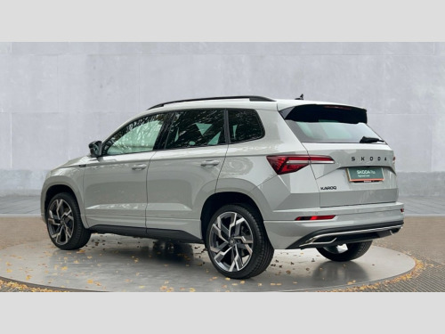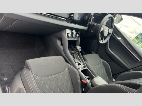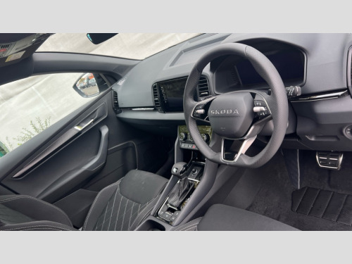 Skoda Karoq 1.5 TSI Sportline Edition 5dr DSG Advanced driver attention and drowsiness monitor, Emergency services call system, Outside temperature gauge, Sensor for driver assistance systems, Service interval indicator, SmartLink wireless for Apple and wired for Android, Start/stop system with regenerative braking, Traffic sign recognition, USB C Port x 2 in front centre console, Virtual Cockpit - 10.25" digital display, Virtual pedal with electrically operated boot door, Wireless smartphone charging, DAB radio with Bluetooth, USB connection, Acoustic glass, Aero front windscreen wipers with intermittent function, Auto dimming rear view mirror with light and rain sensors, Black door mirrors, Black electric window control buttons, Black radiator grille, Black roof rails, Body colour door handles, Electric front and rear windows with child proof lock, Extended rear roof spoiler, Front door steps with SportLine logo, Heated rear windscreen, LED daytime running lights, LED rear lights with high functionality welcome effect and dynamic indicators, Light assistant (coming/leaving home/tunnel light), Panoramic sliding sunroof, Plastic scuff plates in door apertures, Privacy glass, Protective door side sills in body colour, Rear diffuser, Rear side wing doors, Rear window wiper with washer system and intermittent control, Safety reflectors on front doors, Skoda lettering on tailgate in black, Sportline badge on front fender, Sports front and rear bumpers, Third brake light, Unique dark chrome design logo on alloy wheels, 1.5 litre bottle holders in driver and front passenger door panels, 12V socket in boot, 12v socket in front centre armrest with storage compartment and rear air vents, 2 x Tablet holder, 3 rear height adjustable headrests, 3 seat bench in 2nd row, 3 spoke sports leather heated multifunction steering wheel with DSG paddles, 4 foldable roof handles with rear coat hooks, Black floor carpet, Cargo elements in boot, Chrome inner door handles, Foldable hooks in the boot, Front head restraints, Height adjustable front three point seats belts with tensioners, Height/reach adjust steering wheel, Ice scraper, Illuminated glovebox, Illuminated luggage compartment, Isofix child seat preparation for front passenger seat, Isofix child seat preparation outer rear, Manual lumbar support for front seats, Pen holder, Pollen filter, Rear backrest release from boot, Rear boot cover, Rear package tray, Rear reading lights, Rear seats fixed folding and divided 60:40, Rubbish bin door, Safety vest holder, Single front passenger seat, Skoda lettering on steering wheel, Sportline decorative inserts, Storage box in upper central dashboard closed, Sunvisors with illuminated vanity mirrors, Textile floor mats, Ticket holder, Titan black interior ceiling, Umbrella under passenger seat, Under passenger seat storage compartment, Columbus pack - Karoq, LED Interior lighting pack with Skoda welcome logo - Karoq, Light Pack - Karoq, Non Smokers pack, Performance pack - Karoq, Winter plus pack with heated front and rear seats - Karoq, Automatic door unlocking in case of crash, Automatic fuel cut off in case of crash, Driver airbag, Electronic parking brake with auto hold function, Emergency rear braking signal, ESC (incl. ABS+MSR+ASR+EDS+HBA+DSR+RBS+MKB), Front side airbags, Head airbags, Hill hold control, Knee airbags, Passenger airbag with switch-off function, Pedestrian monitor, Power operated child safety locks, Seatbelt reminder signalisation and pretensioner for all seats, Three point seatbelts rear, Two tone horn, Tyre pressure monitor, Alarm with interior monitoring, back up horn and tilt sensor with safe function, Electronic engine immobiliser, Keyless entry and start/stop, Remote central locking with 2 remote folding keys, Black air vent surround, Black centre console, carbon door decor, Satin black dashboard, Satin black door trim, 19" Sagittarius anthracite alloy wheels, Anti-theft wheel bolts protection, Breakdown and tool kit