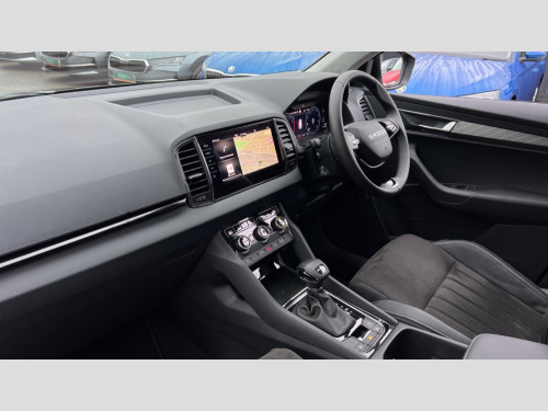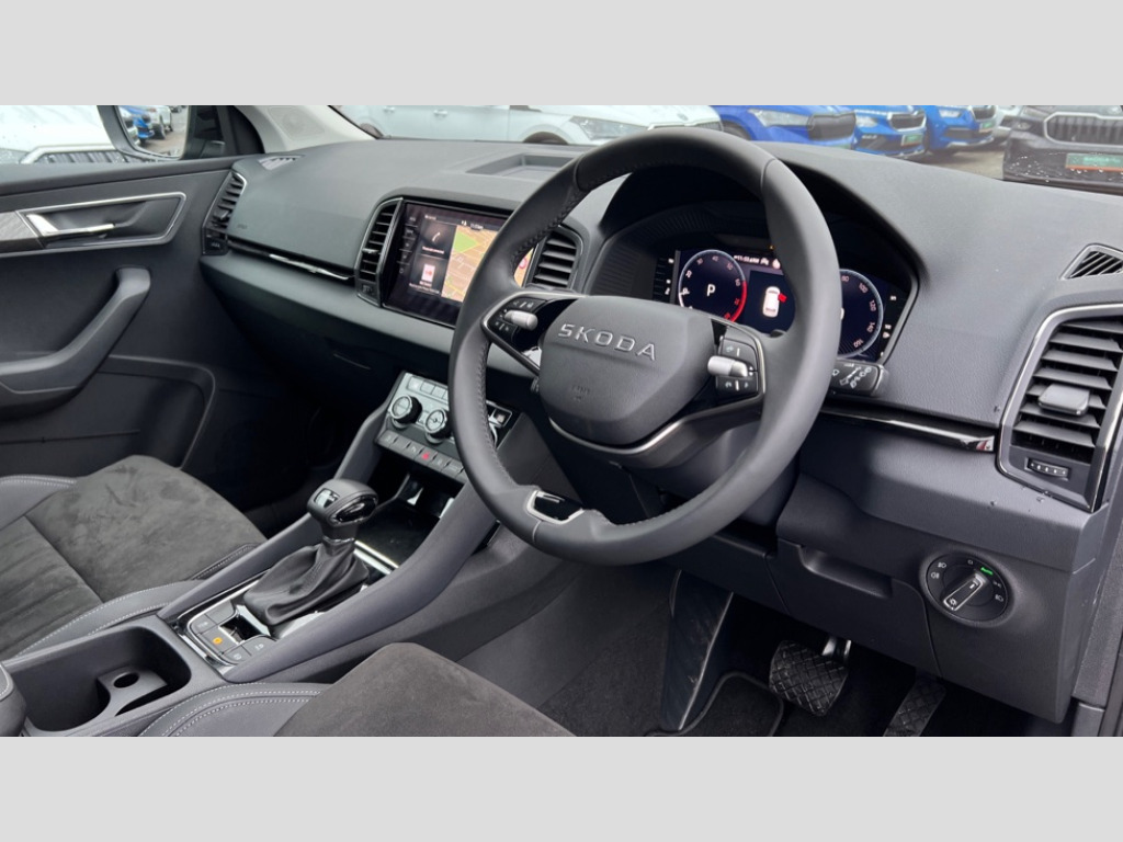 Skoda Karoq 1.5 TSI SE L Edition 5dr DSG Advanced driver attention and drowsiness monitor, Drive Mode Selection including ECO function, Electro-mechanical PAS, Emergency services call system, Outside temperature gauge, Sensor for driver assistance systems, Service interval indicator, SmartLink wireless for Apple and wired for Android, Start/stop system with regenerative braking, Traffic sign recognition, USB C Port x 2 in front centre console, Virtual Cockpit - 10.25" digital display, Virtual pedal with electrically operated boot door, Wireless smartphone charging, DAB radio with Bluetooth, USB connection, Acoustic glass, Aero front windscreen wipers with intermittent function, Auto dimming rear view mirror with light and rain sensors, Black electric window control buttons, Body colour door mirrors and handles, Electric front and rear windows with child proof lock, Extended rear roof spoiler, Heated rear windscreen, LED daytime running lights, LED rear lights with high functionality welcome effect and dynamic indicators, Light assistant (coming/leaving home/tunnel light), Plastic scuff plates in door apertures, Privacy glass, Rear side wing doors, Rear window wiper with washer system and intermittent control, Safety reflectors on front doors, Third brake light, Unique dark chrome design logo on alloy wheels, 1.5 litre bottle holders in driver and front passenger door panels, 12V socket in boot, 12v socket in front centre armrest with storage compartment and rear air vents, 2 spoke leather heated multifunction steering wheel with DSG paddles, 2 x Tablet holder, 3 rear height adjustable headrests, 3 seat bench in 2nd row, 4 foldable roof handles with rear coat hooks, Black floor carpet, Cargo elements in boot, Chrome inner door handles, Decorative door sills with KAROQ badging, Foldable hooks in the boot, Front head restraints, Height adjustable front three point seats belts with tensioners, Height/reach adjust steering wheel, Ice scraper, Illuminated glovebox, Illuminated luggage compartment, Interior noise suppression, Isofix child seat preparation for front passenger seat, Isofix child seat preparation outer rear, Manual lumbar support for front seats, Pearl grey interior ceiling, Pen holder, Pollen filter, Rear boot cover, Rear package tray, Rear reading lights, Rubbish bin door, Safety vest holder, Single front passenger seat, Skoda lettering on steering wheel, Storage box in upper central dashboard closed, Sunvisors with illuminated vanity mirrors, Textile floor mats, Ticket holder, Columbus pack - Karoq, Design Pack - Karoq, Non Smokers pack, Parking pack - Karoq, Automatic door unlocking in case of crash, Automatic fuel cut off in case of crash, Driver airbag, Electronic parking brake with auto hold function, Emergency rear braking signal, ESC (incl. ABS+MSR+ASR+EDS+HBA+DSR+RBS+MKB), Front side airbags, Head airbags, Hill hold control, Knee airbags, Passenger airbag with switch-off function, Pedestrian monitor, Power operated child safety locks, Seatbelt reminder signalisation and pretensioner for all seats, Three point seatbelts rear, Two tone horn, Tyre pressure monitor, Alarm with interior monitoring, back up horn and tilt sensor with safe function, Electronic engine immobiliser, Keyless entry and start/stop, Remote central locking with 2 remote folding keys, Black centre console, Chrome framed air vents, Satin black dashboard, Anti-theft wheel bolts protection, Breakdown and tool kit