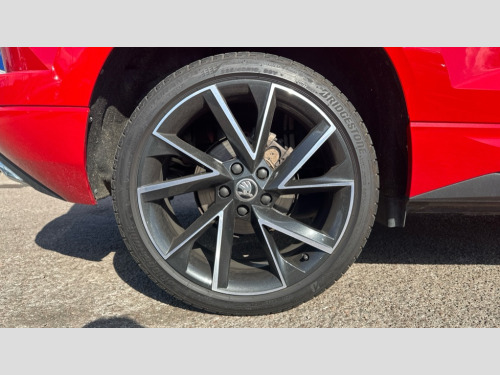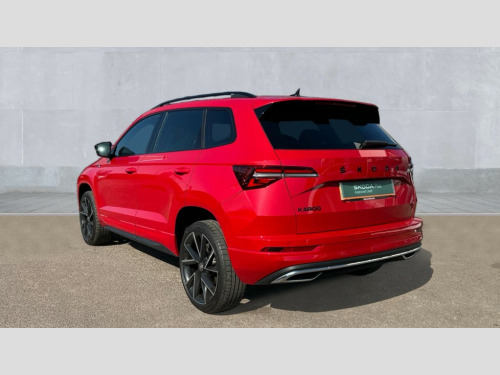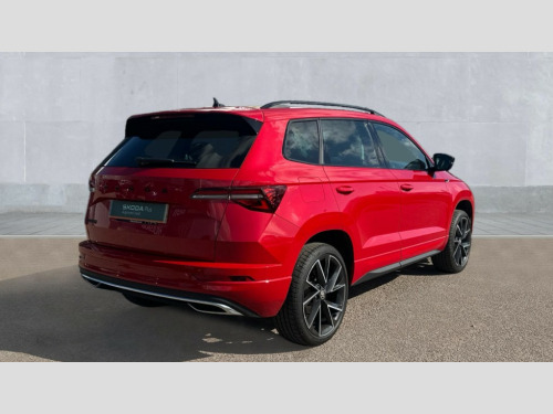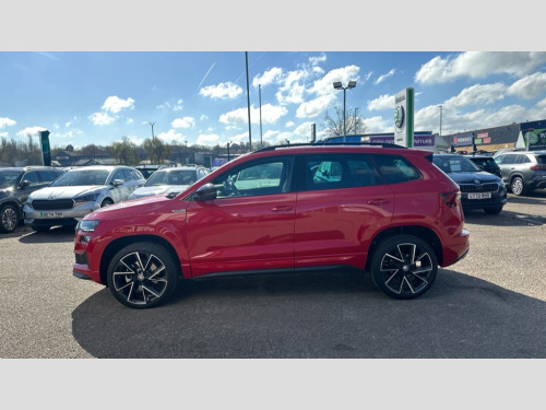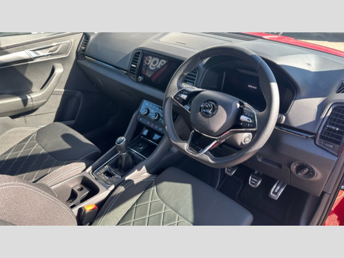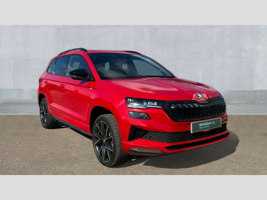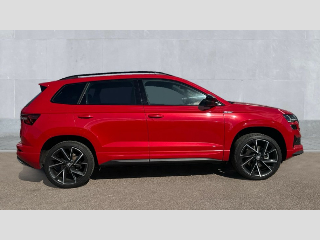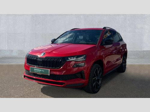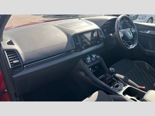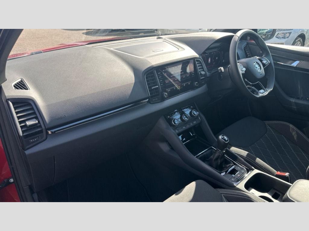 Skoda Karoq 1.5 TSI Sportline 5dr 8" Digital display, Care connect, Driver fatigue sensor, Emergency services call system, Outside temperature gauge, Service interval indicator, SmartLink wireless for Apple and wired for Android, Start/stop system with regenerative braking, USB C Port x 2 in front centre console, Virtual cockpit, Virtual pedal with electrically operated boot door, 8 Speakers, DAB radio with Bluetooth, USB connection, Wireless charging without wireless aerial connection, Acoustic glass, Aero front windscreen wipers with intermittent function, Auto dimming rear view mirror with light and rain sensors, Black door mirrors, Black electric window control buttons, Black radiator grille, Black roof rails, Body colour door handles, Electric front and rear windows with child proof lock, Front door steps with SportLine logo, Heated rear windscreen, LED daytime running lights, LED rear lights with high functionality welcome effect and dynamic indicators, Light assistant (coming/leaving home/tunnel light), Panoramic sliding sunroof, Plastic scuff plates, Privacy glass, Protective door side sills in body colour, Rear diffuser, Rear side wing doors, Rear spoiler, Rear window wiper with washer system and intermittent control, Safety reflectors on front doors, Skoda lettering on tailgate in black, Sportline badge on front fender, Sportline decorative inserts with badging, Sports front and rear bumpers, 1.5 litre bottle holders in driver and front passenger door panels, 12V socket in boot, 12v socket in front centre armrest with storage compartment and rear air vents, 3 rear height adjustable headrests, 3 seat bench in 2nd row, 3 spoke leather sports multifunction steering wheel and silver stitching, 4 foldable roof handles with rear coat hooks, Black floor carpet, Black roof headlining, Chrome inner door handles, Double sided boot floor, Foldable hooks in the boot, Front head restraints, Height adjustable front three point seats belts with tensioners, Height/reach adjust steering wheel, Ice scraper, Illuminated glovebox, Illuminated luggage compartment, Isofix child seat preparation outer rear, Manual lumbar support for front seats, Pen holder, Pollen filter, Rear boot cover, Rear reading lights, Rear seats fixed folding and divided 60:40, Rubbish bin door, Safety vest holder, Single front passenger seat, Storage box in upper central dashboard closed, Sunvisors with illuminated vanity mirrors, Textile floor mats, Ticket holder, Titan black interior ceiling, Welcome animation with sportline logo, Boot pack - Karoq, Light Pack - Karoq, Parking pack - Karoq, Automatic door unlocking in case of crash, Automatic fuel cut off in case of crash, Child locks on rear doors, Driver airbag, Electronic parking brake with auto hold function, Emergency rear braking signal, ESC including ABS, MSR, ASR, EDS, HBA, DSR, RBS, MKB and traction control, Front side airbags, Hill hold control, Knee airbags, Passenger airbag with switch-off function, Pedestrian monitor, Seatbelt reminder signalisation and pretensioner for all seats, Three point seatbelts rear, Two tone horn, Tyre pressure display, Tyre pressure monitor, Alarm with interior monitoring, back up horn and tilt sensor with safe function, Electronic engine immobiliser, Keyless entry and start/stop, Remote central locking with 2 remote folding keys, Black air vent surround, Black centre console, Satin black dashboard, Satin black door trim, 19" Sagitarius anthracite alloy wheels with matt black aero inserts, Anti-theft wheel bolts protection, Matt black aero hub caps, Tool kit