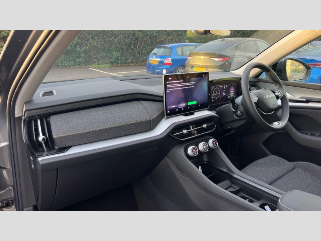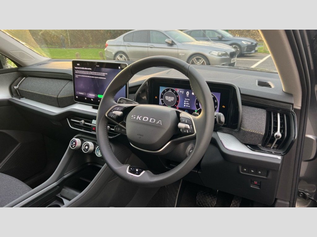 Skoda Kodiaq 1.5 TSI e-TEC SE 5dr DSG [7 Seat] 13" satellite navigation touchscreen display, Blind spot detection with door exit warning, Bluetooth system, ChatGPT functionality, Driver alert - Fatigue and drowsiness monitor, Dry display cleaner, Emergency call, Front and rear parking sensors, Front cross traffic assist, Lane assist, PAS, Rear traffic assist, Rear view camera, Tailgate unlocking from outside, Traffic sign recognition, USB C Port x 2 in front centre console, Virtual Cockpit - 10.25" digital display, Voice control system, Wireless charging for two smartphones (15W) with cooling function, Wireless SmartLink for Apple CarPlay and Android Auto, Stop/start function, 2x USB-C in the rear, 8 Speakers, DAB Digital radio, Aero front windscreen wipers with intermittent function, All weather light, Auto dimming rear view mirror, Black wheel arch surrounds, Body colour bumpers, Body colour door mirrors and handles, Cornering light and poor weather light, Electric folding /adjustable/separted heated/folding door mirrors, auto dimming with boarding sports and memory function, Electric front and rear windows, Exterior black decorative trims, Heat insulating glass in windshield, Heated rear window, Ice scraper in fuel tank cap, Invisible tailpipe, LED daytime running lights, LED front fog lamps, LED Headlights, LED rear fog light, LED rear lights, LED third brake light in rear spoiler, Light assistant with automatic headlight control and coming home feature, Logo projection in door mirrors, Rear roof spoiler, Rear side wing doors, Rear window wiper, Safety reflectors on front and rear doors, Unique dark chrome design logo on alloy wheels, Window control switches with black trim, Windscreen wipers with rain sensor, Without engine designation, 1.5l bottle holder points in all door, 1x centre rear reading light, 2 seat bench in 3rd row, 3 configurable smart dials with 32mm coloured display, 3 seat bench in 2nd row, 4 foldable roof handles with rear coat hooks, Ambient interior lighting - Dashboard, front-door stowage compartments, front and rear door panels and footwell lighting, Automatic gear selector on steering column, Chrome interior door handles, Driver/front passenger reading lights, Fabric headlining, Fixed bench 40:60:40 split folding backrests, Front and rear floor mats, Front centre armrest with jumbo box storage compartment, cup holder and 12V socket, Height adjustable front headrests, Isofix child seat fittings in outer middle row rear seats and front passenger with top tether, Manual height adjustment for front passenger seats and thigh support extender, Manual lumbar support for front passenger seat, Manually adjustable steering column, Pollen filter, Rear centre armrest with cupholders, Rear seat boot backrest release, Single front passenger seat, Skoda lettering on steering wheel, Storage pocket including mobile phone pockets on the backs of the front seats, Sunvisors with illuminated vanity mirrors, Three rear height adjustable headrests, Ticket holder on A Pillar, Tri zone climate control, Umbrella in door panel x1 made from sustainable materials, Upper and lower glovebox with card holder and coin compartment, USB C port by rear view mirror for charging only (15W), Variable boot floor, Auto door release and activation of warning lights in the event of an accident, Driver and front passenger airbag with knee airbag and front passenger airbag deactivation, Electric child locks, Electronic parking brake, ESC (incl. ABS+EMD+MSR+ASR+EDL+HBA+DSR+RBS+ESBS+MCB+TSA+XDS), Front assist with braking reaction to vehicles, pedestrians and cyclists, Front disc brakes, Fuel cut off safety device, Height adjustable front 3 point seatbelts + pretensioners, Hill hold assist, Junction assist with automatic emergency braking, Rear disc brakes, Safety vest holder in door, Seat belt reminder for all seats, Three point rear seat belts, Two tone horn, Tyre pressure monitor, Alarm with interior monitoring and tilt sensor with safe function, Anti-theft wheel bolts, Immobiliser, Remote central locking with 2 keys, Breakdown kit, Tool kit