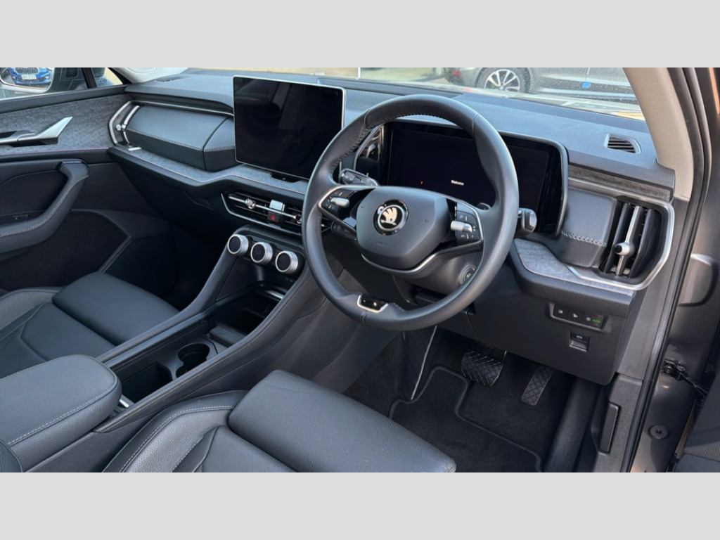 Skoda Kodiaq 1.5 TSI e-TEC SE L 5dr DSG [7 Seat] 13" satellite navigation touchscreen display, Blind spot detection with door exit warning, Bluetooth system, ChatGPT functionality, Drive mode selector, Driver alert with fatigue sensor, Driver drowsiness alert system, Dry display cleaner, e call+, Front cross traffic assist, Lane assist, PAS, Rear traffic assist, Tailgate unlocking from outside, Traffic sign recognition, USB C Port x 2 in front centre console, Virtual Cockpit - 10.25" digital display, Voice control system, Wireless charging for two smartphones (15W) with cooling function, Wireless SmartLink for Apple CarPlay and Android Auto, Stop/start function, 2x USB-C in the rear, DAB Digital radio, Aero front windscreen wipers with intermittent function, Auto dimming rear view mirror, AWL (all weather lighting) and all weather light with cornering function, Black wheel arch surrounds, Body colour bumpers, Body colour door mirrors and handles, Cornering light and poor weather light, Electric folding /adjustable/separted heated/folding door mirrors, auto dimming with boarding sports and memory function, Electric front and rear windows, Exterior black decorative trims, Heat insulating glass in windshield, Heated rear window, Ice scraper in fuel tank cap, Invisible tailpipe, LED daytime running lights, LED rear fog light, LED third brake light in rear spoiler, Light assistant with automatic headlight control and coming home feature, Logo projection in door mirrors, Privacy glass, Rear side wing doors, Rear spoiler, Rear window wiper, Red decorative strip between rear LED lights, Safety reflectors on front and rear doors, Window control switches with black trim, Windscreen wipers with rain sensor, Without engine designation, 1.5l bottle holder points in all door, 12V socket in boot, 1x centre rear reading light, 2 seat bench in 3rd row, 3 configurable smart dials with 32mm coloured display, 3 seat bench in 2nd row, 4 foldable roof handles with rear coat hooks, Ambient interior lighting - Dashboard, front-door stowage compartments, front and rear door panels and footwell lighting, Automatic gear selector on steering wheel, Chrome interior door handles, Driver/front passenger reading lights, Fabric headlining, Fixed bench 40:60:40 split folding backrests, Front and rear floor mats, Front centre armrest with jumbo box storage compartment, cup holder and 12V socket, Front courtesy lights, Height adjustable front headrests, Isofix child seat fittings in outer middle row rear seats and front passenger with top tether, Manually adjustable steering column, Pollen filter, Rear centre armrest with cupholders, Rear seat boot backrest release, Retractable luggage compartment cover, Single front passenger seat, Sliding trunk cover, Small Bags on the inner sides of the front backrests, Storage pocket including mobile phone pockets on the backs of the front seats, Sunvisors with illuminated vanity mirrors, Three rear height adjustable headrests, Ticket holder on A Pillar, Tri zone climate control, Umbrella in door panel x1 made from sustainable materials, Upper and lower glovebox with card holder and coin compartment, USB C port by rear view mirror for charging only (15W), Exterior styling pack - Kodiaq, Auto door release and activation of warning lights in the event of an accident, Driver and front passenger airbag with knee airbag and front passenger airbag deactivation, Electric child locks, Electronic parking brake, ESC (incl. ABS+EMD+MSR+ASR+EDL+HBA+DSR+RBS+ESBS+MCB+TSA+XDS), Front assist with braking reaction to vehicles, pedestrians and cyclists, Front disc brakes, Fuel cut off safety device, Height adjustable front 3 point seatbelts + pretensioners, Hill hold control, Junction assist with automatic emergency braking, Rear disc brakes, Safety vest holder in door, Seat belt reminder for all seats, Three point rear seat belts, Two tone horn, Tyre pressure monitor, Anti-theft wheel bolts, Immobiliser, Remote central locking with 2 keys, Breakdown kit