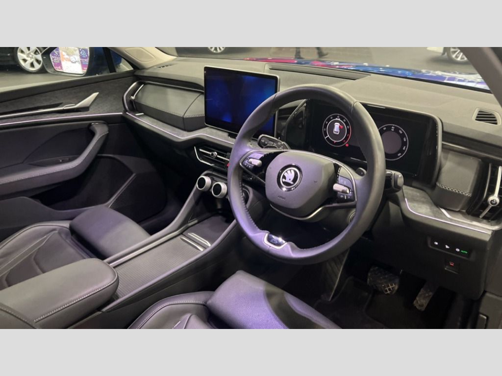 Skoda Kodiaq 1.5 TSI e-TEC SE L 5dr DSG [7 Seat] 13" satellite navigation touchscreen display, Blind spot detection with door exit warning, Bluetooth system, ChatGPT functionality, Drive mode selector, Driver alert with fatigue sensor, Driver drowsiness alert system, Dry display cleaner, e call+, Front cross traffic assist, Lane assist, PAS, Rear traffic assist, Tailgate unlocking from outside, Traffic sign recognition, USB C Port x 2 in front centre console, Virtual Cockpit - 10.25" digital display, Voice control system, Wireless charging for two smartphones (15W) with cooling function, Wireless SmartLink for Apple CarPlay and Android Auto, Stop/start function, 2x USB-C in the rear, DAB Digital radio, Aero front windscreen wipers with intermittent function, Auto dimming rear view mirror, AWL (all weather lighting) and all weather light with cornering function, Black wheel arch surrounds, Body colour bumpers, Body colour door mirrors and handles, Cornering light and poor weather light, Electric folding /adjustable/separted heated/folding door mirrors, auto dimming with boarding sports and memory function, Electric front and rear windows, Exterior black decorative trims, Heat insulating glass in windshield, Heated rear window, Ice scraper in fuel tank cap, Invisible tailpipe, LED daytime running lights, LED third brake light in rear spoiler, Light assistant with automatic headlight control and coming home feature, Logo projection in door mirrors, Privacy glass, Rear side wing doors, Rear spoiler, Rear window wiper, Red decorative strip between rear LED lights, Safety reflectors on front and rear doors, Unique dark chrome design logo on alloy wheels, Window control switches with black trim, Windscreen wipers with rain sensor, Without engine designation, 1.5l bottle holder points in all door, 12V socket in boot, 1x centre rear reading light, 2 seat bench in 3rd row, 3 configurable smart dials with 32mm coloured display, 3 seat bench in 2nd row, 4 foldable roof handles with rear coat hooks, Ambient interior lighting - Dashboard, front-door stowage compartments, front and rear door panels and footwell lighting, Automatic gear selector on steering wheel, Chrome interior door handles, Driver/front passenger reading lights, Fabric headlining, Fixed bench 40:60:40 split folding backrests, Front and rear floor mats, Front centre armrest with jumbo box storage compartment, cup holder and 12V socket, Front courtesy lights, Height adjustable front headrests, Isofix child seat fittings in outer middle row rear seats and front passenger with top tether, Manually adjustable steering column, Pollen filter, Rear centre armrest with cupholders, Rear seat boot backrest release, Retractable luggage compartment cover, Single front passenger seat, Skoda lettering on steering wheel, Sliding trunk cover, Small Bags on the inner sides of the front backrests, Storage pocket including mobile phone pockets on the backs of the front seats, Sunvisors with illuminated vanity mirrors, Three rear height adjustable headrests, Ticket holder on A Pillar, Tri zone climate control, Umbrella in door panel x1 made from sustainable materials, Upper and lower glovebox with card holder and coin compartment, USB C port by rear view mirror for charging only (15W), Exterior styling pack - Kodiaq, Auto door release and activation of warning lights in the event of an accident, Driver and front passenger airbag with knee airbag and front passenger airbag deactivation, Electric child locks, Electronic parking brake, ESC (incl. ABS+EMD+MSR+ASR+EDL+HBA+DSR+RBS+ESBS+MCB+TSA+XDS), Front assist with braking reaction to vehicles, pedestrians and cyclists, Front disc brakes, Fuel cut off safety device, Height adjustable front 3 point seatbelts + pretensioners, Hill hold control, Junction assist with automatic emergency braking, Rear disc brakes, Safety vest holder in door, Seat belt reminder for all seats, Three point rear seat belts, Two tone horn, Tyre pressure monitor, Anti-theft wheel bolts, Immobiliser, Remote central locking with 2 keys, Breakdown kit