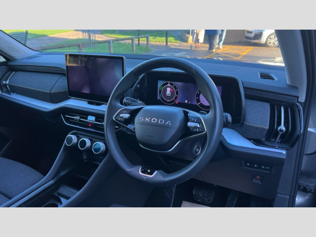 Skoda Kodiaq 1.5 TSI iV 204 SE 5dr DSG 13" satellite navigation touchscreen display, Blind spot detection with door exit warning, Bluetooth system, ChatGPT functionality, Driver alert - Fatigue and drowsiness monitor, Dry display cleaner, Emergency call, Front and rear parking sensors, Front cross traffic assist, Lane assist, PAS, Rear traffic assist, Rear view camera, Tailgate unlocking from outside, Traffic sign recognition, USB C Port x 2 in front centre console, Virtual Cockpit - 10.25" digital display, Voice control system, Wireless charging for two smartphones (15W) with cooling function, Wireless SmartLink for Apple CarPlay and Android Auto, 32A charging cable, Stop/start function, 2x USB-C in the rear, 8 Speakers, DAB Digital radio, Aero front windscreen wipers with intermittent function, All weather light, Auto dimming rear view mirror, Black wheel arch surrounds, Body colour bumpers, Body colour door mirrors and handles, Cornering light and poor weather light, Electric folding /adjustable/separted heated/folding door mirrors, auto dimming with boarding sports and memory function, Electric front and rear windows, Exterior black decorative trims, Heat insulating glass in windshield, Heated rear window, Ice scraper in fuel tank cap, Invisible tailpipe, LED daytime running lights, LED front fog lamps, LED Headlights, LED rear fog light, LED rear lights, LED third brake light in rear spoiler, Light assistant with automatic headlight control and coming home feature, Logo projection in door mirrors, Rear roof spoiler, Rear side wing doors, Rear window wiper, Safety reflectors on front and rear doors, Unique dark chrome design logo on alloy wheels, Window control switches with black trim, Windscreen wipers with rain sensor, Without engine designation, 1.5l bottle holder points in all door, 1x centre rear reading light, 3 configurable smart dials with 32mm coloured display, 3 seat bench in 2nd row, 4 foldable roof handles with rear coat hooks, Ambient interior lighting - Dashboard, front-door stowage compartments, front and rear door panels and footwell lighting, Automatic gear selector on steering column, Chrome interior door handles, Driver/front passenger reading lights, Fabric headlining, Fixed bench 40:60:40 split folding backrests, Front and rear floor mats, Front centre armrest with jumbo box storage compartment, cup holder and 12V socket, Height adjustable front headrests, Isofix child seat fittings in outer rear seats and front passenger with top tether, iV badging on boot, Manual height adjustment for front passenger seats and thigh support extender, Manual lumbar support for front passenger seat, Manually adjustable steering column, Pollen filter, Rear centre armrest with cupholders, Rear seat boot backrest release, Single front passenger seat, Skoda lettering on steering wheel, Storage pocket including mobile phone pockets on the backs of the front seats, Sunvisors with illuminated vanity mirrors, Three rear height adjustable headrests, Ticket holder on A Pillar, Tri zone climate control, Umbrella in door panel x1 made from sustainable materials, Upper and lower glovebox with card holder and coin compartment, USB C port by rear view mirror for charging only (15W), Auto door release and activation of warning lights in the event of an accident, Driver and front passenger airbag with knee airbag and front passenger airbag deactivation, Electric child locks, Electronic parking brake, ESC (incl. ABS+EMD+MSR+ASR+EDL+HBA+DSR+RBS+ESBS+MCB+TSA+XDS), Front assist with braking reaction to vehicles, pedestrians and cyclists, Front disc brakes, Fuel cut off safety device, Height adjustable front 3 point seatbelts + pretensioners, Hill hold assist, Junction assist with automatic emergency braking, Rear disc brakes, Safety vest holder in door, Seat belt reminder for all seats, Three point rear seat belts, Two tone horn, Tyre pressure monitor, Alarm with interior monitoring and tilt sensor with safe function, Anti-theft wheel bolts, Immobiliser, Remote central locking with 2 keys, Breakdown kit, Tool kit