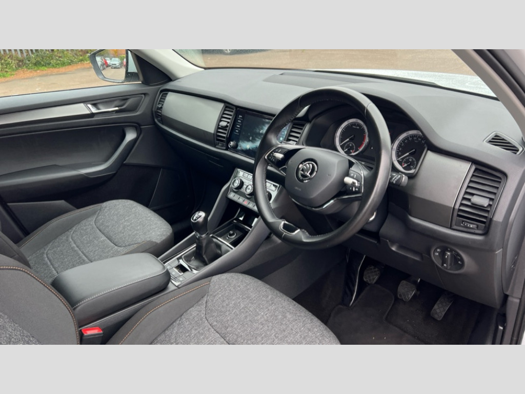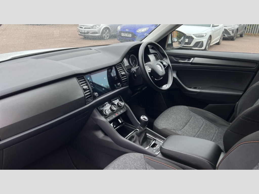 Skoda Kodiaq 1.5 TSI SE Drive 5dr [7 Seat] Bluetooth system, Colour multifunction trip computer, Cruise control, Digital voice enhancement, ECO Stop/start function, Exterior temperature indicator, Power assist steering, Rear view camera with full LED rear lights, Smartlink wireless for apple carplay and wired for android auto, Speed limiter, Tailgate unlocking from outside, USB C Port x 2 in front centre console, Voice control system, DAB Digital radio, Aero front windscreen wipers with intermittent function, Aero rear window wiper, Auto dimming rear view mirror, Automatic activation of hazard warning lights, Black electric window control buttons, Black wheel arch surrounds, Body colour bumpers, Body colour door mirrors and handles, Electric adjustable heated door mirrors with integrated indicators, Electric front and rear windows, Front fog lights, Halogen headlights with LED daytime running lights, Headlight washers, Heated rear window, Invisible tailpipe, LED rear fog light, LED rear lights with high functionality, LED third brake light in rear spoiler, Light assistant (coming home/tunnel light), Radiator grille frame in matt black with chrome strip, Rain and light sensors, Rear spoiler, Safety reflectors on front and rear doors, Scuff plates, Sunset privacy glass, 12V socket in boot, 2 rails with 2 hooks including 4 hooks for net programme, 4 foldable roof handles with rear coat hooks, 4 lashing points on luggage floor, 60:40 foldable rear seat with sliding adjustment and backrest angle adjustment, Bottle holders in door panel in the 1.5 litre front and 1 litre rear, Cargo storage compartments, Centre console with open storage box, cup holder and 12V socket, Chrome interior door handles, Coat hooks on B pillar, Covered storage compartment on driver side, Fabric upholstery, Front and rear door armrest with black adductor trim, Front and rear height adjustable headrests, Front centre armrest with storage compartment, cup holder and 12V socket, Front courtesy lights, Gear shift lever with chrome frame and black gloss insert, Grey headlining, Height adjustable front seats, Illuminated and cooled glovebox, Illuminated luggage compartment, Isofix child seat fittings in outer rear seats with top tether, LED ambient lighting, Manual lumbar support for driver and front passenger, Manually adjustable steering column, Net programme in boot (1x horizontal Net, 2x vertical Nets), Overhead glasses storage compartment, Pollen filter, Rear centre armrest with cupholders, Roll up luggage compartment cover with intermediate position, Small Bags on the inner sides of the front backrests, Storage compartment in lower middle instrument panel with closing, Three rear height adjustable headrests, Ticket holder on A Pillar, Umbrella in door panel, LED Interior Light pack - Kodiaq SE Drive, Auto door release and activation of warning lights in the event of an accident, Driver and passenger airbags, Electronic parking brake with hill hold control, Emergency rear braking signal, ESC (incl. ABS+MSR+ASR+EDS+HBA+DSR+RBS+MKB), Front and rear three point safety belt on all seats, Front assist includes AEB city/urban, Front passenger airbag deactivation switch, Front side airbags, Fuel cut off safety device, Head and knee airbags, Rear disc brakes, Safety vest holder in door, Seat belt reminder for all seats, Two tone horn, Tyre pressure monitor, Warning lights in front doors, Alarm with interior monitoring and tilt sensor with safe function, Immobiliser, Remote central locking, Mythos black decorative inserts, 19" Aronia platinum alloy wheels with anti-theft wheel bolts