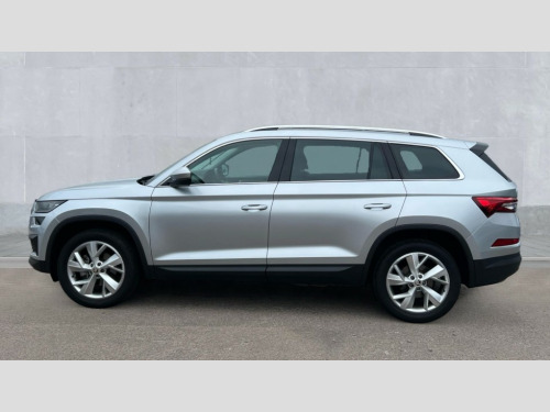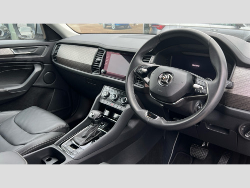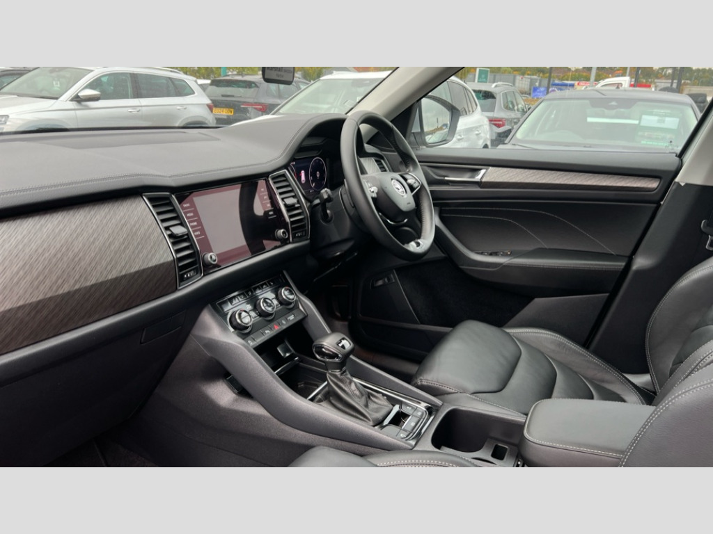 Skoda Kodiaq 1.5 TSI SE L Executive 5dr DSG [7 Seat] Bluetooth system, Digital voice enhancement, e call+, ECO Stop/start function, Exterior temperature indicator, Rear view camera, Smartlink wireless for apple carplay and wired for android auto, Speed limiter, Tailgate unlocking from outside, USB C Port x 2 in front centre console, Virtual Cockpit - 10.25" digital display, Wireless charging, 8 Speakers, DAB Digital radio, Aero front windscreen wipers with intermittent function, Aero rear window wiper, Auto dimming rear view mirror, Black wheel arch surrounds, Body colour bumpers, Body colour door mirrors and handles, Chrome front grille, Chrome roof rails with chrome window surround, Electric adjustable/heated/folding door mirrors, driver side auto dimming with boarding sports and memory function, Electric front and rear windows, Extended rear spoiler with finlets in gloss black, Front fog lights, Full LED matrix headlights with AFS (adaptive front light system), cornering function and AWL (all weather lighting system), Headlight washers, Heated rear window, Invisible tailpipe, LED daytime running lights, LED rear fog light, LED third brake light in rear spoiler, Light assistant (coming/leaving home/tunnel light), Off-road style lower front bumper element, Privacy glass, Rain and light sensors, Rear LED lights (high functionality) with welcome effect and dynamic indicators, Rear side wing doors, Safety reflectors on front and rear doors, Window control switches with black trim, 12V socket in boot, 2 rails with 2 hooks, 2 seat bench in 3rd row, 2 spoke multi-function leather steering wheel with paddle shift, 3 seat bench in 2nd row, 4 foldable roof handles with rear coat hooks, 60:40 foldable rear seat with sliding adjustment and backrest angle adjustment, Bottle holders in door panel in the 1.5 litre front and 1 litre rear, Cargo storage compartments, Chrome headlight control button, Chrome interior door handles, Coat hooks on B pillar, Covered storage compartment on driver side, Decorative door sill covers, Front and rear door armrest with black adductor trim, Front centre armrest with storage compartment, cup holder and 12V socket, Front courtesy lights, Gear shift lever with chrome frame and black gloss insert, Grey stitching in front and rear armrests and door armrests + door inserts, Height adjustable front headrests, Illuminated glovebox, Illuminated luggage compartment, Isofix child seat fittings in outer rear seats with top tether, Manually adjustable steering column, Net programme in boot (1x horizontal Net, 2x vertical Nets), Overhead glasses storage compartment, Pollen filter, Rear centre armrest with cupholders, Single front passenger seat, Sliding trunk cover, Small Bags on the inner sides of the front backrests, Sunvisors with illuminated vanity mirrors, Three rear height adjustable headrests, Ticket holder on A Pillar, Umbrella in door panel, Variable boot floor, Auto door release and activation of warning lights in the event of an accident, Driver and front passenger airbag with knee airbag and front passenger airbag deactivation, Electronic parking brake with hill start assist, Emergency rear braking signal, ESC (incl. ABS+MSR+ASR+EDS+HBA+DSR+RBS+MKB), Front assist with autonomous emergency braking, Front side airbags with curtain airbags, Fuel cut off safety device, Height adjustable front 3 point seatbelts + pretensioners, Hill hold control, Rear disc brakes, Safety vest holder in door, Seat belt reminder for all seats, Three point rear seat belts, Two tone horn, Tyre pressure monitor, Alarm with interior monitoring and tilt sensor with safe function, Anti-theft wheel bolts, Immobiliser, Keyless entry and start system (KESSY), Remote central locking with 2 keys, Grey stitching in dashboard, Linear diamonds decorative inserts, Temporary spare wheel (space saver)