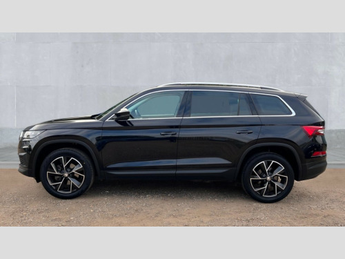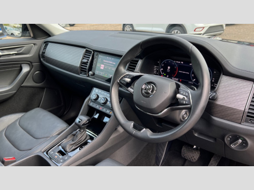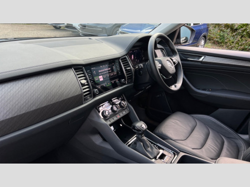 Skoda Kodiaq 1.5 TSI SE L Executive 5dr DSG [7 Seat] Bluetooth system, Digital voice enhancement, e call+, ECO Stop/start function, Exterior temperature indicator, Rear view camera, Smartlink wireless for apple carplay and wired for android auto, Speed limiter, Tailgate unlocking from outside, USB C Port x 2 in front centre console, Virtual Cockpit - 10.25" digital display, Wireless charging, 8 Speakers, DAB Digital radio, Aero front windscreen wipers with intermittent function, Aero rear window wiper, Auto dimming rear view mirror, Black wheel arch surrounds, Body colour bumpers, Body colour door mirrors and handles, Chrome front grille, Chrome roof rails with chrome window surround, Electric adjustable/heated/folding door mirrors, driver side auto dimming with boarding sports and memory function, Electric front and rear windows, Extended rear spoiler with finlets in gloss black, Front fog lights, Full LED matrix headlights with AFS (adaptive front light system), cornering function and AWL (all weather lighting system), Headlight washers, Heated rear window, Invisible tailpipe, LED daytime running lights, LED rear fog light, LED third brake light in rear spoiler, Light assistant (coming/leaving home/tunnel light), Off-road style lower front bumper element, Privacy glass, Rain and light sensors, Rear LED lights (high functionality) with welcome effect and dynamic indicators, Rear side wing doors, Safety reflectors on front and rear doors, Window control switches with black trim, 12V socket in boot, 2 rails with 2 hooks, 2 seat bench in 3rd row, 2 spoke multi-function leather steering wheel with paddle shift, 3 seat bench in 2nd row, 4 foldable roof handles with rear coat hooks, 60:40 foldable rear seat with sliding adjustment and backrest angle adjustment, Bottle holders in door panel in the 1.5 litre front and 1 litre rear, Cargo storage compartments, Chrome headlight control button, Chrome interior door handles, Coat hooks on B pillar, Covered storage compartment on driver side, Decorative door sill covers, Front and rear door armrest with black adductor trim, Front centre armrest with storage compartment, cup holder and 12V socket, Front courtesy lights, Gear shift lever with chrome frame and black gloss insert, Grey stitching in front and rear armrests and door armrests + door inserts, Height adjustable front headrests, Illuminated glovebox, Illuminated luggage compartment, Isofix child seat fittings in outer rear seats with top tether, Manually adjustable steering column, Net programme in boot (1x horizontal Net, 2x vertical Nets), Overhead glasses storage compartment, Pollen filter, Rear centre armrest with cupholders, Single front passenger seat, Sliding trunk cover, Small Bags on the inner sides of the front backrests, Sunvisors with illuminated vanity mirrors, Three rear height adjustable headrests, Ticket holder on A Pillar, Umbrella in door panel, Variable boot floor, Auto door release and activation of warning lights in the event of an accident, Driver and front passenger airbag with knee airbag and front passenger airbag deactivation, Electronic parking brake with hill start assist, Emergency rear braking signal, ESC (incl. ABS+MSR+ASR+EDS+HBA+DSR+RBS+MKB), Front assist with autonomous emergency braking, Front side airbags with curtain airbags, Fuel cut off safety device, Height adjustable front 3 point seatbelts + pretensioners, Hill hold control, Rear disc brakes, Safety vest holder in door, Seat belt reminder for all seats, Three point rear seat belts, Two tone horn, Tyre pressure monitor, Alarm with interior monitoring and tilt sensor with safe function, Anti-theft wheel bolts, Immobiliser, Keyless entry and start system (KESSY), Remote central locking with 2 keys, Grey stitching in dashboard, Linear diamonds decorative inserts, Temporary spare wheel (space saver)