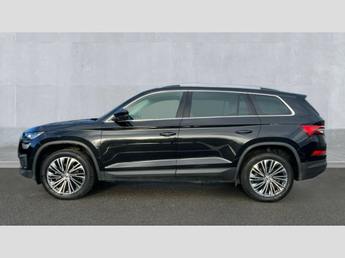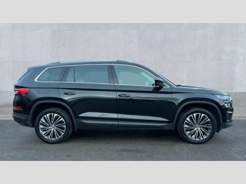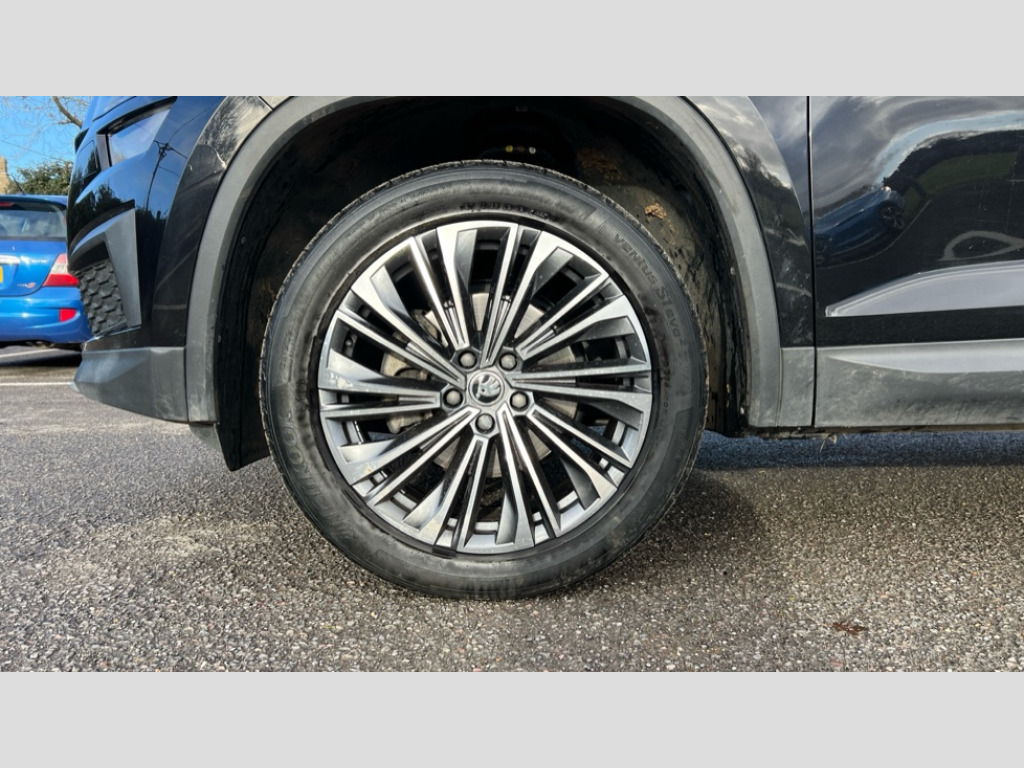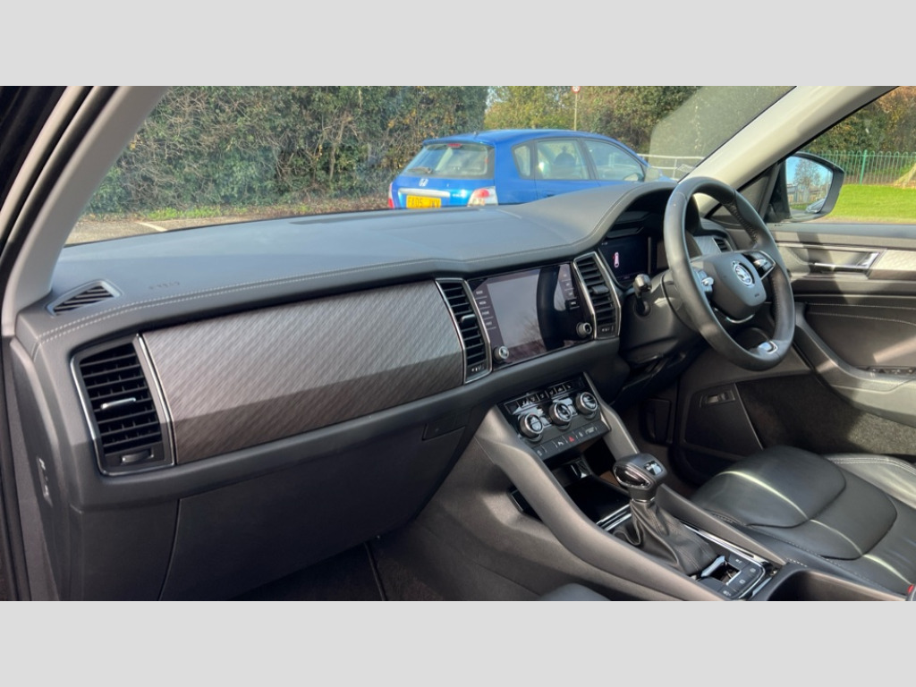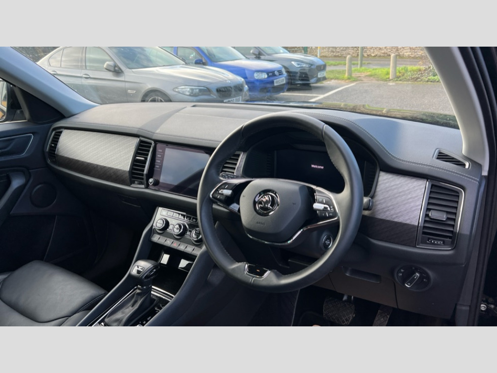 Skoda Kodiaq 1.5 TSI SE L Executive 5dr DSG [7 Seat] Bluetooth system, Digital voice enhancement, e call+, ECO Stop/start function, Exterior temperature indicator, Rear view camera, Smartlink wireless for apple carplay and wired for android auto, Speed limiter, Tailgate unlocking from outside, USB C Port x 2 in front centre console, Virtual Cockpit - 10.25" digital display, Wireless charging, 8 Speakers, DAB Digital radio, Aero front windscreen wipers with intermittent function, Aero rear window wiper, Auto dimming rear view mirror, Black wheel arch surrounds, Body colour bumpers, Body colour door mirrors and handles, Chrome front grille, Chrome roof rails with chrome window surround, Electric adjustable/heated/folding door mirrors, driver side auto dimming with boarding sports and memory function, Electric front and rear windows, Extended rear spoiler with finlets in gloss black, Front fog lights, Full LED matrix headlights with AFS (adaptive front light system), cornering function and AWL (all weather lighting system), Headlight washers, Heated rear window, Invisible tailpipe, LED daytime running lights, LED rear fog light, LED third brake light in rear spoiler, Light assistant (coming/leaving home/tunnel light), Off-road style lower front bumper element, Privacy glass, Rain and light sensors, Rear LED lights (high functionality) with welcome effect and dynamic indicators, Rear side wing doors, Safety reflectors on front and rear doors, Window control switches with black trim, 12V socket in boot, 2 rails with 2 hooks, 2 seat bench in 3rd row, 2 spoke multi-function leather steering wheel with paddle shift, 3 seat bench in 2nd row, 4 foldable roof handles with rear coat hooks, 60:40 foldable rear seat with sliding adjustment and backrest angle adjustment, Bottle holders in door panel in the 1.5 litre front and 1 litre rear, Cargo storage compartments, Chrome headlight control button, Chrome interior door handles, Coat hooks on B pillar, Covered storage compartment on driver side, Decorative door sill covers, Front and rear door armrest with black adductor trim, Front centre armrest with storage compartment, cup holder and 12V socket, Front courtesy lights, Gear shift lever with chrome frame and black gloss insert, Grey stitching in front and rear armrests and door armrests + door inserts, Height adjustable front headrests, Illuminated glovebox, Illuminated luggage compartment, Isofix child seat fittings in outer rear seats with top tether, Manually adjustable steering column, Net programme in boot (1x horizontal Net, 2x vertical Nets), Overhead glasses storage compartment, Pollen filter, Rear centre armrest with cupholders, Single front passenger seat, Sliding trunk cover, Small Bags on the inner sides of the front backrests, Sunvisors with illuminated vanity mirrors, Three rear height adjustable headrests, Ticket holder on A Pillar, Umbrella in door panel, Variable boot floor, Auto door release and activation of warning lights in the event of an accident, Driver and front passenger airbag with knee airbag and front passenger airbag deactivation, Electronic parking brake with hill start assist, Emergency rear braking signal, ESC (incl. ABS+MSR+ASR+EDS+HBA+DSR+RBS+MKB), Front assist with autonomous emergency braking, Front side airbags with curtain airbags, Fuel cut off safety device, Height adjustable front 3 point seatbelts + pretensioners, Hill hold control, Rear disc brakes, Safety vest holder in door, Seat belt reminder for all seats, Three point rear seat belts, Two tone horn, Tyre pressure monitor, Alarm with interior monitoring and tilt sensor with safe function, Anti-theft wheel bolts, Immobiliser, Keyless entry and start system (KESSY), Remote central locking with 2 keys, Grey stitching in dashboard, Linear diamonds decorative inserts, Temporary spare wheel (space saver)