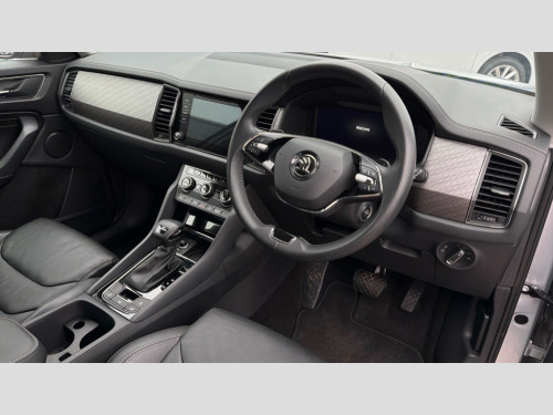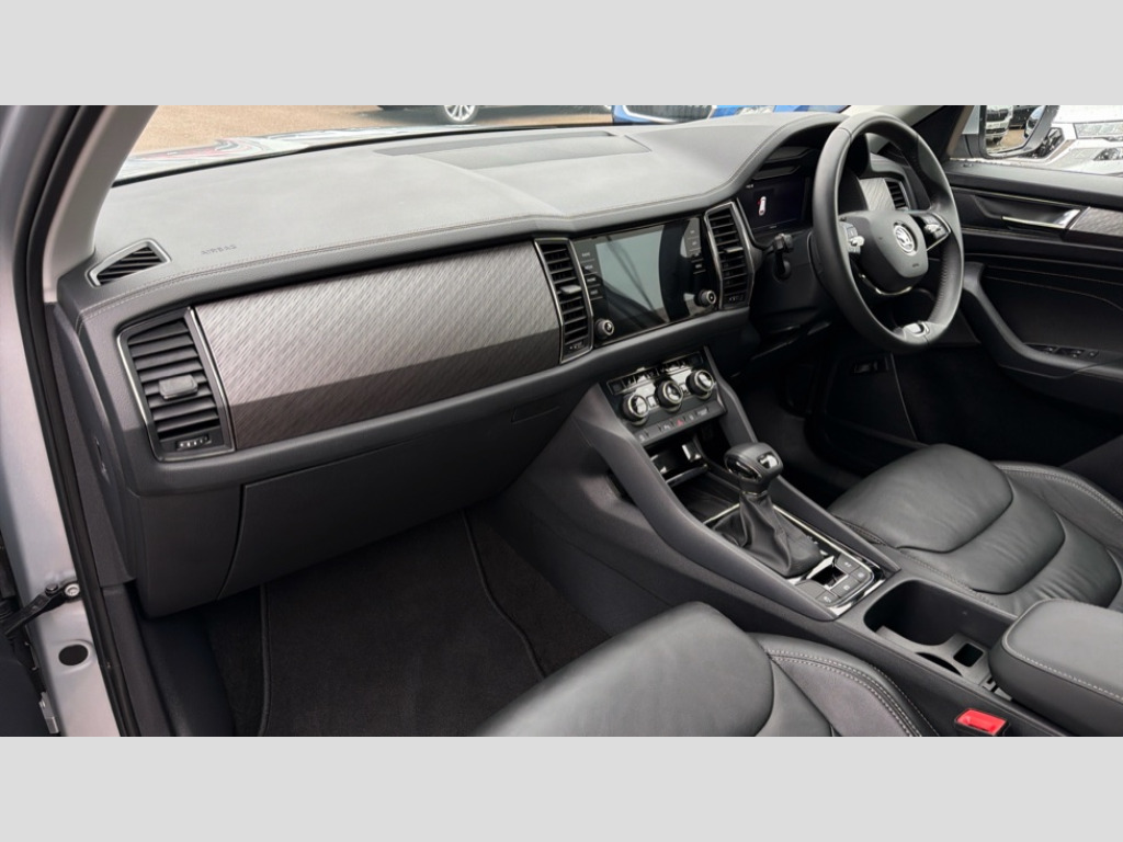 Skoda Kodiaq 1.5 TSI SE L Executive 5dr DSG [7 Seat] Bluetooth system, Digital voice enhancement, e call+, ECO Stop/start function, Exterior temperature indicator, Rear view camera, Smartlink wireless for apple carplay and wired for android auto, Speed limiter, Tailgate unlocking from outside, USB C Port x 2 in front centre console, Virtual Cockpit - 10.25" digital display, Wireless charging, 8 Speakers, DAB Digital radio, Aero front windscreen wipers with intermittent function, Aero rear window wiper, Auto dimming rear view mirror, Black wheel arch surrounds, Body colour bumpers, Body colour door mirrors and handles, Chrome front grille, Chrome roof rails with chrome window surround, Electric adjustable/heated/folding door mirrors, driver side auto dimming with boarding sports and memory function, Electric front and rear windows, Extended rear spoiler with finlets in gloss black, Front fog lights, Full LED matrix headlights with AFS (adaptive front light system), cornering function and AWL (all weather lighting system), Headlight washers, Heated rear window, Invisible tailpipe, LED daytime running lights, LED rear fog light, LED third brake light in rear spoiler, Light assistant (coming/leaving home/tunnel light), Off-road style lower front bumper element, Privacy glass, Rain and light sensors, Rear LED lights (high functionality) with welcome effect and dynamic indicators, Rear side wing doors, Safety reflectors on front and rear doors, Window control switches with black trim, 12V socket in boot, 2 rails with 2 hooks, 2 seat bench in 3rd row, 2 spoke multi-function leather steering wheel with paddle shift, 3 seat bench in 2nd row, 4 foldable roof handles with rear coat hooks, 60:40 foldable rear seat with sliding adjustment and backrest angle adjustment, Bottle holders in door panel in the 1.5 litre front and 1 litre rear, Cargo storage compartments, Chrome headlight control button, Chrome interior door handles, Coat hooks on B pillar, Covered storage compartment on driver side, Decorative door sill covers, Front and rear door armrest with black adductor trim, Front centre armrest with storage compartment, cup holder and 12V socket, Front courtesy lights, Gear shift lever with chrome frame and black gloss insert, Grey stitching in front and rear armrests and door armrests + door inserts, Height adjustable front headrests, Illuminated glovebox, Illuminated luggage compartment, Isofix child seat fittings in outer rear seats with top tether, Manually adjustable steering column, Net programme in boot (1x horizontal Net, 2x vertical Nets), Overhead glasses storage compartment, Pollen filter, Rear centre armrest with cupholders, Single front passenger seat, Sliding trunk cover, Small Bags on the inner sides of the front backrests, Sunvisors with illuminated vanity mirrors, Three rear height adjustable headrests, Ticket holder on A Pillar, Umbrella in door panel, Variable boot floor, Auto door release and activation of warning lights in the event of an accident, Driver and front passenger airbag with knee airbag and front passenger airbag deactivation, Electronic parking brake with hill start assist, Emergency rear braking signal, ESC (incl. ABS+MSR+ASR+EDS+HBA+DSR+RBS+MKB), Front assist with autonomous emergency braking, Front side airbags with curtain airbags, Fuel cut off safety device, Height adjustable front 3 point seatbelts + pretensioners, Hill hold control, Rear disc brakes, Safety vest holder in door, Seat belt reminder for all seats, Three point rear seat belts, Two tone horn, Tyre pressure monitor, Alarm with interior monitoring and tilt sensor with safe function, Anti-theft wheel bolts, Immobiliser, Keyless entry and start system (KESSY), Remote central locking with 2 keys, Grey stitching in dashboard, Linear diamonds decorative inserts, Temporary spare wheel (space saver)