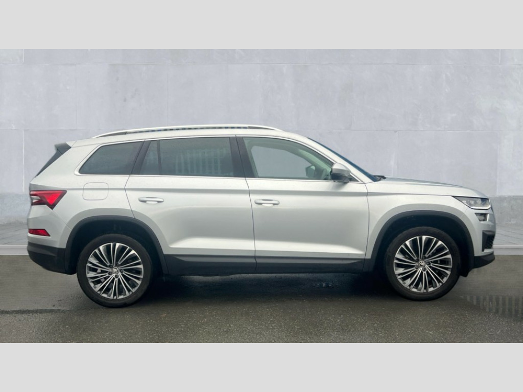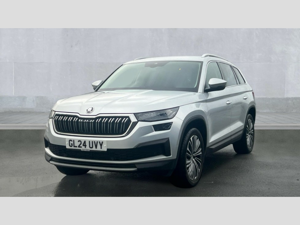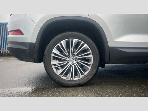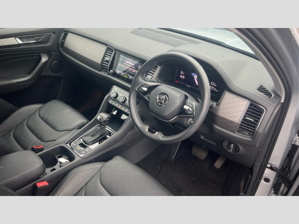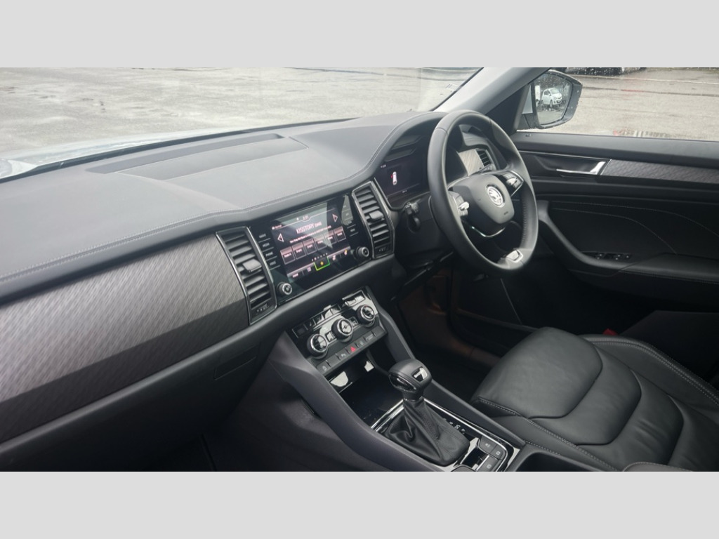 Skoda Kodiaq 1.5 TSI SE L Executive 5dr DSG [7 Seat] Bluetooth system, Digital voice enhancement, e call+, ECO Stop/start function, Exterior temperature indicator, Rear view camera, Smartlink wireless for apple carplay and wired for android auto, Speed limiter, Tailgate unlocking from outside, USB C Port x 2 in front centre console, Virtual Cockpit - 10.25" digital display, Wireless charging, 8 Speakers, DAB Digital radio, Aero front windscreen wipers with intermittent function, Aero rear window wiper, Auto dimming rear view mirror, Black wheel arch surrounds, Body colour bumpers, Body colour door mirrors and handles, Chrome front grille, Chrome roof rails with chrome window surround, Electric adjustable/heated/folding door mirrors, driver side auto dimming with boarding sports and memory function, Electric front and rear windows, Extended rear spoiler with finlets in gloss black, Front fog lights, Full LED matrix headlights with AFS (adaptive front light system), cornering function and AWL (all weather lighting system), Headlight washers, Heated rear window, Invisible tailpipe, LED daytime running lights, LED rear fog light, LED third brake light in rear spoiler, Light assistant (coming/leaving home/tunnel light), Off-road style lower front bumper element, Privacy glass, Rain and light sensors, Rear LED lights (high functionality) with welcome effect and dynamic indicators, Rear side wing doors, Safety reflectors on front and rear doors, Window control switches with black trim, 12V socket in boot, 2 rails with 2 hooks, 2 seat bench in 3rd row, 2 spoke multi-function leather steering wheel with paddle shift, 3 seat bench in 2nd row, 4 foldable roof handles with rear coat hooks, 60:40 foldable rear seat with sliding adjustment and backrest angle adjustment, Bottle holders in door panel in the 1.5 litre front and 1 litre rear, Cargo storage compartments, Chrome headlight control button, Chrome interior door handles, Coat hooks on B pillar, Covered storage compartment on driver side, Decorative door sill covers, Front and rear door armrest with black adductor trim, Front centre armrest with storage compartment, cup holder and 12V socket, Front courtesy lights, Gear shift lever with chrome frame and black gloss insert, Grey stitching in front and rear armrests and door armrests + door inserts, Height adjustable front headrests, Illuminated glovebox, Illuminated luggage compartment, Isofix child seat fittings in outer rear seats with top tether, Manually adjustable steering column, Net programme in boot (1x horizontal Net, 2x vertical Nets), Overhead glasses storage compartment, Pollen filter, Rear centre armrest with cupholders, Single front passenger seat, Sliding trunk cover, Small Bags on the inner sides of the front backrests, Sunvisors with illuminated vanity mirrors, Three rear height adjustable headrests, Ticket holder on A Pillar, Umbrella in door panel, Variable boot floor, Auto door release and activation of warning lights in the event of an accident, Driver and front passenger airbag with knee airbag and front passenger airbag deactivation, Electronic parking brake with hill start assist, Emergency rear braking signal, ESC (incl. ABS+MSR+ASR+EDS+HBA+DSR+RBS+MKB), Front assist with autonomous emergency braking, Front side airbags with curtain airbags, Fuel cut off safety device, Height adjustable front 3 point seatbelts + pretensioners, Hill hold control, Rear disc brakes, Safety vest holder in door, Seat belt reminder for all seats, Three point rear seat belts, Two tone horn, Tyre pressure monitor, Alarm with interior monitoring and tilt sensor with safe function, Anti-theft wheel bolts, Immobiliser, Keyless entry and start system (KESSY), Remote central locking with 2 keys, Grey stitching in dashboard, Linear diamonds decorative inserts, Temporary spare wheel (space saver)