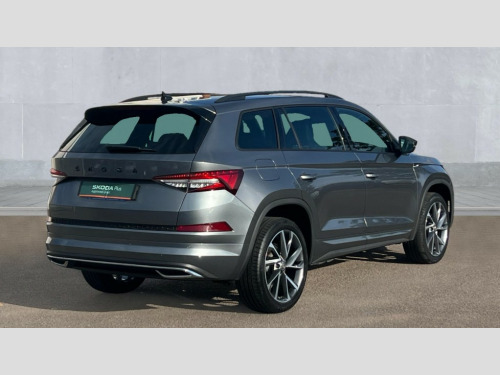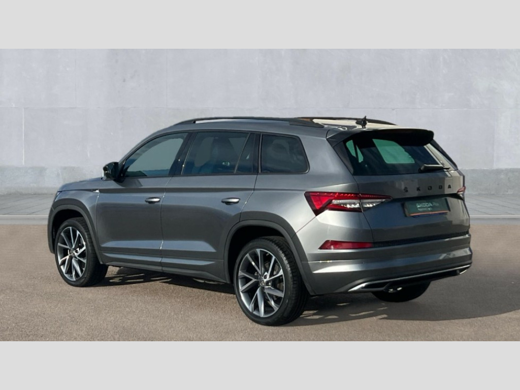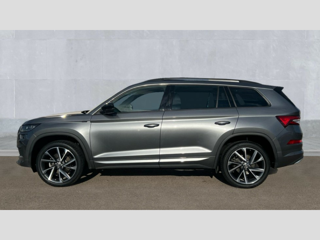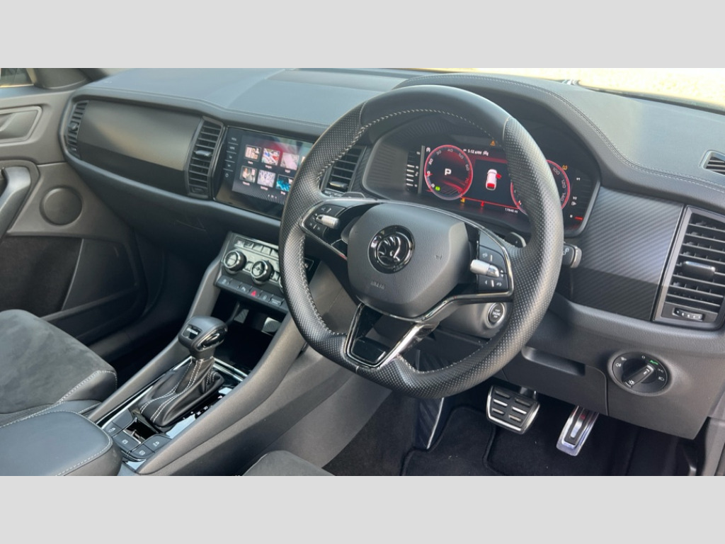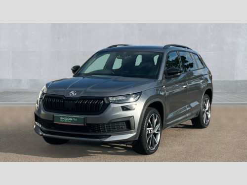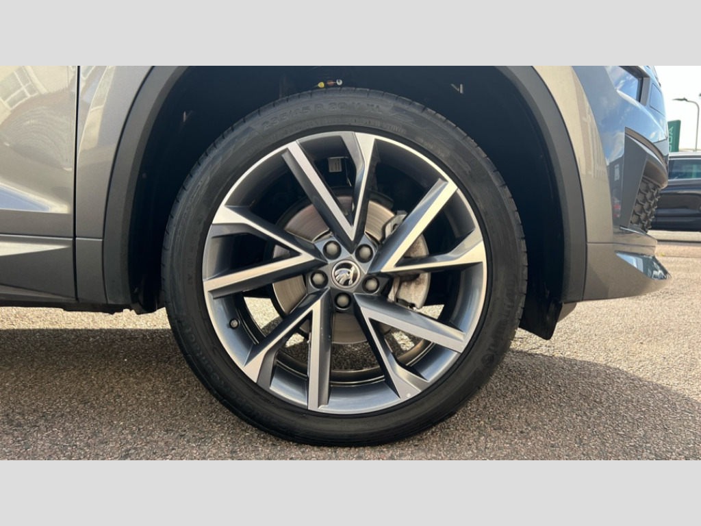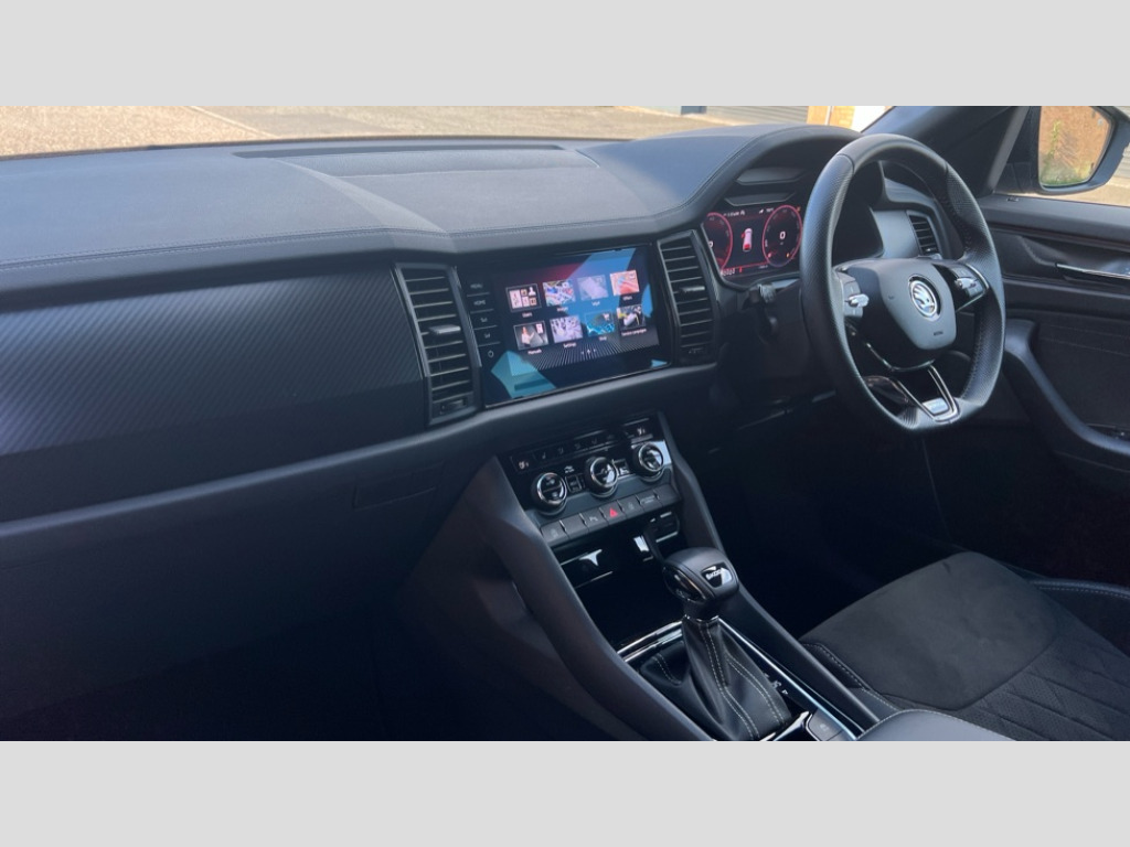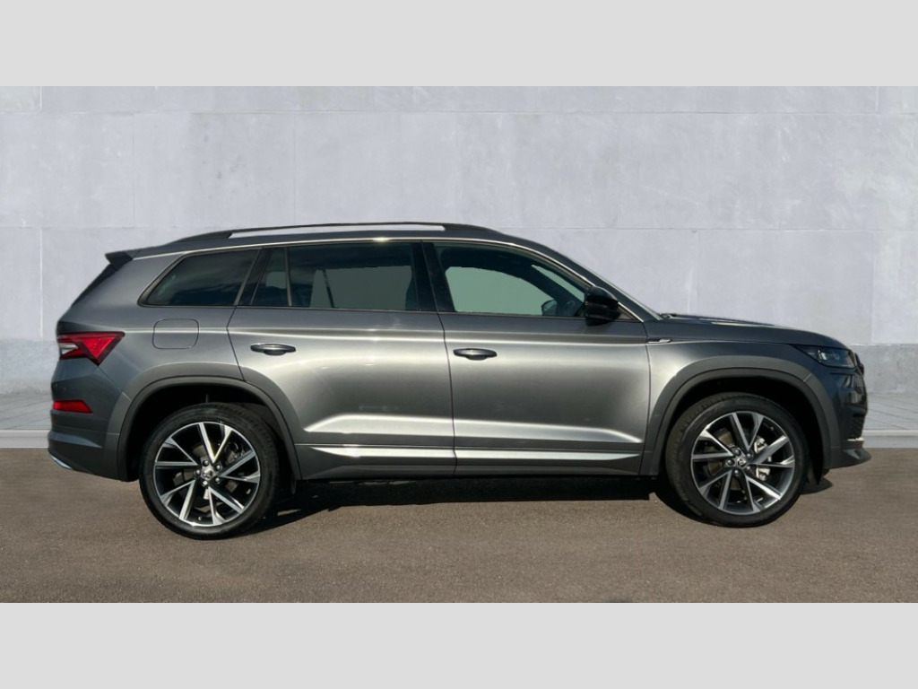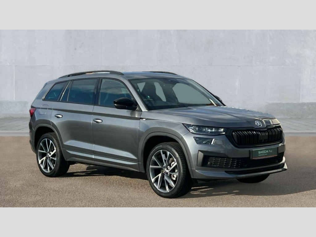 Skoda Kodiaq 1.5 TSI Sport Line 5dr DSG [7 Seat] Bluetooth system, Columbus satellite navigation with 9.2" touchscreen, integrated Wi-Fi, web radio, Digital voice enhancement, e call+, ECO Stop/start function, Exterior temperature indicator, Progressive steering, Rear view camera, Smartlink wireless for apple carplay and wired for android auto, Speed limiter, Tailgate unlocking from outside, USB C Port x 2 in front centre console, Virtual Cockpit - 10.25" digital display with additional sports design, Wireless charging, 8 Speakers, DAB Digital radio, Aero front windscreen wipers with intermittent function, Aero rear window wiper, Auto dimming rear view mirror, Black roof rails, Black sports styling including front grille and window surrounds, Black wheel arch surrounds, Body colour bumpers, Body colour door handles, Electric adjustable/heated/folding door mirrors, driver side auto dimming with boarding sports and memory function, Electric front and rear windows, Extended rear spoiler with finlets in gloss black, Front fog lights, Full LED matrix headlights with AFS (adaptive front light system), cornering function and AWL (all weather lighting system), Gloss black door mirrors, Headlight washers, Heated rear window, Invisible tailpipe, LED daytime running lights, LED rear fog light, LED third brake light in rear spoiler, Light assistant (coming/leaving home/tunnel light), Off-road style lower front bumper element, Privacy glass, Rain and light sensors, Rear diffuser, Rear LED lights (high functionality) with welcome effect and dynamic indicators, Rear side wing doors, Safety reflectors on front and rear doors, Sportline badge on front fender, Sports front and rear bumpers including lower rear chrome strip, Tailgate lettering in Black, Window control switches with black trim, 12V socket in boot, 2 rails with 2 hooks, 2 seat bench in 3rd row, 3 seat bench in 2nd row, 3 spoke leather multifunction sports steering wheel with DSG paddles, 4 foldable roof handles with rear coat hooks, 60:40 foldable rear seat with sliding adjustment and backrest angle adjustment, Aluminium pedals, Black roof headlining, Bottle holders in door panel in the 1.5 litre front and 1 litre rear, Cargo storage compartments, Chrome headlight control button, Chrome interior door handles, Coat hooks on B pillar, Covered storage compartment on driver side, Decorative door sill covers, Front and rear door armrest with black adductor trim, Front centre armrest with storage compartment, cup holder and 12V socket, Front courtesy lights, Gear shift lever with chrome frame and black gloss insert, Grey stitching in front and rear armrests and door armrests + door inserts, Height adjustable front headrests, Illuminated glovebox, Illuminated luggage compartment, Isofix child seat fittings in outer rear seats with top tether, Manually adjustable steering column, Microsuede door panels, Net programme in boot (1x horizontal Net, 2x vertical Nets), Overhead glasses storage compartment, Pollen filter, Rear centre armrest with cupholders, Single front passenger seat, Sliding trunk cover, Small Bags on the inner sides of the front backrests, Sports seats, Sunvisors with illuminated vanity mirrors, Three rear height adjustable headrests, Ticket holder on A Pillar, Umbrella in door panel, Variable boot floor, LED Interior light pack - Kodiaq, Auto door release and activation of warning lights in the event of an accident, Driver and front passenger airbag with knee airbag and front passenger airbag deactivation, Electronic parking brake with hill start assist, Emergency rear braking signal, ESC (incl. ABS+MSR+ASR+EDS+HBA+DSR+RBS+MKB), Front assist with autonomous emergency braking, Front side airbags with curtain airbags, Fuel cut off safety device, Height adjustable front 3 point seatbelts + pretensioners, Hill hold control, Rear disc brakes, Safety vest holder in door, Seat belt reminder for all seats, Three point rear seat belts, Two tone horn, Tyre pressure monitor, Alarm with interior monitoring and tilt sensor with safe function, Anti-theft wheel bolts, Immobiliser, Keyless entry and start system (KESSY), Remote central locking with 2 keys, Black air vent surround, Carbon finish dashboard and door inserts, Grey stitching in dashboard, 20" Vega Anthracite alloy wheels, Temporary spare wheel (space saver)