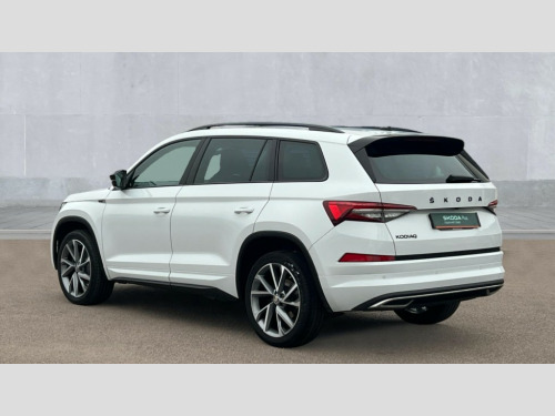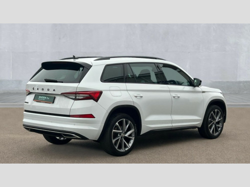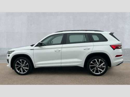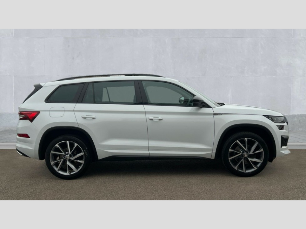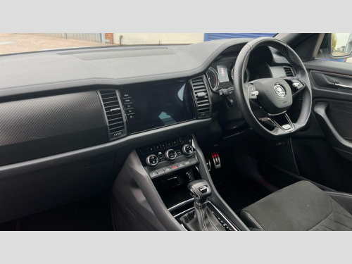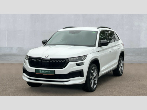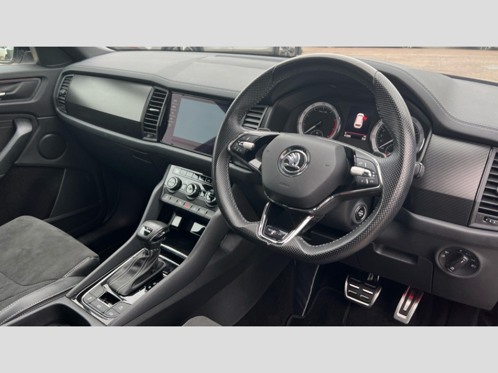 Skoda Kodiaq 1.5 TSI Sport Line 5dr DSG [7 Seat] Bluetooth system, Columbus satellite navigation with 9.2" touchscreen, integrated Wi-Fi, web radio, Digital voice enhancement, E-call, ECO Stop/start function, Exterior temperature indicator, Progressive steering, Rear view camera, Smartlink wireless for apple carplay and wired for android auto, Speed limiter, Tailgate unlocking from outside, USB C Port x 2 in front centre console, Wireless charging, 8 Speakers, DAB Digital radio, Aero front windscreen wipers with intermittent function, Aero rear window wiper, Auto dimming rear view mirror, Black roof rails, Black sports styling including front grille and window surrounds, Black wheel arch surrounds, Body colour bumpers, Body colour door handles, Electric adjustable/heated/folding door mirrors, driver side auto dimming with boarding sports and memory function, Electric front and rear windows, Extended rear spoiler with finlets in gloss black, Front fog lights, Full LED matrix headlights with AFS (adaptive front light system), cornering function and AWL (all weather lighting system), Gloss black door mirrors, Headlight washers, Heated rear window, Invisible tailpipe, LED daytime running lights, LED rear fog light, LED third brake light in rear spoiler, Light assistant (coming/leaving home/tunnel light), Off-road style lower front bumper element, Privacy glass, Rain and light sensors, Rear diffuser, Rear LED lights (high functionality) with welcome effect and dynamic indicators, Rear side wing doors, Safety reflectors on front and rear doors, Sportline badge on front fender, Sports front and rear bumpers including lower rear chrome strip, Tailgate lettering in Black, Window control switches with black trim, 12V socket in boot, 2 rails with 2 hooks, 2 seat bench in 3rd row, 3 seat bench in 2nd row, 4 foldable roof handles with rear coat hooks, 60:40 foldable rear seat with sliding adjustment and backrest angle adjustment, Aluminium pedals, Black roof headlining, Bottle holders in door panel in the 1.5 litre front and 1 litre rear, Cargo storage compartments, Chrome headlight control button, Chrome interior door handles, Coat hooks on B pillar, Covered storage compartment on driver side, Front centre armrest with storage compartment, cup holder and 12V socket, Front courtesy lights, Gear shift lever with chrome frame and black gloss insert, Grey stitching in front and rear armrests and door armrests + door inserts, Height adjustable front headrests, Illuminated and cooled glovebox, Illuminated luggage compartment, Isofix child seat fittings in outer rear seats with top tether, Manually adjustable steering column, Microsuede door panels, Net programme in boot (1x horizontal Net, 2x vertical Nets), Overhead glasses storage compartment, Pollen filter, Rear centre armrest with cupholders, Single front passenger seat, Sliding trunk cover, Small Bags on the inner sides of the front backrests, Sports seats, Sunvisors with illuminated vanity mirrors, Three rear height adjustable headrests, Ticket holder on A Pillar, Umbrella in door panel, Variable boot floor, LED Interior light pack - Kodiaq, Auto door release and activation of warning lights in the event of an accident, Child locks on rear doors, Driver and front passenger airbag with knee airbag and front passenger airbag deactivation, Electronic parking brake with hill start assist, Emergency rear braking signal, ESC (incl. ABS+MSR+ASR+EDS+HBA+DSR+RBS+MKB), Front assist with autonomous emergency braking, Front side airbags with curtain airbags, Fuel cut off safety device, Height adjustable front 3 point seatbelts + pretensioners, Hill hold control, Rear disc brakes, Safety vest holder in door, Seat belt reminder for all seats, Three point rear seat belts, Two tone horn, Tyre pressure monitor, Alarm with interior monitoring and tilt sensor with safe function, Anti-theft wheel bolts, Immobiliser, Keyless entry and start system (KESSY), Remote central locking with 2 keys, Black air vent surround, Carbon finish dashboard and door inserts, Grey stitching in dashboard, 20" Vega Anthracite alloy wheels, Temporary spare wheel (space saver)