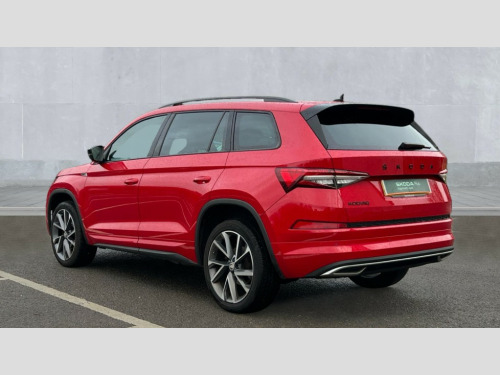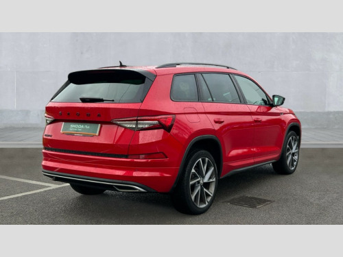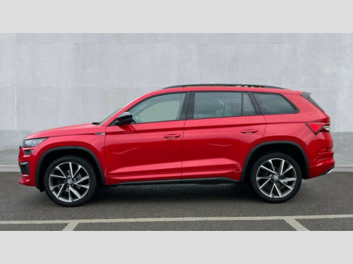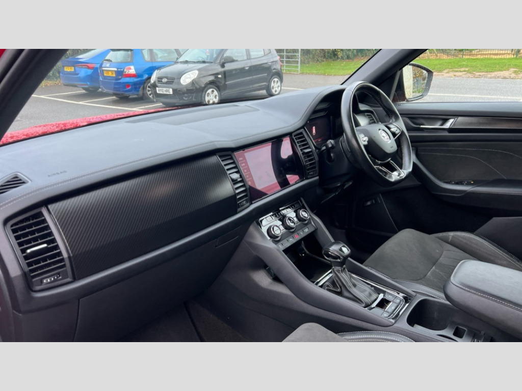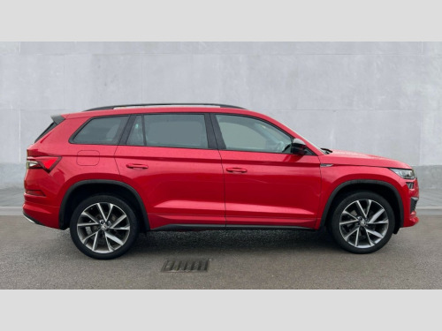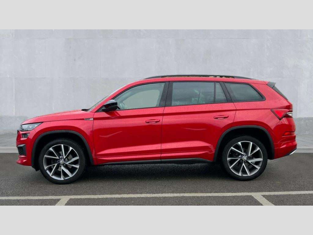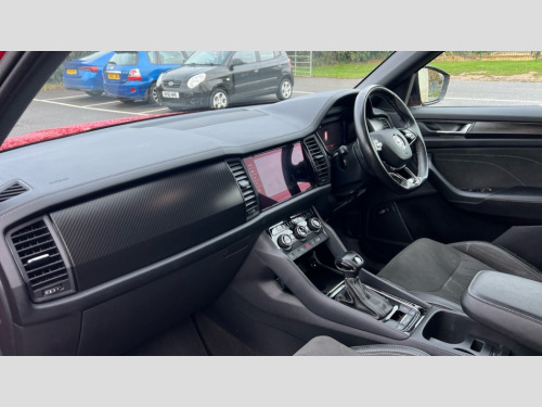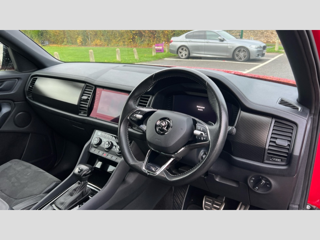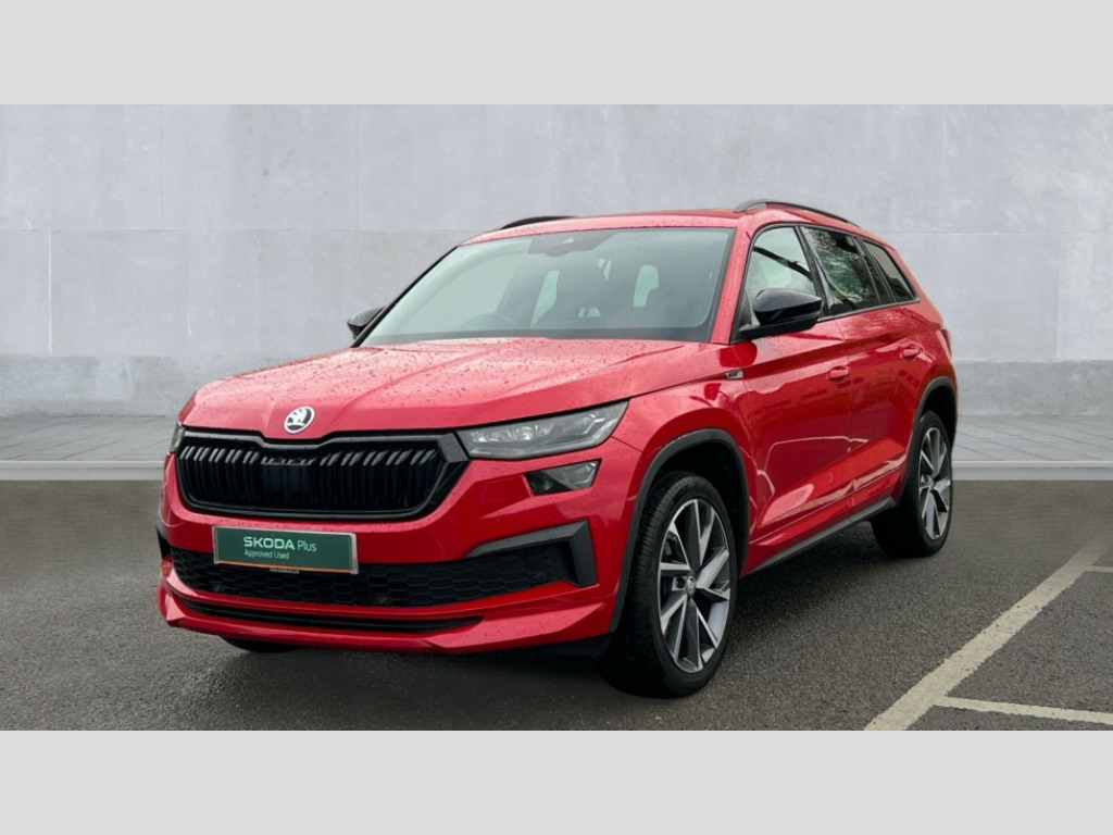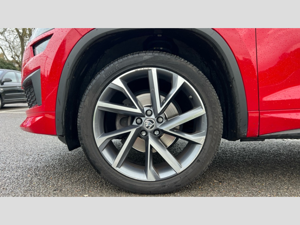 Skoda Kodiaq 1.5 TSI Sport Line 5dr DSG [7 Seat] Bluetooth system, Columbus satellite navigation with 9.2" touchscreen, integrated Wi-Fi, web radio, E-call, ECO Stop/start function, Exterior temperature indicator, Progressive steering, Rear view camera, Smartlink wireless for apple carplay and wired for android auto, Speed limiter, Tailgate unlocking from outside, USB C Port x 2 in front centre console, Wireless charging, 8 Speakers, DAB Digital radio, Aero front windscreen wipers with intermittent function, Aero rear window wiper, Auto dimming rear view mirror, Black roof rails, Black sports styling including front grille and window surrounds, Black wheel arch surrounds, Body colour bumpers, Body colour door handles, Electric adjustable/heated/folding door mirrors, driver side auto dimming with boarding sports and memory function, Electric front and rear windows, Extended rear spoiler with finlets in gloss black, Front fog lights, Full LED matrix headlights with AFS (adaptive front light system), cornering function and AWL (all weather lighting system), Gloss black door mirrors, Headlight washers, Heated rear window, Invisible tailpipe, LED daytime running lights, LED rear fog light, LED third brake light in rear spoiler, Light assistant (coming/leaving home/tunnel light), Off-road style lower front bumper element, Privacy glass, Rain and light sensors, Rear diffuser, Rear LED lights (high functionality) with welcome effect and dynamic indicators, Rear side wing doors, Safety reflectors on front and rear doors, Sportline badge on front fender, Sports front and rear bumpers including lower rear chrome strip, Tailgate lettering in Black, Window control switches with black trim, 12V socket in boot, 2 rails with 2 hooks, 2 seat bench in 3rd row, 3 seat bench in 2nd row, 4 foldable roof handles with rear coat hooks, 60:40 foldable rear seat with sliding adjustment and backrest angle adjustment, Aluminium pedals, Black roof headlining, Bottle holders in door panel in the 1.5 litre front and 1 litre rear, Cargo storage compartments, Chrome headlight control button, Chrome interior door handles, Coat hooks on B pillar, Covered storage compartment on driver side, Decorative door sills in the front and rear, Front centre armrest with storage compartment, cup holder and 12V socket, Front courtesy lights, Gear shift lever with chrome frame and black gloss insert, Grey stitching in front and rear armrests and door armrests + door inserts, Height adjustable front headrests, Illuminated and cooled glovebox, Illuminated luggage compartment, Isofix child seat fittings in outer rear seats with top tether, Manually adjustable steering column, Microsuede door panels, Net programme in boot (1x horizontal Net, 2x vertical Nets), Overhead glasses storage compartment, Pollen filter, Rear centre armrest with cupholders, Single front passenger seat, Sliding trunk cover, Small Bags on the inner sides of the front backrests, Sports seats, Sunvisors with illuminated vanity mirrors, Three rear height adjustable headrests, Ticket holder on A Pillar, Umbrella in door panel, Variable boot floor, LED Interior light pack - Kodiaq, Auto door release and activation of warning lights in the event of an accident, Child locks on rear doors, Driver and front passenger airbag with knee airbag and front passenger airbag deactivation, Electronic parking brake with hill start assist, Emergency rear braking signal, ESC (incl. ABS+MSR+ASR+EDS+HBA+DSR+RBS+MKB), Front assist with autonomous emergency braking, Front side airbags with curtain airbags, Fuel cut off safety device, Height adjustable front 3 point seatbelts + pretensioners, Hill hold control, Rear disc brakes, Safety vest holder in door, Seat belt reminder for all seats, Three point rear seat belts, Two tone horn, Tyre pressure monitor, Alarm with interior monitoring and tilt sensor with safe function, Anti-theft wheel bolts, Immobiliser, Keyless entry and start system (KESSY), Remote central locking with 2 keys, Black air vent surround, Carbon finish dashboard and door inserts, Grey stitching in dashboard, 20" Vega Anthracite alloy wheels, Temporary spare wheel (space saver)