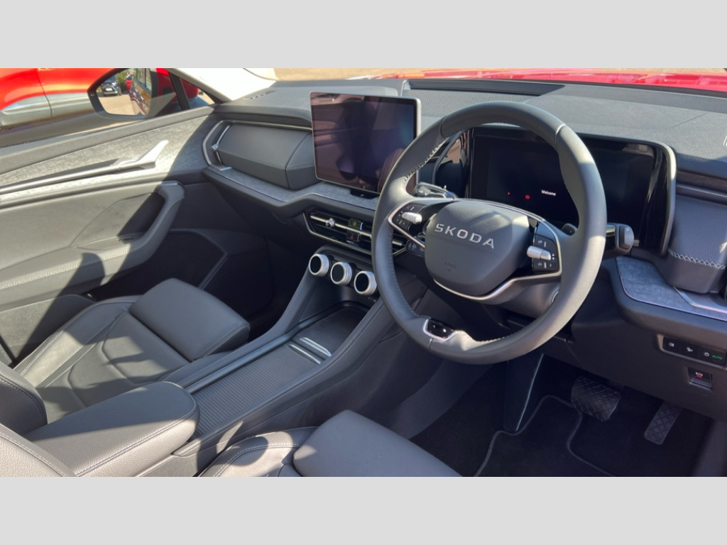 Skoda Kodiaq 2.0 TDI 193 SE L 4X4 5dr DSG [7 Seat] 13" satellite navigation touchscreen display, Blind spot detection with door exit warning, Bluetooth system, ChatGPT functionality, Driver alert - Fatigue and drowsiness monitor, Dry display cleaner, Emergency call, Front and rear parking sensors, Front cross traffic assist, Lane assist, PAS, Rear traffic assist, Tailgate unlocking from outside, Traffic sign recognition, USB C Port x 2 in front centre console, Virtual Cockpit - 10.25" digital display, Voice control system, Wireless charging for two smartphones (15W) with cooling function, Wireless SmartLink for Apple CarPlay and Android Auto, Stop/start function, 2x USB-C in the rear, DAB Digital radio, Aero front windscreen wipers with intermittent function, Auto dimming rear view mirror, AWL (all weather lighting) and all weather light with cornering function, Black wheel arch surrounds, Body colour bumpers, Body colour door mirrors and handles, Cornering light and poor weather light, Electric folding /adjustable/separted heated/folding door mirrors, auto dimming with boarding sports and memory function, Electric front and rear windows, Exterior black decorative trims, Heat insulating glass in windshield, Heated rear window, Ice scraper in fuel tank cap, Invisible tailpipe, LED daytime running lights, LED third brake light in rear spoiler, Light assistant with automatic headlight control and coming home feature, Logo projection in door mirrors, Privacy glass, Rear roof spoiler, Rear side wing doors, Rear window wiper, Red decorative strip between rear LED lights, Safety reflectors on front and rear doors, Unique dark chrome design logo on alloy wheels, Window control switches with black trim, Windscreen wipers with rain sensor, Without engine designation, 1.5l bottle holder points in all door, 1x centre rear reading light, 2 seat bench in 3rd row, 3 configurable smart dials with 32mm coloured display, 3 seat bench in 2nd row, 4 foldable roof handles with rear coat hooks, Ambient interior lighting - Dashboard, front-door stowage compartments, front and rear door panels and footwell lighting, Automatic gear selector on steering column, Chrome interior door handles, Driver/front passenger reading lights, Fabric headlining, Fixed bench 40:60:40 split folding backrests, Front and rear floor mats, Front centre armrest with jumbo box storage compartment, cup holder and 12V socket, Height adjustable front headrests, Isofix child seat fittings in outer middle row rear seats and front passenger with top tether, Manually adjustable steering column, Pollen filter, Rear centre armrest with cupholders, Rear seat boot backrest release, Single front passenger seat, Skoda lettering on steering wheel, Storage pocket including mobile phone pockets on the backs of the front seats, Sunvisors with illuminated vanity mirrors, Three rear height adjustable headrests, Ticket holder on A Pillar, Tri zone climate control, Umbrella in door panel x1 made from sustainable materials, Upper and lower glovebox with card holder and coin compartment, USB C port by rear view mirror for charging only (15W), Exterior styling pack - Kodiaq, Auto door release and activation of warning lights in the event of an accident, Driver and front passenger airbag with knee airbag and front passenger airbag deactivation, Electric child locks, Electronic parking brake, ESC (incl. ABS+EMD+MSR+ASR+EDL+HBA+DSR+RBS+ESBS+MCB+TSA+XDS), Front assist with braking reaction to vehicles, pedestrians and cyclists, Front disc brakes, Fuel cut off safety device, Height adjustable front 3 point seatbelts + pretensioners, Hill hold assist, Junction assist with automatic emergency braking, Rear disc brakes, Safety vest holder in door, Seat belt reminder for all seats, Three point rear seat belts, Two tone horn, Tyre pressure monitor, Anti-theft wheel bolts, Immobiliser, Remote central locking with 2 keys