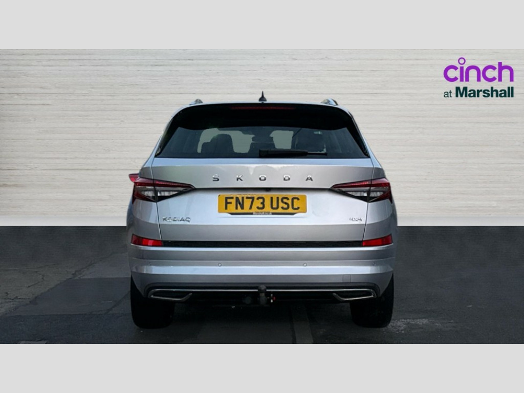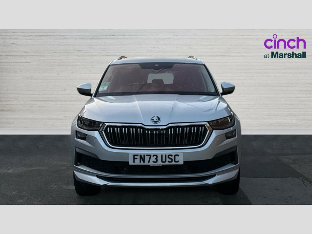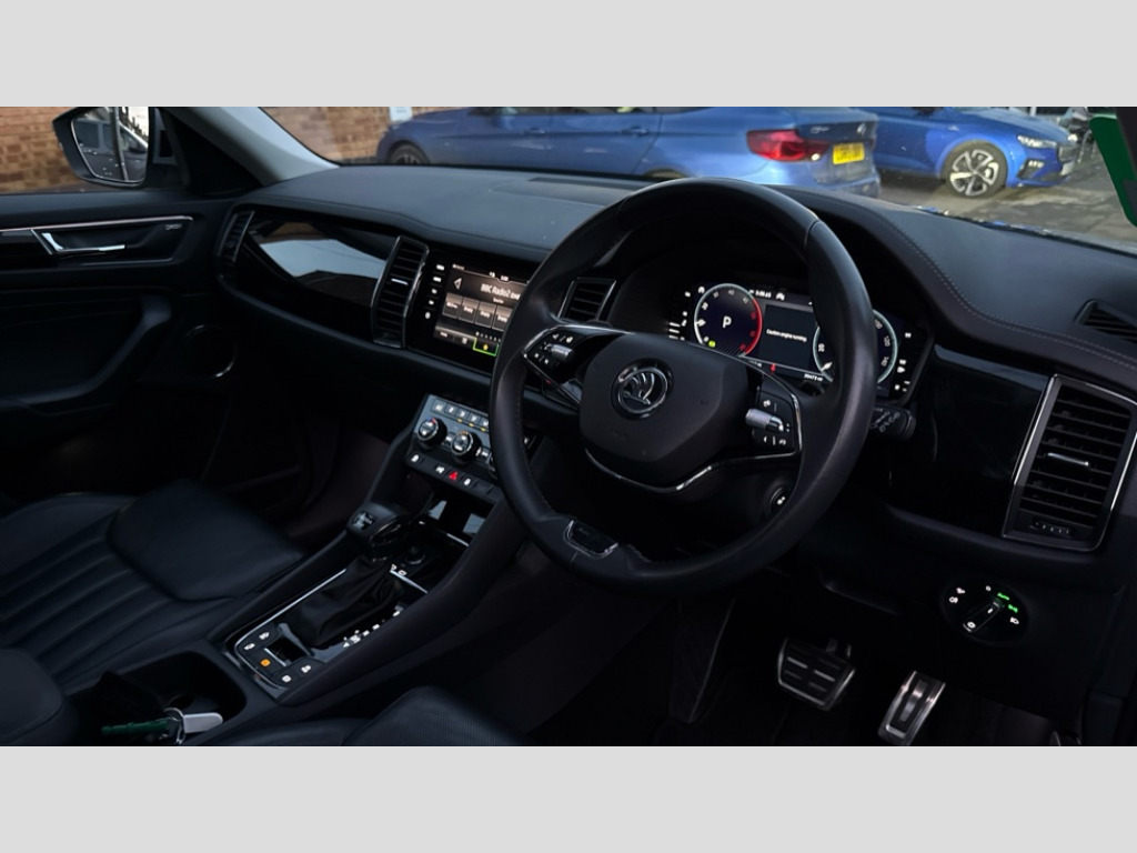 Wireless Charging Area view, Blind spot detection system, Bluetooth system, Columbus satellite navigation with 9.2" touchscreen, integrated Wi-Fi, web radio, Digital voice enhancement, e call+, ECO Stop/start function, Exterior temperature indicator, Progressive steering, Smartlink wireless for apple carplay and wired for android auto, Speed limiter, Tailgate unlocking from outside, USB C Port x 2 in front centre console, Virtual Cockpit - 10.25" digital display, Wireless charging, Canton sound system, DAB Digital radio, Aero front windscreen wipers with intermittent function, Aero rear window wiper, Auto dimming rear view mirror, Black wheel arch surrounds, Body colour bumpers, Body colour door mirrors and handles, Body colour door panels, Chrome front grille, Chrome roof rails with chrome window surround, Electric adjustable/heated/folding door mirrors, driver side auto dimming with boarding sports and memory function, Electric front and rear windows, Extended rear spoiler with finlets in gloss black, Front fog lights, Full LED matrix headlights with AFS (adaptive front light system), cornering function and AWL (all weather lighting system), Headlight washers, Heated rear window, Invisible tailpipe, L&K front and rear bumpers including lower rear chrome strip, LED daytime running lights, LED rear fog light, LED third brake light in rear spoiler, Light assistant (coming/leaving home/tunnel light), Off-road style lower front bumper element, Panoramic sunroof, Privacy glass, Rain and light sensors, Rear LED lights (high functionality) with welcome effect and dynamic indicators, Rear side wing doors, Safety reflectors on front and rear doors, Window control switches with black trim, Without engine designation, 12V socket in boot, 2 rails with 2 hooks, 2 seat bench in 3rd row, 3 seat bench in 2nd row, 4 foldable roof handles with rear coat hooks, 60:40 foldable rear seat with sliding adjustment and backrest angle adjustment, Aluminium pedals, Bottle holders in door panel in the 1.5 litre front and 1 litre rear, Cargo storage compartments, Chrome headlight control button, Chrome interior door handles, Coat hooks on B pillar, Covered storage compartment on driver side, Decorative door sill covers, Front and rear door armrest with black adductor trim, Front centre armrest with storage compartment, cup holder and 12V socket, Front courtesy lights, Gear shift lever with chrome frame and black gloss insert, Grey stitching in front and rear armrests and door armrests + door inserts, Height adjustable front headrests, Illuminated and cooled glovebox, Illuminated luggage compartment, Isofix child seat fittings in outer rear seats with top tether, Manually adjustable steering column, Net programme in boot (1x horizontal Net, 2x vertical Nets), Overhead glasses storage compartment, Pollen filter, Rear centre armrest with cupholders, Single front passenger seat, Sliding trunk cover, Small Bags on the inner sides of the front backrests, Sunvisors with illuminated vanity mirrors, Three rear height adjustable headrests, Ticket holder on A Pillar, Umbrella in door panel, Variable boot floor, LED Interior light pack - Kodiaq, Auto door release and activation of warning lights in the event of an accident, Child locks on rear doors, Driver and front passenger airbag with knee airbag and front passenger airbag deactivation, Electronic parking brake with hill start assist, Emergency rear braking signal, ESC (incl. ABS+MSR+ASR+EDS+HBA+DSR+RBS+MKB), Front assist with autonomous emergency braking, Front side airbags with curtain airbags, Fuel cut off safety device, Height adjustable front 3 point seatbelts + pretensioners, Hill hold control, Rear disc brakes, Safety vest holder in door, Seat belt reminder for all seats, Three point rear seat belts, Two tone horn, Tyre pressure monitor, Alarm with interior monitoring and tilt sensor with safe function, Anti-theft wheel bolts, Immobiliser, Keyless entry and start system (KESSY), Remote central locking with 2 keys, Grey stitching in dashboard, Piano black decorative inserts, Plaquette L&K front fenders, Temporary spare wheel (space saver)