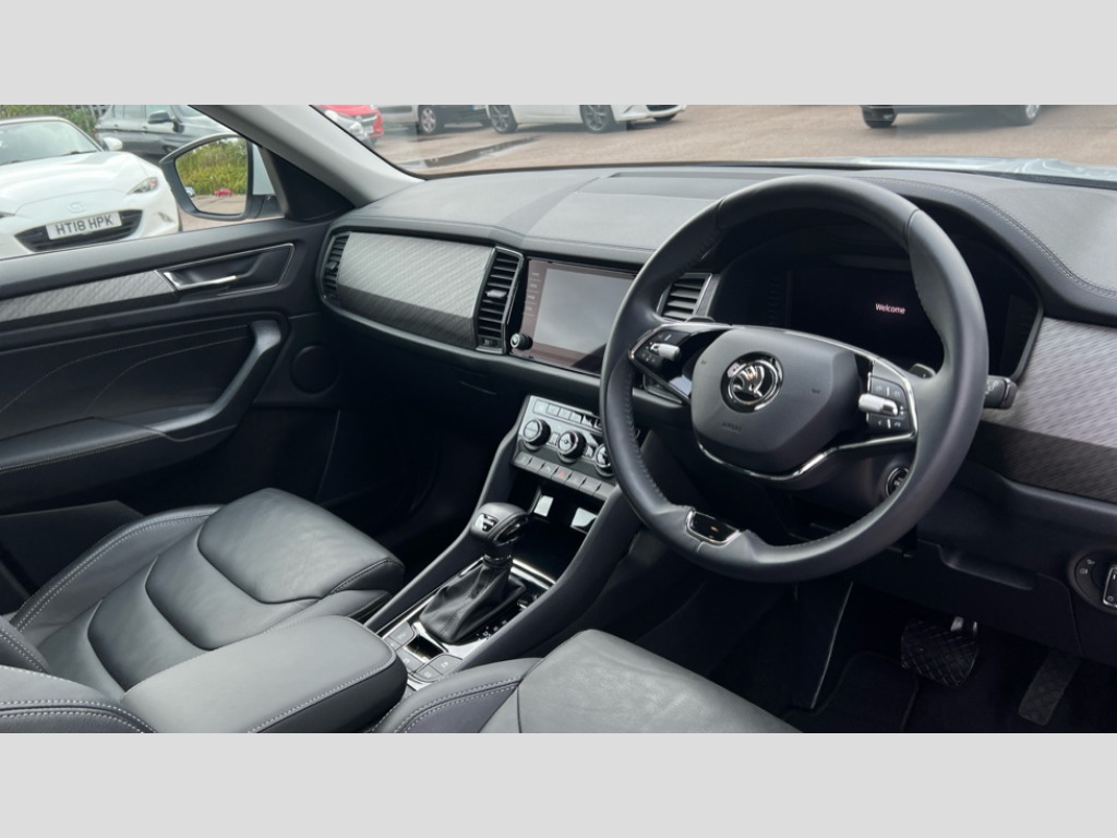 Skoda Kodiaq 2.0 TSI 190 SE L Executive 4x4 5dr DSG [7 Seat] Bluetooth system, Digital voice enhancement, e call+, ECO Stop/start function, Exterior temperature indicator, Rear view camera, Smartlink wireless for apple carplay and wired for android auto, Speed limiter, Tailgate unlocking from outside, USB C Port x 2 in front centre console, Virtual Cockpit - 10.25" digital display, Wireless charging, 8 Speakers, DAB Digital radio, Aero front windscreen wipers with intermittent function, Aero rear window wiper, Auto dimming rear view mirror, Black wheel arch surrounds, Body colour bumpers, Body colour door mirrors and handles, Chrome front grille, Chrome roof rails with chrome window surround, Electric adjustable/heated/folding door mirrors, driver side auto dimming with boarding sports and memory function, Electric front and rear windows, Extended rear spoiler with finlets in gloss black, Front fog lights, Full LED matrix headlights with AFS (adaptive front light system), cornering function and AWL (all weather lighting system), Headlight washers, Heated rear window, Invisible tailpipe, LED daytime running lights, LED rear fog light, LED third brake light in rear spoiler, Light assistant (coming/leaving home/tunnel light), Off-road style lower front bumper element, Privacy glass, Rain and light sensors, Rear LED lights (high functionality) with welcome effect and dynamic indicators, Rear side wing doors, Safety reflectors on front and rear doors, Window control switches with black trim, Without engine designation, 12V socket in boot, 2 rails with 2 hooks, 2 seat bench in 3rd row, 2 spoke multi-function leather steering wheel with paddle shift, 3 seat bench in 2nd row, 4 foldable roof handles with rear coat hooks, 60:40 foldable rear seat with sliding adjustment and backrest angle adjustment, Bottle holders in door panel in the 1.5 litre front and 1 litre rear, Cargo storage compartments, Chrome headlight control button, Chrome interior door handles, Coat hooks on B pillar, Covered storage compartment on driver side, Decorative door sill covers, Front and rear door armrest with black adductor trim, Front centre armrest with storage compartment, cup holder and 12V socket, Front courtesy lights, Gear shift lever with chrome frame and black gloss insert, Grey stitching in front and rear armrests and door armrests + door inserts, Height adjustable front headrests, Illuminated glovebox, Illuminated luggage compartment, Isofix child seat fittings in outer rear seats with top tether, Manually adjustable steering column, Net programme in boot (1x horizontal Net, 2x vertical Nets), Overhead glasses storage compartment, Pollen filter, Rear centre armrest with cupholders, Single front passenger seat, Sliding trunk cover, Small Bags on the inner sides of the front backrests, Sunvisors with illuminated vanity mirrors, Three rear height adjustable headrests, Ticket holder on A Pillar, Umbrella in door panel, Variable boot floor, Auto door release and activation of warning lights in the event of an accident, Driver and front passenger airbag with knee airbag and front passenger airbag deactivation, Electronic parking brake with hill start assist, Emergency rear braking signal, ESC (incl. ABS+MSR+ASR+EDS+HBA+DSR+RBS+MKB), Front assist with autonomous emergency braking, Front side airbags with curtain airbags, Fuel cut off safety device, Height adjustable front 3 point seatbelts + pretensioners, Hill hold control, Rear disc brakes, Safety vest holder in door, Seat belt reminder for all seats, Three point rear seat belts, Two tone horn, Tyre pressure monitor, Alarm with interior monitoring and tilt sensor with safe function, Anti-theft wheel bolts, Immobiliser, Keyless entry and start system (KESSY), Remote central locking with 2 keys, Grey stitching in dashboard, Linear diamonds decorative inserts, Temporary spare wheel (space saver)