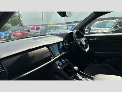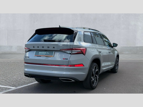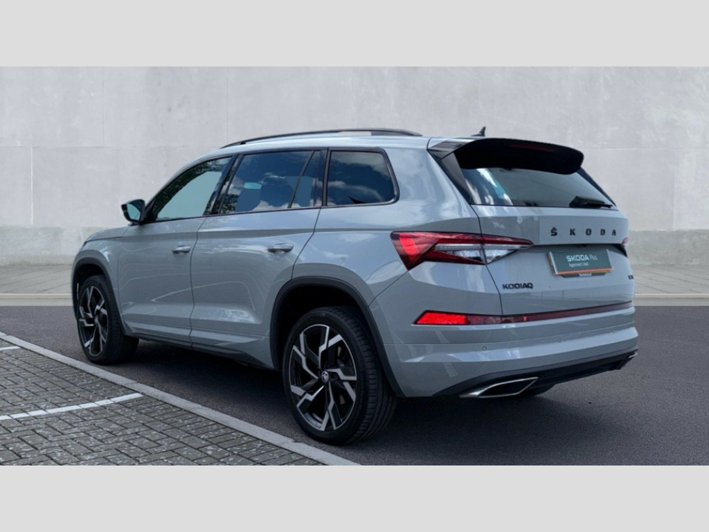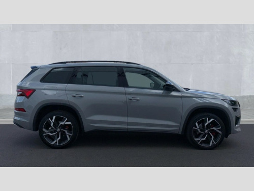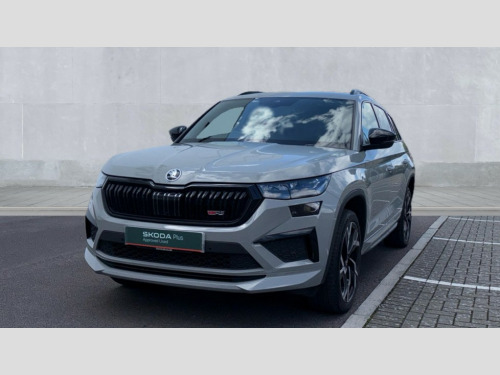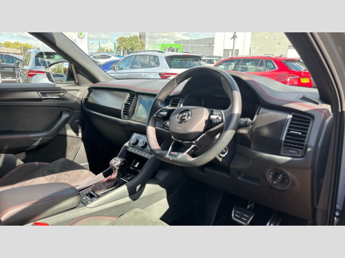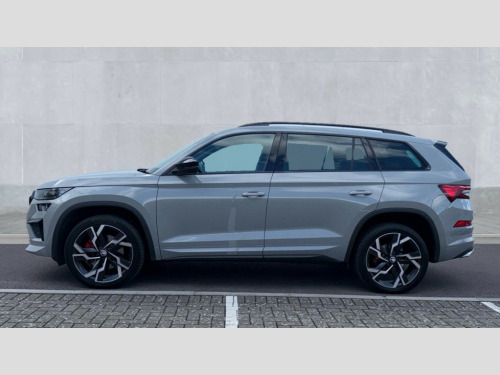 Skoda Kodiaq 2.0 TSI 245 vRS 4x4 5dr DSG [7 Seat] Bluetooth system, Columbus satellite navigation with 9.2" touchscreen, integrated Wi-Fi, web radio, Digital voice enhancement, e call+, ECO Stop/start function, Exterior temperature indicator, Progressive steering, Rear view camera, Smartlink wireless for apple carplay and wired for android auto, Speed limiter, Tailgate unlocking from outside, USB C Port x 2 in front centre console, Virtual Cockpit - 10.25" digital display, Wireless charging, Dynamic Chassis Control including off-road function, 8 Speakers, DAB Digital radio, Dynamic sound booster, Aero front windscreen wipers with intermittent function, Aero rear window wiper, Auto dimming rear view mirror, Black wheel arch surrounds, Body colour bumpers, Body colour door handles, Chrome exhaust tailpipe, Electric adjustable/heated/folding door mirrors, driver side auto dimming with boarding sports and memory function, Electric front and rear windows, Extended rear spoiler with finlets in gloss black, Front fog lights, Full LED matrix headlights with AFS (adaptive front light system), cornering function and AWL (all weather lighting system), Gloss black door mirrors, Gloss black roof rails, Heated rear window, LED daytime running lights, LED rear fog light, LED third brake light in rear spoiler, Light assistant (coming/leaving home/tunnel light), Off-road style lower front bumper element, Privacy glass, Rain and light sensors, Rear diffuser, Rear LED lights (high functionality) with welcome effect and dynamic indicators, Rear side wing doors, Safety reflectors on front and rear doors, Tailgate lettering in Black without 4x4 badge, vRS exterior design - vRS front and rear bumpers with vRS badging (gloss black on tailgate and chrome on radiator grille) + black window surround, Window control switches with black trim, Without engine designation, 12V socket in boot, 2 rails with 2 hooks, 2 seat bench in 3rd row, 3 seat bench in 2nd row, 3 spoke leather sports multi-function steering wheel with vRS logo and paddle, 4 foldable roof handles with rear coat hooks, 60:40 foldable rear seat with sliding adjustment and backrest angle adjustment, Aluminium pedals, Black roof headlining, Bottle holders in door panel in the 1.5 litre front and 1 litre rear, Cargo storage compartments, Chrome headlight control button, Chrome interior door handles, Coat hooks on B pillar, Covered storage compartment on driver side, Decorative door sill covers, Front and rear door armrest with black adductor trim, Front centre armrest with storage compartment, cup holder and 12V socket, Front courtesy lights, Gear shift lever with chrome frame and black gloss insert with vRS logo, Height adjustable front headrests, Illuminated glovebox, Illuminated luggage compartment, Isofix child seat fittings in outer rear seats with top tether, Manually adjustable steering column, Microsuede door panels with vRS black stitching, Net programme in boot (1x horizontal Net, 2x vertical Nets), Overhead glasses storage compartment, Pollen filter, Rear centre armrest with cupholders, Single front passenger seat, Sliding trunk cover, Small Bags on the inner sides of the front backrests, Sports seats, Sunvisors with illuminated vanity mirrors, Three rear height adjustable headrests, Ticket holder on A Pillar, Umbrella in door panel, Variable boot floor, vRS red stitching in front and rear armrests and door panel armrests, LED Interior light pack - Kodiaq, Auto door release and activation of warning lights in the event of an accident, Driver and front passenger airbag with knee airbag and front passenger airbag deactivation, Electronic parking brake with hill start assist, Emergency rear braking signal, ESC (incl. ABS+MSR+ASR+EDS+HBA+DSR+RBS+MKB), Front assist with autonomous emergency braking, Front side airbags with curtain airbags, Fuel cut off safety device, Height adjustable front 3 point seatbelts + pretensioners, Hill hold control, Rear disc brakes, Red brake calipers, Safety vest holder in door, Seat belt reminder for all seats, Three point rear seat belts, Two tone horn, Tyre pressure monitor, Alarm with interior monitoring and tilt sensor with safe function, Anti-theft wheel bolts, Immobiliser, Keyless entry and start system (KESSY), Remote central locking with 2 keys, Black air vent surround, Carbon finish dashboard and door inserts, Red stitching in dashboard, 20" Sagitarius anthracite alloy wheels with aero covers, Temporary spare wheel (space saver)