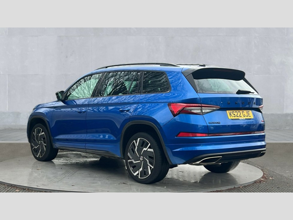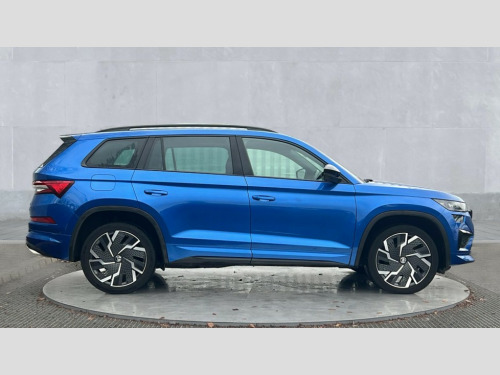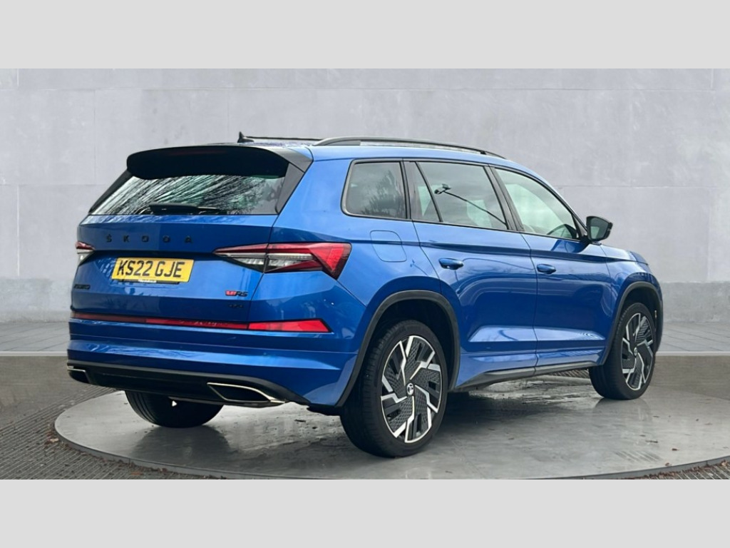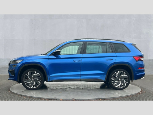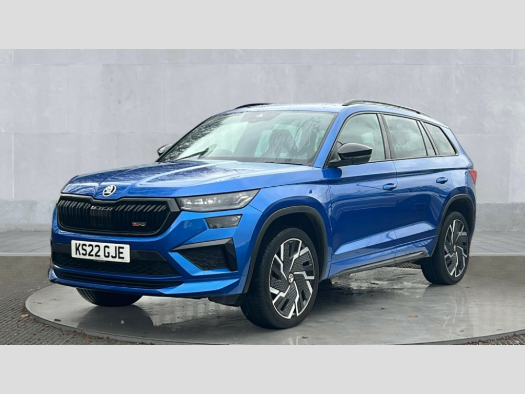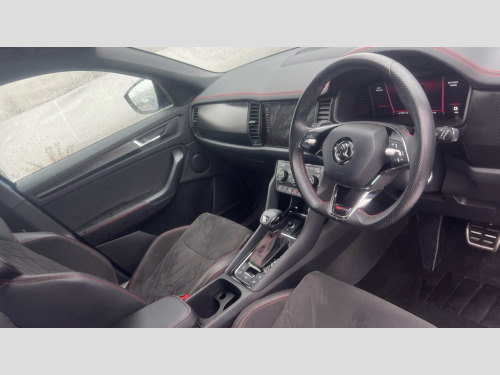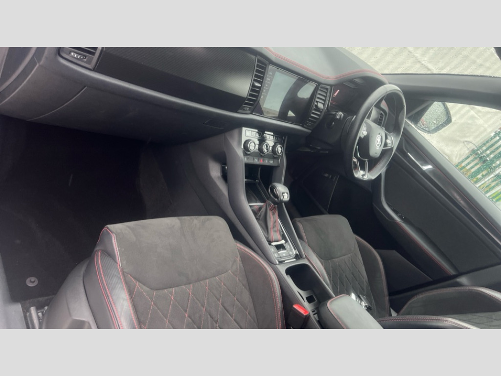 Skoda Kodiaq 2.0 TSI 245 vRS 4x4 5dr DSG [7 Seat] Bluetooth system, Columbus satellite navigation with 9.2" touchscreen, integrated Wi-Fi, web radio, Digital voice enhancement, E-call, ECO Stop/start function, Exterior temperature indicator, Progressive steering, Rear view camera, Smartlink wireless for apple carplay and wired for android auto, Speed limiter, Tailgate unlocking from outside, USB C Port x 2 in front centre console, Virtual Cockpit - 10.25" digital display, Wireless charging, Dynamic Chassis Control including off-road function, 8 Speakers, DAB Digital radio, Dynamic sound booster, Aero front windscreen wipers with intermittent function, Aero rear window wiper, Auto dimming rear view mirror, Black wheel arch surrounds, Body colour bumpers, Body colour door handles, Chrome exhaust tailpipe, Electric adjustable/heated/folding door mirrors, driver side auto dimming with boarding sports and memory function, Electric front and rear windows, Extended rear spoiler with finlets in gloss black, Front fog lights, Full LED matrix headlights with AFS (adaptive front light system), cornering function and AWL (all weather lighting system), Gloss black door mirrors, Gloss black roof rails, Heated rear window, LED daytime running lights, LED rear fog light, LED third brake light in rear spoiler, Light assistant (coming/leaving home/tunnel light), Off-road style lower front bumper element, Privacy glass, Rain and light sensors, Rear diffuser, Rear LED lights (high functionality) with welcome effect and dynamic indicators, Rear side wing doors, Safety reflectors on front and rear doors, vRS exterior design - vRS front and rear bumpers with vRS badging (gloss black on tailgate and chrome on radiator grille) + black window surround, Window control switches with black trim, Without engine designation, 12V socket in boot, 2 rails with 2 hooks, 2 seat bench in 3rd row, 3 seat bench in 2nd row, 4 foldable roof handles with rear coat hooks, 60:40 foldable rear seat with sliding adjustment and backrest angle adjustment, Aluminium pedals, Black roof headlining, Bottle holders in door panel in the 1.5 litre front and 1 litre rear, Cargo storage compartments, Chrome headlight control button, Chrome interior door handles, Coat hooks on B pillar, Covered storage compartment on driver side, Front centre armrest with storage compartment, cup holder and 12V socket, Front courtesy lights, Gear shift lever with chrome frame and black gloss insert with vRS logo, Height adjustable front headrests, Illuminated and cooled glovebox, Illuminated luggage compartment, Isofix child seat fittings in outer rear seats with top tether, Manually adjustable steering column, Microsuede door panels with vRS black stitching, Net programme in boot (1x horizontal Net, 2x vertical Nets), Overhead glasses storage compartment, Pollen filter, Rear centre armrest with cupholders, Single front passenger seat, Sliding trunk cover, Small Bags on the inner sides of the front backrests, Sports seats, Sunvisors with illuminated vanity mirrors, Three rear height adjustable headrests, Ticket holder on A Pillar, Umbrella in door panel, Variable boot floor, vRS red stitching in front and rear armrests and door panel armrests, LED Interior light pack - Kodiaq, Auto door release and activation of warning lights in the event of an accident, Child locks on rear doors, Driver and front passenger airbag with knee airbag and front passenger airbag deactivation, Electronic parking brake with hill start assist, Emergency rear braking signal, ESC (incl. ABS+MSR+ASR+EDS+HBA+DSR+RBS+MKB), Front assist with autonomous emergency braking, Front side airbags with curtain airbags, Fuel cut off safety device, Height adjustable front 3 point seatbelts + pretensioners, Hill hold control, Rear disc brakes, Red brake calipers, Safety vest holder in door, Seat belt reminder for all seats, Three point rear seat belts, Two tone horn, Tyre pressure monitor, Alarm with interior monitoring and tilt sensor with safe function, Anti-theft wheel bolts, Immobiliser, Keyless entry and start system (KESSY), Remote central locking with 2 keys, Black air vent surround, Carbon finish dashboard and door inserts, Red stitching in dashboard, 20" Sagitarius anthracite alloy wheels with aero covers, Temporary spare wheel (space saver)