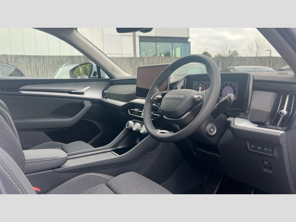 Skoda Kodiaq 1.5 TSI e-TEC SE 5dr DSG 13" satellite navigation touchscreen display, Blind spot detection with door exit warning, Bluetooth system, ChatGPT functionality, Driver alert - Fatigue and drowsiness monitor, Dry display cleaner, Emergency call, Front and rear parking sensors, Front cross traffic assist, Lane assist, PAS, Rear traffic assist, Rear view camera, Tailgate unlocking from outside, Traffic sign recognition, USB C Port x 2 in front centre console, Virtual Cockpit - 10.25" digital display, Voice control system, Wireless charging for two smartphones (15W) with cooling function, Wireless SmartLink for Apple CarPlay and Android Auto, Stop/start function, 2x USB-C in the rear, 8 Speakers, DAB Digital radio, Aero front windscreen wipers with intermittent function, All weather light, Auto dimming rear view mirror, Black wheel arch surrounds, Body colour bumpers, Body colour door mirrors and handles, Cornering light and poor weather light, Electric folding /adjustable/separted heated/folding door mirrors, auto dimming with boarding sports and memory function, Electric front and rear windows, Exterior black decorative trims, Heat insulating glass in windshield, Heated rear window, Ice scraper in fuel tank cap, Invisible tailpipe, LED daytime running lights, LED front fog lamps, LED Headlights, LED rear fog light, LED rear lights, LED third brake light in rear spoiler, Light assistant with automatic headlight control and coming home feature, Logo projection in door mirrors, Rear roof spoiler, Rear side wing doors, Rear window wiper, Safety reflectors on front and rear doors, Unique dark chrome design logo on alloy wheels, Window control switches with black trim, Windscreen wipers with rain sensor, Without engine designation, 1.5l bottle holder points in all door, 1x centre rear reading light, 3 configurable smart dials with 32mm coloured display, 3 seat bench in 2nd row, 4 foldable roof handles with rear coat hooks, Ambient interior lighting - Dashboard, front-door stowage compartments, front and rear door panels and footwell lighting, Automatic gear selector on steering column, Chrome interior door handles, Driver/front passenger reading lights, Fabric headlining, Fixed bench 40:60:40 split folding backrests, Front and rear floor mats, Front centre armrest with jumbo box storage compartment, cup holder and 12V socket, Height adjustable front headrests, Isofix child seat fittings in outer rear seats and front passenger with top tether, Manual height adjustment for front passenger seats and thigh support extender, Manual lumbar support for front passenger seat, Manually adjustable steering column, Pollen filter, Rear centre armrest with cupholders, Rear seat boot backrest release, Single front passenger seat, Skoda lettering on steering wheel, Storage pocket including mobile phone pockets on the backs of the front seats, Sunvisors with illuminated vanity mirrors, Three rear height adjustable headrests, Ticket holder on A Pillar, Tri zone climate control, Umbrella in door panel x1 made from sustainable materials, Upper and lower glovebox with card holder and coin compartment, USB C port by rear view mirror for charging only (15W), Auto door release and activation of warning lights in the event of an accident, Driver and front passenger airbag with knee airbag and front passenger airbag deactivation, Electric child locks, Electronic parking brake, ESC (incl. ABS+EMD+MSR+ASR+EDL+HBA+DSR+RBS+ESBS+MCB+TSA+XDS), Front assist with braking reaction to vehicles, pedestrians and cyclists, Front disc brakes, Fuel cut off safety device, Height adjustable front 3 point seatbelts + pretensioners, Hill hold assist, Junction assist with automatic emergency braking, Rear disc brakes, Safety vest holder in door, Seat belt reminder for all seats, Three point rear seat belts, Two tone horn, Tyre pressure monitor, Alarm with interior monitoring and tilt sensor with safe function, Anti-theft wheel bolts, Immobiliser, Remote central locking with 2 keys, Tool kit