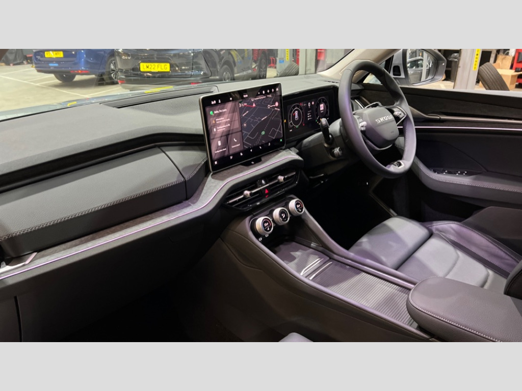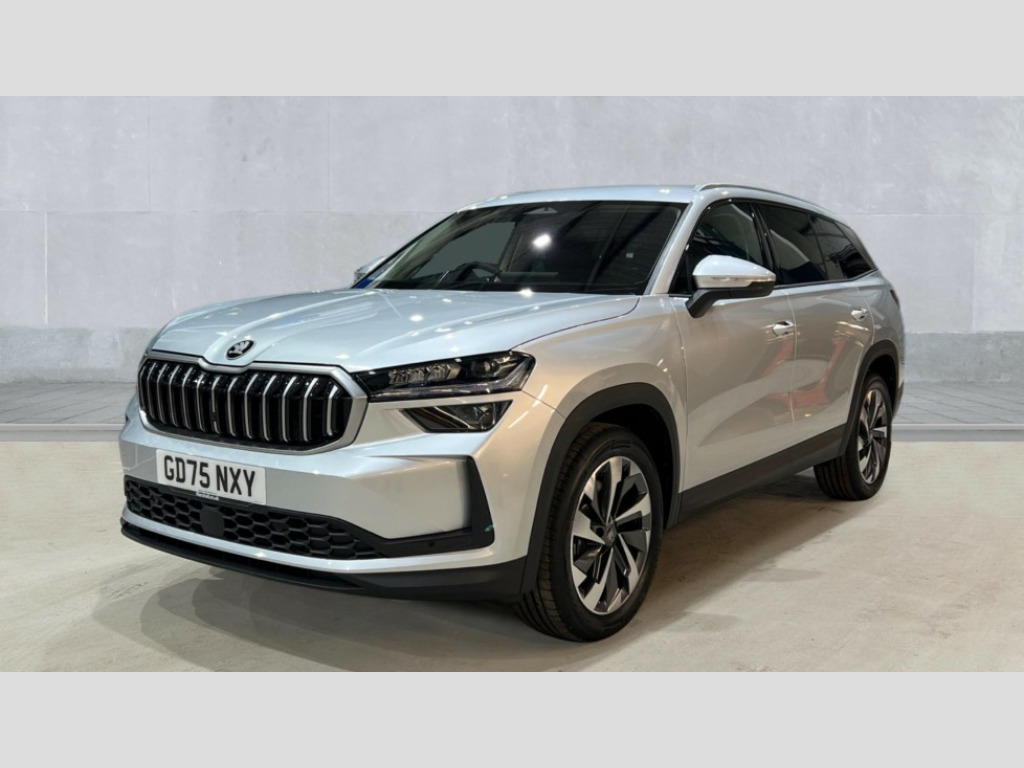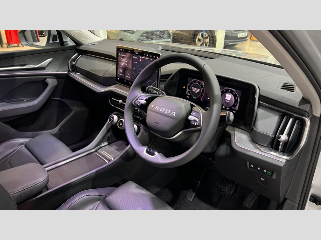 Skoda Kodiaq 1.5 TSI e-TEC SE L 5dr DSG [7 Seat] 13" satellite navigation touchscreen display, Blind spot detection with door exit warning, Bluetooth system, ChatGPT functionality, Driver alert - Fatigue and drowsiness monitor, Dry display cleaner, Emergency call, Front and rear parking sensors, Front cross traffic assist, Lane assist, PAS, Rear traffic assist, Tailgate unlocking from outside, Traffic sign recognition, USB C Port x 2 in front centre console, Virtual Cockpit - 10.25" digital display, Voice control system, Wireless charging for two smartphones (15W) with cooling function, Wireless SmartLink for Apple CarPlay and Android Auto, Stop/start function, 2x USB-C in the rear, DAB Digital radio, Aero front windscreen wipers with intermittent function, Auto dimming rear view mirror, AWL (all weather lighting) and all weather light with cornering function, Black wheel arch surrounds, Body colour bumpers, Body colour door mirrors and handles, Cornering light and poor weather light, Electric folding /adjustable/separted heated/folding door mirrors, auto dimming with boarding sports and memory function, Electric front and rear windows, Exterior black decorative trims, Front grille with horizontal light strip, Heat insulating glass in windshield, Heated rear window, Ice scraper in fuel tank cap, Invisible tailpipe, LED daytime running lights, LED matrix headlights with AFS and LED fog lights, LED rear light with welcome effect and dynamic turn signals, LED third brake light in rear spoiler, Light assistant with automatic headlight control and coming home feature, Logo projection in door mirrors, Multiple matrix beam, Privacy glass, Rear roof spoiler, Rear side wing doors, Rear window wiper, Red decorative strip between rear LED lights, Safety reflectors on front and rear doors, Unique dark chrome design logo on alloy wheels, Window control switches with black trim, Windscreen wipers with rain sensor, Without engine designation, 1.5l bottle holder points in all door, 1x centre rear reading light, 2 seat bench in 3rd row, 2 spoke multi-function leather heated steering wheel with paddle shift, 3 configurable smart dials with 32mm coloured display, 3 seat bench in 2nd row, 4 foldable roof handles with rear coat hooks, Ambient interior lighting - Dashboard, front-door stowage compartments, front and rear door panels and footwell lighting, Automatic gear selector on steering column, Chrome interior door handles, Driver/front passenger reading lights, Fabric headlining, Fixed bench 40:60:40 split folding backrests, Front and rear floor mats, Front centre armrest with jumbo box storage compartment, cup holder and 12V socket, Height adjustable front headrests, Isofix child seat fittings in outer middle row rear seats and front passenger with top tether, Manually adjustable steering column, Pollen filter, Rear centre armrest with cupholders, Rear seat boot backrest release, Single front passenger seat, Skoda lettering on steering wheel, Storage pocket including mobile phone pockets on the backs of the front seats, Sunvisors with illuminated vanity mirrors, Three rear height adjustable headrests, Ticket holder on A Pillar, Tri zone climate control, Umbrella in door panel x1 made from sustainable materials, Upper and lower glovebox with card holder and coin compartment, USB C port by rear view mirror for charging only (15W), Exterior styling pack - Kodiaq, Auto door release and activation of warning lights in the event of an accident, Driver and front passenger airbag with knee airbag and front passenger airbag deactivation, Electric child locks, Electronic parking brake, ESC (incl. ABS+EMD+MSR+ASR+EDL+HBA+DSR+RBS+ESBS+MCB+TSA+XDS), Front assist with braking reaction to vehicles, pedestrians and cyclists, Front disc brakes, Fuel cut off safety device, Height adjustable front 3 point seatbelts + pretensioners, Hill hold assist, Junction assist with automatic emergency braking, Rear disc brakes, Safety vest holder in door, Seat belt reminder for all seats, Three point rear seat belts, Two tone horn, Tyre pressure monitor, Anti-theft wheel bolts, Immobiliser, Remote central locking with 2 keys