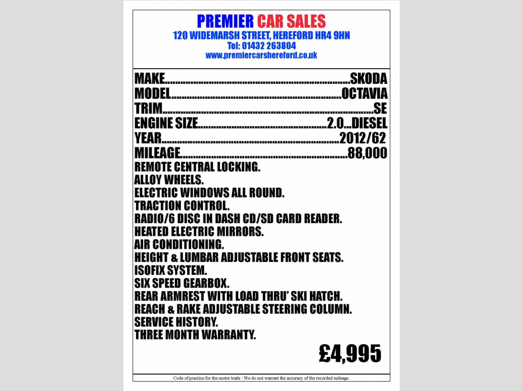 This 2012 Skoda Octavia 2.0 TDI SE Estate is currently available for £4,995 in Hereford Herefordshire with Diesel engine and Manual gearbox. For more information or to arrange a viewing, click here to send us an email using form below.