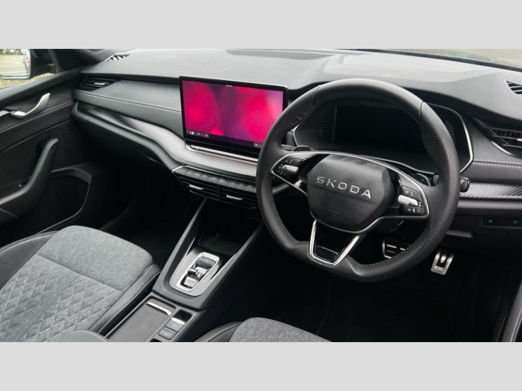 Skoda Octavia 1.5 TSI 150 e-TEC Sportline 5dr DSG 1x USB Typc C port in rear view mirror, 4x USB Type C ports - 2x in front centre console and 2x in rear (45W), Drive mode selection, Driver fatigue sensor, eCall emergency system, Front assist system, Progressive dynamic steering, Traffic sign recognition, Turn Assist, Virtual Cockpit - 10.25" digital display, Voice control system, Wireless charging (15W) with cooling function, Wireless SmartLink for Apple CarPlay and Android Auto, Sports suspension with 15mm lower, 13" touchscreen display with navigation, DAB Digital radio, Aero front windscreen wipers with intermittent function, Auto dimming rear view mirror, Body colour bumpers, Body colour door handles, Electric front and rear windows, Exterior gloss black sports styling including front grille, window surrounds, door mirrors and badging, Gloss black diffuser, Gloss black roof rails, Gloss black spoiler, Heated rear windscreen, High beam control, High level third brake light, Ice scraper in fuel cap, LED daytime running lights, Logo projection in front doors, Rain and light sensors, Rear fog light on one side, Rear privacy glass, Rear side wing doors, Rear window wiper, 12 volt socket in boot, 3 rear headrests, 3 seat bench in 2nd row, 4 foldable roof handles, Aluminium pedals, Front head restraints, Front sport seats, Heated front seats, Illuminated glovebox, Interior door handles in dark chrome, Jumbo Box storage, Luggage compartment lighting x2 lights, Mechanical rear seat release from boot, Single front passenger seat, Steering wheel in black leather with black stitching, Storage compartments in left and right of boot, Sun visors with mirrors, Sunglasses storage, Ticket holder, Umbrella in door panel, Unsplit rear bench seat, split folding backrest with centre armrest with cupholder, SportLine Design Selection pack - Octavia, 3x3 point rear seat belts, Alarm with interior monitoring, tilt sensor and back up horn, Curtain airbags and front side airbags, Driver and front passenger airbags, Drivers knee airbag, Electronic parking brake, ESC including ABS, EBV, MSR, ASR, EDS, HBA, DSR, Front central airbag, Hill hold assist, ISOFIX on front passenger seat and outer rear seats, Passenger airbag deactivate switch, Three point seat belts in front and rear, Two tone horn, Tyre pressure monitor, Visual and acoustic seat belt reminder, Warning reflectors in front door, Anti-theft wheel bolts, Keyless start/stop, Remote central locking, Gloss black air vent surrounds