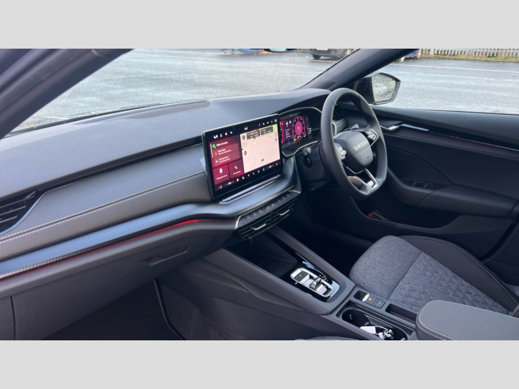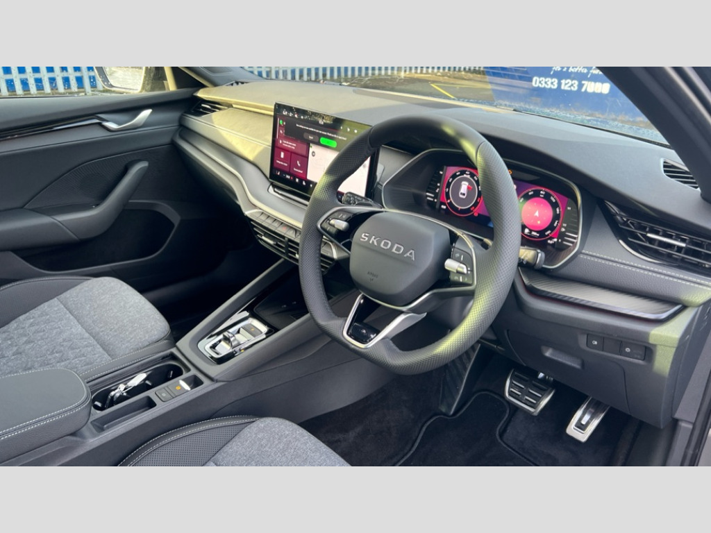 Skoda Octavia 1.5 TSI 150 e-TEC Sportline 5dr DSG 1x USB Typc C port in rear view mirror, 4x USB Type C ports - 2x in front centre console and 2x in rear (45W), Drive mode selection, Driver fatigue sensor, eCall emergency system, Front assist system, Progressive dynamic steering, Traffic sign recognition, Turn Assist, Virtual Cockpit - 10.25" digital display, Voice control system, Wireless charging (15W) with cooling function, Wireless SmartLink for Apple CarPlay and Android Auto, Sports suspension with 15mm lower, 13" touchscreen display with navigation, DAB Digital radio, Aero front windscreen wipers with intermittent function, Auto dimming rear view mirror, Body colour bumpers, Body colour door handles, Chrome strip in lower front bumper, Electric front and rear windows, Exterior gloss black sports styling including front grille, window surrounds, door mirrors and badging, Gloss black diffuser, Gloss black roof rails, Gloss black spoiler, Heated rear windscreen, High beam control, High level third brake light, Ice scraper in fuel cap, LED daytime running lights, Logo projection in front doors, Rain and light sensors, Rear fog light on one side and reversing lights on both sides, Rear privacy glass, Rear side wing doors, Rear window wiper, 12 volt socket in boot, 3 rear headrests, 3 seat bench in 2nd row, 4 foldable roof handles, Aluminium pedals, Front head restraints, Front sport seats, Heated front seats, Illuminated glovebox, Interior door handles in dark chrome, Jumbo Box storage, Luggage compartment lighting x2 lights, Mechanical rear seat release from boot, Single front passenger seat, Steering wheel in black leather with black stitching, Storage compartments in left and right of boot, Sun visors with mirrors, Sunglasses storage, Three spoke leather sports multifunction steering wheel with paddles, Ticket holder, Umbrella in door panel, Unsplit rear bench seat, split folding backrest with centre armrest with cupholder, SportLine Design Selection pack - Octavia, 3x3 point rear seat belts, Alarm with interior monitoring, tilt sensor and back up horn, Curtain airbags and front side airbags, Driver and front passenger airbags, Drivers knee airbag, Electronic parking brake, ESC including ABS, EBV, MSR, ASR, EDS, HBA, DSR, Front central airbag, Hill hold assist, ISOFIX on front passenger seat and outer rear seats, Passenger airbag deactivate switch, Three point seat belts in front and rear, Two tone horn, Tyre pressure monitor, Visual and acoustic seat belt reminder, Warning reflectors in front door, Anti-theft wheel bolts, Keyless entry and start/stop, Remote central locking, Gloss black air vent surrounds