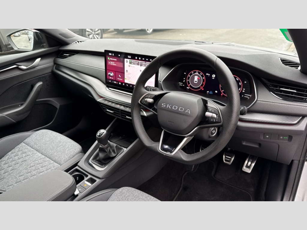 Three-Spoke Leather Sports Multifunction Steering Wheel 1x USB Typc C port in rear view mirror, 4x USB Type C ports - 2x in front centre console and 2x in rear (45W), Drive mode selection, Driver fatigue sensor, eCall emergency system, Front and rear parking sensors with manoeuvre assist, Front assist system, Progressive dynamic steering, Traffic sign recognition, Turn Assist, Virtual Cockpit - 10.25" digital display, Voice control system, Wireless charging (15W) with cooling function, Wireless SmartLink for Apple CarPlay and Android Auto, Sports suspension with 15mm lower, 13" touchscreen display with navigation, DAB Digital radio, Aero front windscreen wipers with intermittent function, Auto dimming rear view mirror, Body colour bumpers, Body colour door handles, Electric front and rear windows, Exterior gloss black sports styling including front grille, window surrounds, door mirrors and badging, Gloss black diffuser, Gloss black roof rails, Gloss black spoiler, Heated rear windscreen, High beam control, High level third brake light, Ice scraper in fuel cap, LED daytime running lights, Logo projection in front doors, Rain and light sensors, Rear fog light on one side, Rear privacy glass, Rear side wing doors, Rear window wiper, 12 volt socket in boot, 3 rear headrests, 3 seat bench in 2nd row, 4 foldable roof handles, Aluminium pedals, Front head restraints, Front sport seats, Heated front seats, Illuminated glovebox, Interior door handles in dark chrome, Jumbo Box storage, Luggage compartment lighting x2 lights, Mechanical rear seat release from boot, Single front passenger seat, Steering wheel in black leather with black stitching, Storage compartments in left and right of boot, Sun visors with mirrors, Sunglasses storage, Ticket holder, Umbrella in door panel, Unsplit rear bench seat, split folding backrest with centre armrest with cupholder, SportLine Design Selection pack - Octavia, 3x3 point rear seat belts, Alarm with interior monitoring, tilt sensor and back up horn, Curtain airbags and front side airbags, Driver and front passenger airbags, Drivers knee airbag, Electronic parking brake, ESC including ABS, EBV, MSR, ASR, EDS, HBA, DSR, Front central airbag, Hill hold assist, ISOFIX on front passenger seat and outer rear seats, Passenger airbag deactivate switch, Three point seat belts in front and rear, Two tone horn, Tyre pressure monitor, Visual and acoustic seat belt reminder, Warning reflectors in front door, Anti-theft wheel bolts, Keyless start/stop, Remote central locking, Gloss black air vent surrounds