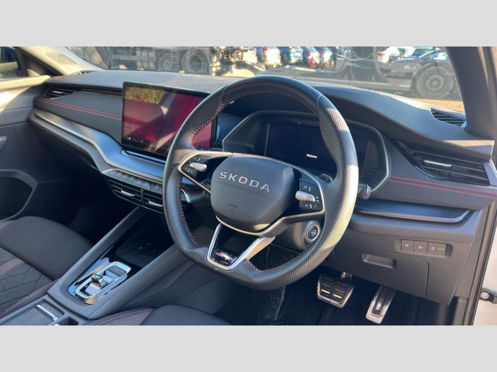 Skoda Octavia 2.0 TSI vRS 5dr DSG 1x USB Typc C port in rear view mirror, 4x USB Type C ports - 2x in front centre console and 2x in rear (45W), Drive mode selection, Driver fatigue sensor, eCall emergency system, Electrically operated boot with virtual pedal, Front assist system, Progressive dynamic steering, Traffic sign recognition, Turn Assist, Virtual Cockpit - 10.25" digital display, Voice control system, Wireless charging (15W) with cooling function, Wireless SmartLink for Apple CarPlay and Android Auto, Electronically controlled limited slip differential, vRS suspension, 13" touchscreen display with navigation, DAB Digital radio, Aero front windscreen wipers with intermittent function, Auto dimming rear view mirror, Black sport exhaust pipes, Body colour bumpers, Body colour door handles, Electric front and rear windows, Exterior gloss black sports styling including front grille, window surrounds, door mirrors and badging, Gloss black diffuser, Gloss black spoiler, Heated rear windscreen, High beam control, High level third brake light, Ice scraper in fuel cap, LED daytime running lights, Logo projection in front doors, Rain and light sensors, Rear fog light on one side, Rear privacy glass, Rear side wing doors, Unique vRS bumpers and exterior styling, 12 volt socket in boot, 3 rear headrests, 3 seat bench in 2nd row, 4 foldable roof handles, Aluminium pedals, Front head restraints, Front sport seats, Heated front seats, Illuminated glovebox, Interior door handles in dark chrome, Jumbo Box storage, Luggage compartment lighting x2 lights, Mechanical rear seat release from boot, Parcel shelf - folding, Single front passenger seat, Steering wheel in black leather with black stitching, Storage compartments in left and right of boot, Sun visors with mirrors, Sunglasses storage, Ticket holder, Umbrella in door panel, Unsplit rear bench seat, split folding backrest with centre armrest with cupholder, Waste bin in door panel, Comfort package - Octavia, Family package - Octavia, Light and view package plus - Octavia, vRS Design Selection pack - Octavia, 3x3 point rear seat belts, Alarm with interior monitoring, tilt sensor and back up horn, Curtain airbags and front side airbags, Driver and front passenger airbags, Drivers knee airbag, Electronic parking brake, ESC including ABS, EBV, MSR, ASR, EDS, HBA, DSR, Front central airbag, Hill hold assist, ISOFIX on front passenger seat and outer rear seats, Passenger airbag deactivate switch, Red brake calipers, Three point seat belts in front and rear, Two tone horn, Tyre pressure monitor, Visual and acoustic seat belt reminder, Warning reflectors in front door, Anti-theft wheel bolts, Keyless start/stop, Remote central locking, Gloss black air vent surrounds, 19" Elias anthracite alloy wheels