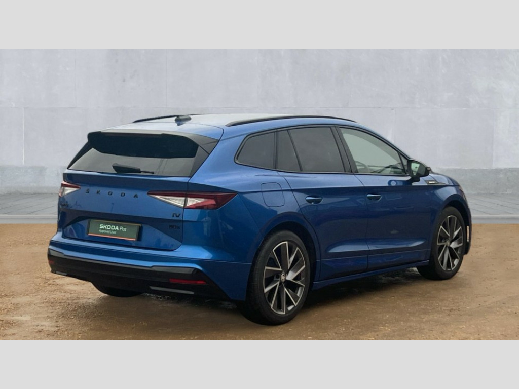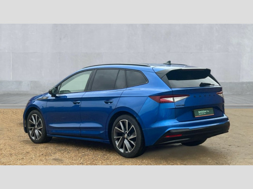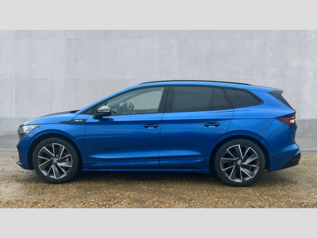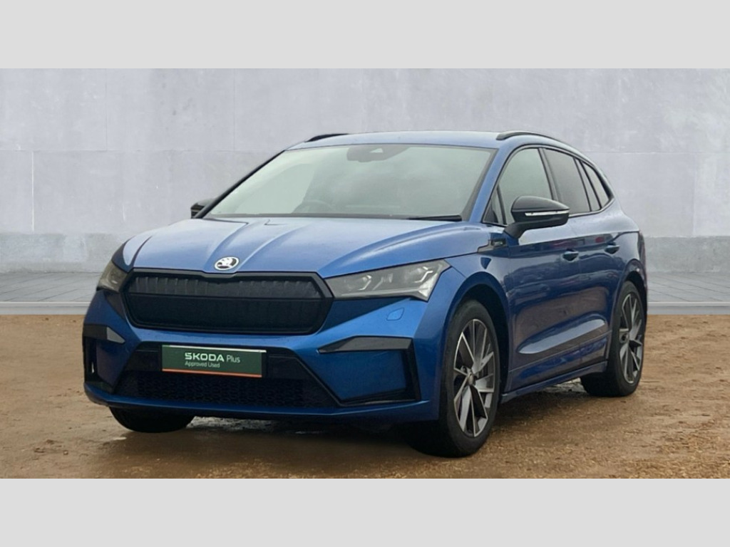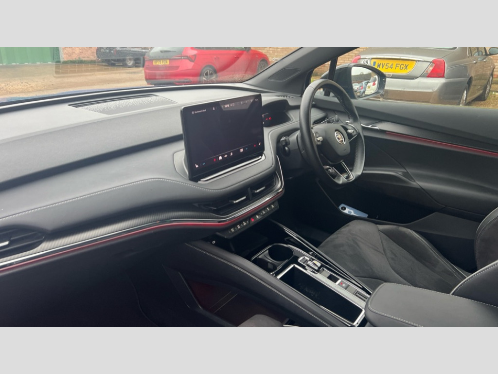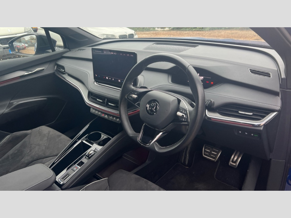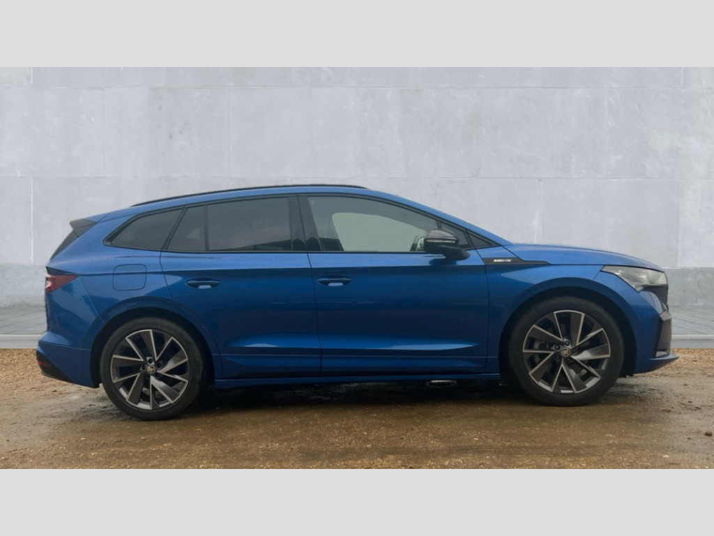 Skoda Enyaq 195kW 80x Sportline 82kWh 4x4 5dr Auto 13" touchscreen display, Bluetooth system, E-call, Electronic engine sound, Exterior temperature indicator, Gesture control, Rear parking sensor, Satellite navigation system, Skoda Connect iV remote services with charging, air conditioning and smart schedules, Smartlink wireless for apple carplay and wired for android auto, Speed limiter, Tailgate, Tailgate unlocking from outside, Virtual cockpit, Voice control system, Washer fluid level indicator, Wi-Fi hotspot, 125 kW DC charging, 6m mode 3 cable (32A), Shock absorption in front, Shock absorption in rear, Sports suspension, 8 Speakers, DAB Digital radio, USB-C ports (charging + data), Additional body cover on wheel arch and side sill, Auto dimming rear view mirror, Black decorative trims (including window and grille surround), Black roof rails, Body colour door mirrors and handles, Dashboard and door moulding light in multiple colours, Dynamic headlight range control with cornering light function, Electric adjustable heated folding door mirrors with boarding spots and welcome logo, Electric front and rear windows, Heat insulating darkened glass in side and rear windows, Heat insulating glass in windshield, Heated rear window, LED third brake light, Light assistant (coming home/tunnel light), Radiator grill in black gloss, Radiator grille frame in matt black with chrome strip, Rain and light sensors, Rear side wing doors, Rear spoiler, Rear window wiper with washer system and intermittent control, Safety reflectors on front and rear doors, Skoda lettering on tailgate in black, Sports bumpers, 12V socket in boot, 3 seat bench in 2nd row, 4 foldable roof handles with rear coat hooks, 60:40 foldable rear seat with sliding adjustment and backrest angle adjustment, Additional noise suppression, Aluminium pedals, Boot lighting, Coat hooks on B pillar, Front and rear footwell lighting, Front and rear height adjustable headrests, Front courtesy lights, Front reading lights, Front sport seats, High centre console with armrest, Illuminated and cooled glovebox, Interior door handle lighting in front and rear, Isofix child seat fittings in outer rear seats with top tether, Isofix child seat preparation for front passenger seat, Laminated soft-touch plastic knee rest, LED ambient lighting, Manually adjustable steering column, Pollen filter, Rear reading lights, Single front passenger seat, Sliding boot cover, Sunvisors with illuminated vanity mirrors, Umbrella in door panel, SportLine design pack - Enyaq, 3 point height adj front seatbelts + pretensioners, Auto door release and activation of warning lights in the event of an accident, Central interaction airbag, Child safety lock, Driver and front passenger airbags, ESC (incl. ABS+MSR+ASR+EDS+HBA+DSR+RBS+MKB), Front and rear three point safety belt on all seats, Front assist with assisted automatic braking, Front disc brakes, Front passenger airbag deactivation switch, Front side airbags with curtain airbags, Rear drum brakes, Single tone horn, Tyre pressure monitor, Visual and acoustic seat belt reminder, Warning lights in front doors, Anti theft alarm system with interior monitoring, backup horn and towing protection, Remote central locking with SAFE system, Anti-theft wheel bolts protection, Tyre repair kit with compressor