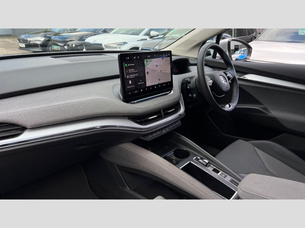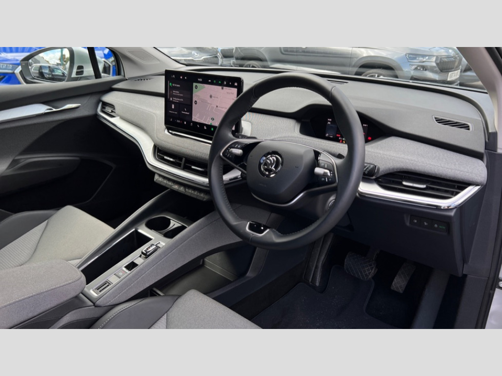 Skoda Enyaq 210kW 85 Edition 82kWh 5dr Auto 13" touchscreen display, Adaptive Cruise Control with traffic jam assist, Blind Spot Detection (BAS), Bluetooth system, Digital cockpit, Drive mode selector, Driver alert system, E-call, Electrically operated tailgate with kick activation (virtual pedal), Electronic engine sound, Exterior temperature indicator, Front and rear parking sensors, Gesture control, Power assist steering, Rear view camera, Satellite navigation system, Skoda Connect iV remote services with charging, air conditioning and smart schedules, Speed assist, Speed limiter, Tailgate unlocking from outside, Traffic sign recognition, Travel assist with emergency assist, lane assist plus with narrow lane assist and urban evasive steering support, Voice control system, Washer fluid level indicator, Wi-Fi hotspot, Wireless charging with cooling function, Wireless smartlink, 135 kW DC charging, 6m mode 3 cable (32A), 8 Speakers, DAB Digital radio, USB-C ports (charging + data) front and rear, Auto dimming rear view mirror, Body colour bumpers, Body colour door mirrors and handles, Chrome roof rails, Chrome side window surrounds, Door mirror memory, Door moulding light in multiple colours, Dynamic headlight range control with cornering light function, Electric adjustable heated folding door mirrors with boarding spots and welcome logo, Electric front and rear windows, Front fog lights, Full LED Matrix beam headlights with variable light distribution, Full LED rear lights with variable lighting functions, Headlight washers, Heat insulating darkened glass in side and rear windows, Heat insulating glass in windshield, Heated rear window, LED daytime running lights, LED third brake light, Light assistant (coming home/tunnel light), Privacy glass and acoustic side windows, Radiator grille in matt black with chrome surround, Rain and light sensors, Rear boot spoiler, Rear side wing doors, Rear window wiper with washer system and intermittent control, Rear wiper, Safety reflectors on front and rear doors, Tow bar preparation, Variable front intermittent wipers, 12V socket in boot, 1x umbrella, 2 spoke black leather heated multi function steering wheel with paddles for recuperation level selection, 3 rear headrests, 3 seat bench in 2nd row, 4 foldable roof handles with rear coat hooks, 60:40 foldable rear seat with sliding adjustment and backrest angle adjustment, Boot lighting, Coat hooks on B pillar, Driver's electric adjustable lumbar support, Electrically adjustable driver seat with memory function, Extended interior noise suspension, Front and rear footwell lighting, Front and rear height adjustable headrests, Front centre armrest, Front courtesy lights, Front headrests, Front reading lights, Glasses storage compartment in front centre armrest, Heated front seats, Height adjustable front passenger seat, High centre console, Interior door handle lighting in front and rear, Isofix child seat fittings in outer rear seats with top tether, Isofix child seat preparation for front passenger seat, Laminated soft-touch plastic knee rest, LED ambient lighting, Manual lumbar support for front passenger seat, Manual rear window blind, Manually adjustable steering column, Pollen filter, Rear reading lights, Rear storage compartment, Single front passenger seat, Sliding boot cover, Sunvisors with illuminated vanity mirrors, Tri zone climate control, Loft design pack - Enyaq, 3 point height adj front seatbelts + pretensioners, Auto door release and activation of warning lights in the event of an accident, Central interaction airbag, Crew protection assist, Driver and front passenger airbags, ESC (incl. ABS+MSR+ASR+EDS+HBA+DSR+RBS+MKB), Front and rear three point safety belt on all seats, Front assist with assisted automatic braking, Front disc brakes, Front passenger airbag deactivation switch, Front side airbags with curtain airbags, Height adjustable seatbelts, Power child locks, Rear drum brakes, Rear side airbags, Single tone horn, Tyre pressure monitor, Visual and acoustic seat belt reminder, Warning lights in front doors, Anti theft alarm system with interior monitoring, backup horn and towing protection, Central locking system with SAFE system, Keyless entry and start/stop system advanced with walk away locking, Anti-theft wheel bolts protection, Tyre repair kit with compressor