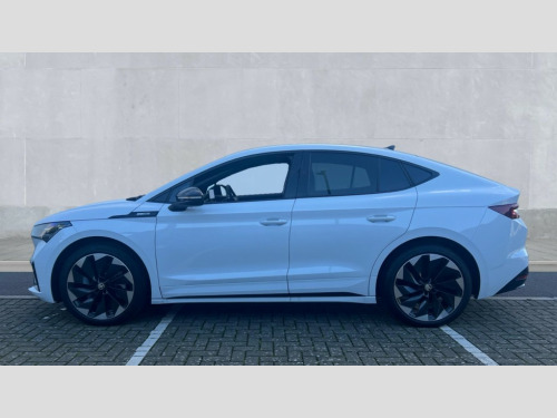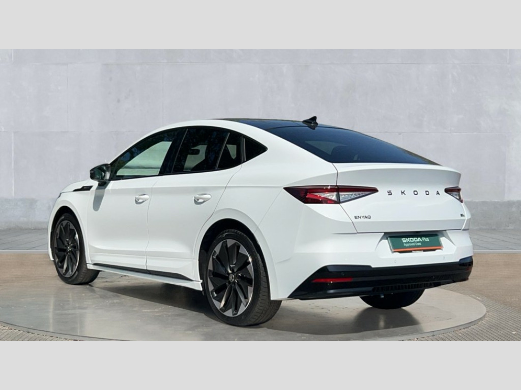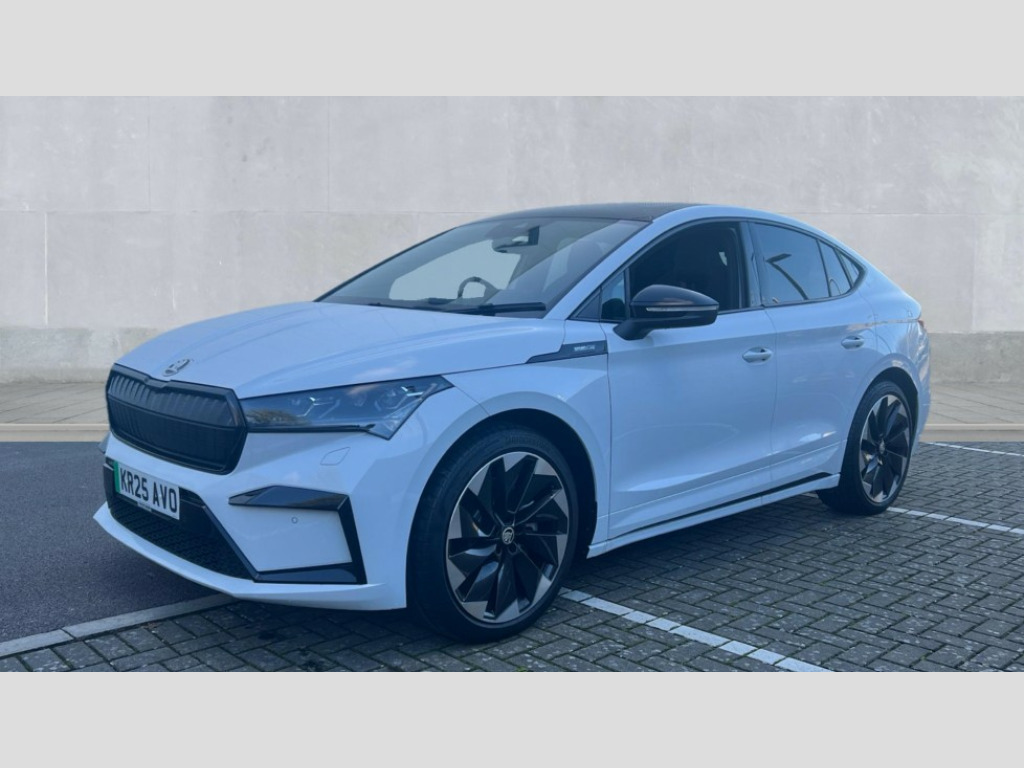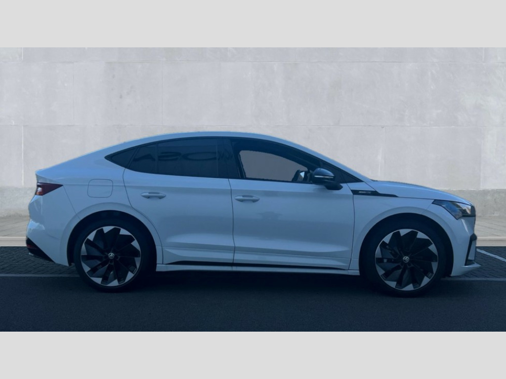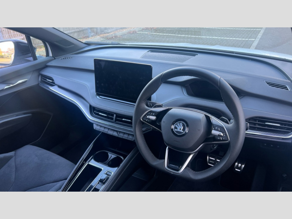 Skoda Enyaq 210kW 85x Sportline Plus 82kWh 4x4 5dr Auto 13" touchscreen display, Adaptive Cruise Control with traffic jam assist, Blind Spot Detection (BAS), Bluetooth system, Digital cockpit, Drive mode selector, Driver alert system, E-call, Electrically operated tailgate with kick activation (virtual pedal), Electronic engine sound, Exterior temperature indicator, Front and rear parking sensors, Gesture control, Progressive steering, Rear view camera, Satellite navigation system, Skoda Connect iV remote services with charging, air conditioning and smart schedules, Speed assist, Speed limiter, Tailgate unlocking from outside, Traffic sign recognition, Travel assist with emergency assist, lane assist plus with narrow lane assist and urban evasive steering support, Voice control system, Washer fluid level indicator, Wi-Fi hotspot, Wireless charging with cooling function, Wireless smartlink, 175 kW DC charging, 6m mode 3 cable (32A), Four wheel drive, Shock absorption in front, Shock absorption in rear, 8 Speakers, DAB Digital radio, USB-C ports (charging + data) front and rear, Auto dimming rear view mirror, Black decorative trims (including window and grille surround), Body colour bumpers, Body colour door mirrors and handles, Body colour door sills, Chrome side window surrounds, Dashboard and door moulding light in multiple colours, Door mirror memory, Dynamic headlight range control with cornering light function, Electric adjustable heated folding door mirrors with boarding spots and welcome logo, Electric front and rear windows, Front fog lights, Full LED Matrix beam headlights with variable light distribution, Full LED rear lights with variable lighting functions, Headlight washers, Heat insulating darkened glass in side and rear windows, Heat insulating glass in windshield, Heated rear window, LED daytime running lights, LED third brake light, Light assistant (coming home/tunnel light), Panoramic sunroof, Privacy glass and acoustic side windows, Radiator grille in gloss black, Rain and light sensors, Rear side wing doors, Safety reflectors on front and rear doors, Skoda lettering on tailgate in black, Sports bumpers, Tow bar preparation, 12V socket in boot, 1x umbrella, 3 rear headrests, 3 seat bench in 2nd row, 3-spoke black leather heated sports multifunction steering wheel with black stitching and paddles for recuperation level selection, 4 foldable roof handles with rear coat hooks, 60:40 foldable rear seat with sliding adjustment and backrest angle adjustment, Aluminium pedals, Boot lighting, Coat hooks on B pillar, Driver's electric adjustable lumbar support, Electrically adjustable driver seat with memory function, Extended interior noise suspension, Front and rear footwell lighting, Front and rear height adjustable headrests, Front courtesy lights, Front headrests, Front reading lights, Front sport seats, Glasses storage compartment in front centre armrest, Heated front seats, Height adjustable front passenger seat, High centre console with armrest, Illuminated and cooled glovebox, Interior door handle lighting in front and rear, Isofix child seat fittings in outer rear seats with top tether, Isofix child seat preparation for front passenger seat, Laminated soft-touch plastic knee rest, LED ambient lighting, Manual lumbar support for front passenger seat, Manual rear window blind, Manually adjustable steering column, Parcel shelf - folding, Pollen filter, Rear reading lights, Rear storage compartment, Single front passenger seat, Sunvisors with illuminated vanity mirrors, Tri zone climate control, SportLine design pack with Microsuede/leather - Enyaq, 3 point height adj front seatbelts + pretensioners, Auto door release and activation of warning lights in the event of an accident, Central interaction airbag, Crew protection assist, Driver and front passenger airbags, ESC (incl. ABS+MSR+ASR+EDS+HBA+DSR+RBS+MKB), Front and rear three point safety belt on all seats, Front assist with assisted automatic braking, Front disc brakes, Front passenger airbag deactivation switch, Front side airbags with curtain airbags, Height adjustable seatbelts, Power child locks, Rear drum brakes, Rear side airbags, Single tone horn, Tyre pressure monitor, Visual and acoustic seat belt reminder, Warning lights in front doors, Anti theft alarm system with interior monitoring, backup horn and towing protection, Central locking system with SAFE system, Keyless entry and start/stop system advanced with walk away locking, 20" Vega anthracite metallic alloy wheels, Anti-theft wheel bolts protection, Tyre repair kit with compressor