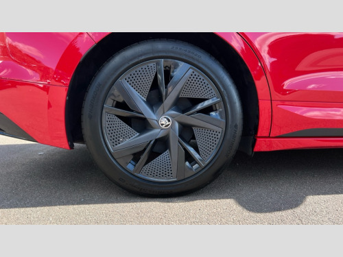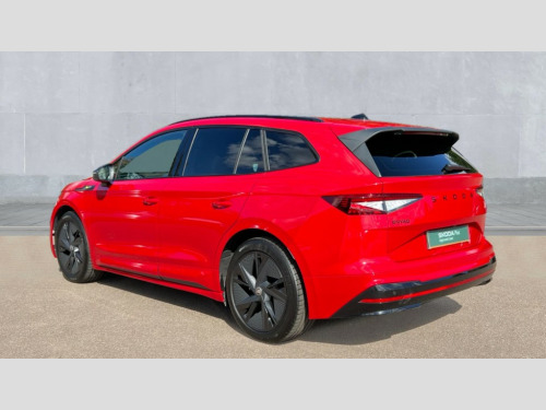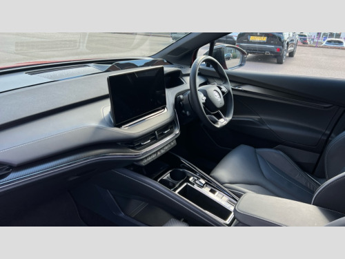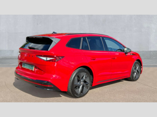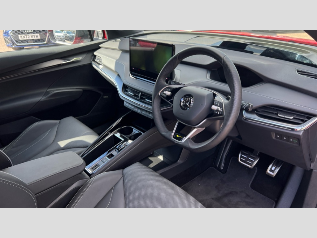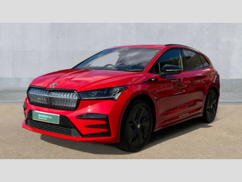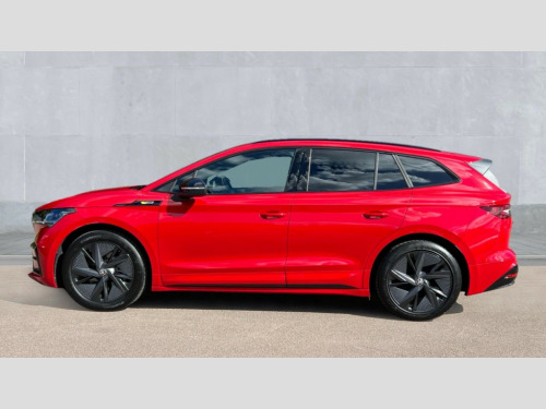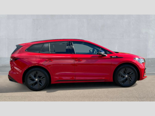 Skoda Enyaq 250kW vRS 82kWh 4x4 5dr Auto 13" touchscreen display, Adaptive Cruise Control with traffic jam assist, Blind Spot Detection (BAS), Bluetooth system, Digital cockpit, Drive mode selector, Driver alert system, E-call, Electrically operated tailgate with kick activation (virtual pedal), Electronic engine sound, Exterior temperature indicator, Front and rear parking sensors, Gesture control, Progressive steering, Rear view camera, Satellite navigation system, Skoda Connect iV remote services with charging, air conditioning and smart schedules, Speed assist, Speed limiter, Tailgate unlocking from outside, Traffic sign recognition, Travel assist with emergency assist, lane assist plus with narrow lane assist and urban evasive steering support, Voice control system, Washer fluid level indicator, Wi-Fi hotspot, Wireless charging with cooling function, Wireless smartlink, 175 kW DC charging, 6m mode 3 cable (32A), Four wheel drive, Shock absorption in front, Shock absorption in rear, 8 Speakers, DAB Digital radio, USB-C ports (charging + data) front and rear, Auto dimming rear view mirror, Black decorative trims (including window and grille surround), Black roof rails, Body colour bumpers, Body colour door mirrors and handles, Body colour door sills, Chrome side window surrounds, Crystal face, Dashboard and door moulding light in multiple colours, Door mirror memory, Dynamic headlight range control with cornering light function, Electric adjustable heated folding door mirrors with boarding spots and welcome logo, Electric front and rear windows, Front fog lights, Full LED Matrix beam headlights with variable light distribution, Full LED rear lights with variable lighting functions, Headlight washers, Heat insulating darkened glass in side and rear windows, Heat insulating glass in windshield, Heated rear window, LED daytime running lights, LED third brake light, Light assistant (coming home/tunnel light), Privacy glass and acoustic side windows, Radiator grille in gloss black, Rain and light sensors, Rear boot spoiler, Rear side wing doors, Rear window wiper with washer system and intermittent control, Rear wiper, Safety reflectors on front and rear doors, Skoda lettering on tailgate in black, Tow bar preparation, Variable front intermittent wipers, vRS sports bumpers, 12V socket in boot, 1x umbrella, 3 rear headrests, 3 seat bench in 2nd row, 3-spoke black leather heated sports multifunction steering wheel with black stitching and paddles for recuperation level selection, 4 foldable roof handles with rear coat hooks, Aluminium pedals, Boot lighting, Coat hooks on B pillar, Driver's electric adjustable lumbar support, Electrically adjustable driver seat with memory function, Extended interior noise suspension, Front and rear footwell lighting, Front and rear height adjustable headrests, Front centre armrest, Front courtesy lights, Front reading lights, Front seat head restraints, Front sport seats, Glasses storage compartment in front centre armrest, Heated front seats, Height adjustable front passenger seat, High centre console, Interior door handle lighting in front and rear, Isofix child seat fittings in outer rear seats with top tether, Isofix child seat preparation for front passenger seat, Laminated soft-touch plastic knee rest, LED ambient lighting, Luggage compartment lighting, Manual lumbar support for front passenger seat, Manual rear window blind, Manually adjustable steering column, Pollen filter, Rear reading lights, Rear seat bench unsplit folding with center armrest, Rear storage compartment, Single front passenger seat, Sliding boot cover, Sunvisors with illuminated vanity mirrors, Tri zone climate control, 3 point height adj front seatbelts + pretensioners, Auto door release and activation of warning lights in the event of an accident, Central interaction airbag, Crew protection assist, Driver and front passenger airbags, ESC (incl. ABS+MSR+ASR+EDS+HBA+DSR+RBS+MKB), Front and rear three point safety belt on all seats, Front assist with assisted automatic braking, Front disc brakes, Front passenger airbag deactivation switch, Front side airbags with curtain airbags, Height adjustable seatbelts, Power child locks, Rear drum brakes, Rear side airbags, Single tone horn, Tyre pressure monitor, Visual and acoustic seat belt reminder, Warning lights in front doors, Anti theft alarm system with interior monitoring, backup horn and towing protection, Central locking system with SAFE system, Keyless entry and start/stop system advanced with walk away locking, Anti-theft wheel bolts protection, Tyre repair kit with compressor