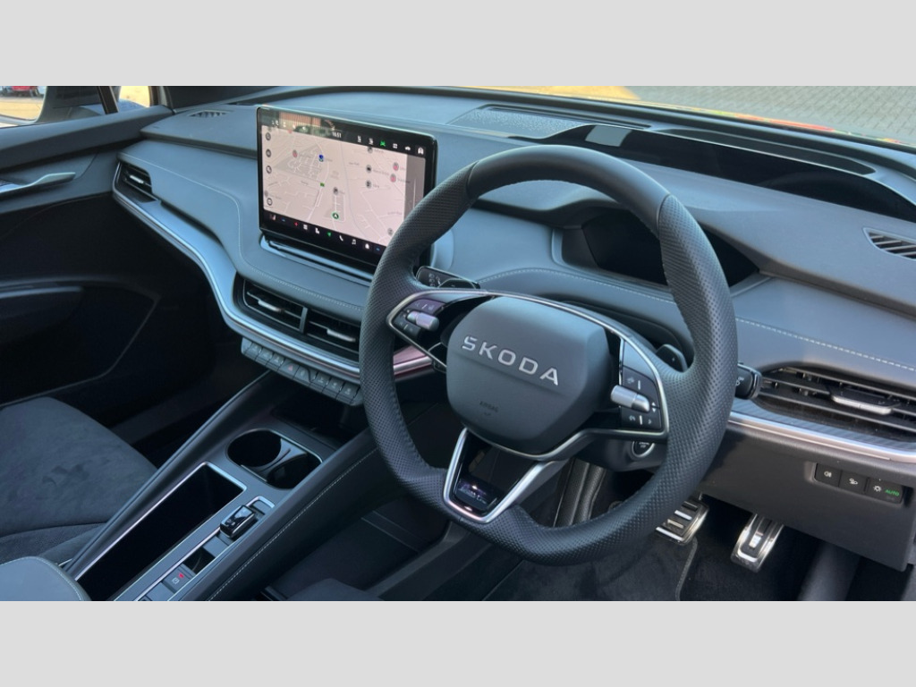 Skoda Enyaq 210kW 85x Sportline 82kWh 4x4 5dr Auto 13" touchscreen display, 15W wireless charging with cooling function, 5" Digital cockpit, Blind Spot Detection (BAS), Bluetooth system, Drive mode selector, Driver alert system, E-call, Electrically operated tailgate with kick activation (virtual pedal), Electronic engine sound, Emergency steering support with turn assist, Exterior temperature indicator, Front and rear parking sensors, Front assist with assisted automatic braking to vehicles, pedestrians and cyclists, Gesture control, Predictive adaptive cruise control with traffic jam assist, Progressive steering, Satellite navigation system, Skoda Connect iV remote services with charging, air conditioning and smart schedules, Speed assist, Speed limiter, Traffic sign recognition, Travel assist plus with emergency assist, lane assist plus with narrow lane assist and urban evasive steering support, Voice control system, Washer fluid level indicator, Wi-Fi hotspot, Wireless smartlink, 165 kW DC charging, 6m mode 3 cable (32A), Four wheel drive, Sports suspension, 45W USB-C ports (charging + data) front and rear, DAB Digital radio, Auto dimming rear view mirror, Body colour door mirrors and handles, Body colour door sills, Dashboard and door moulding light in multiple colours, Door mirror memory, Dynamic headlight range control with cornering light function, Electric adjustable heated folding door mirrors with boarding spots and welcome logo, Electric front and rear windows, Full LED Matrix beam headlights with variable light distribution, Gloss black tailgate lettering, Gloss black window surround, Heat insulating darkened glass in side and rear windows, Heat insulating glass in windshield, Integrated fog light with all-weather function, LED daytime running lights, LED rear lights with animated indicators, LED third brake light, Light assistant (coming and leaving home), Panoramic opening glass sunroof, Privacy glass and acoustic side windows, Radiator grille in gloss black, Rain and light sensors, Rear side wing doors, Rear wiper, Safety reflectors on front and rear doors, Sports bumpers, Variable front intermittent wipers, 12V socket in boot, 1x umbrella, 3 rear headrests, 3 seat bench in 2nd row, 3-spoke leather heated sports multifunction steering wheel with paddles for recuperation level selection, 60:40 foldable rear seat with sliding adjustment and backrest angle adjustment, Aluminium pedals, Black artificial leather dashboard with grey stitching, Black headlining, Black textile floor mats with grey stitching, Boot lighting, Electrically adjustable driver seat with memory function, Extended interior noise suppression, Folding boot cover, Front courtesy lights, Front reading lights, Front sport seats, Front sports head restraints, Heated front seats, Height adjustable drivers seat, Height adjustable front passenger seat, High centre console with armrest, Isofix child seat fittings in outer rear seats with top tether, Isofix child seat preparation for front passenger seat, Laminated soft-touch plastic knee rest, LED ambient lighting, Manual rear window blind, Manually adjustable steering column, Massage functionality for drivers seat, Microsuede/artificial leather upholstery, Pollen filter, Power adjustable lumbar front seats, Rear reading lights, Single front passenger seat, Sunvisors with illuminated vanity mirrors, Tri zone climate control, White front and rear footwell lighting and door handle lighting, Advanced package with head up display - Enyaq, 3 point height adj front seatbelts + pretensioners, Auto door release and activation of warning lights in the event of an accident, Central interaction airbag, Crew protection assist, Driver and front passenger airbags, ESC (incl. ABS+MSR+ASR+EDS+HBA+DSR+RBS+MKB), Front and rear three point safety belt on all seats, Front disc brakes, Front passenger airbag deactivation switch, Front side airbags with curtain airbags, Height adjustable seatbelts, Power child locks, Rear drum brakes, Rear side airbags, Two tone horn, Tyre pressure monitor, Visual and acoustic seat belt reminder, Warning lights in front doors, Anti theft alarm system with interior monitoring, backup horn and towing protection, Central locking system with SAFE system, Keyless entry and start/stop system advanced with walk away locking, Carbon effect decorative inserts, Matte black lining around drive selector, Anti-theft wheel bolts protection, Tyre repair kit with compressor