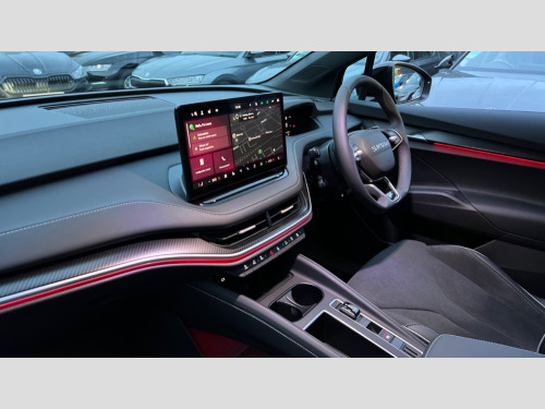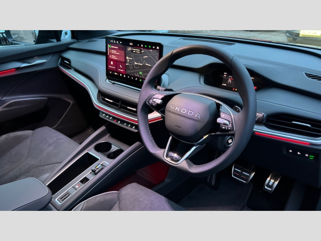 Skoda Elroq 210kW 85 SportLine 82kWh 5dr Auto 13" touchscreen display, 15W wireless charging with cooling function, Blind spot detection, Bluetooth, Digital cockpit, Drive mode select, Driver alert control, eCall emergency system, Electronic engine sound, Emergency steering support with turn assist, Front parking sensors, Gesture control, Predictive adaptive cruise control with traffic jam assist, Progressive dynamic steering, Rear parking sensors, Rear view camera, Satellite navigation system, Skoda Connect iV remote services with charging, air conditioning and smart schedules, Speed assist, Traffic sign recognition, Travel assist plus - emergency assist, lane assist plus with narrow lane assist, urban evasive steering support, Voice control, Washer fluid level indicator, Wi-Fi hotspot, Wireless smartlink, 175 kW DC charging, 6m mode 3 cable (32A), Sports suspension, 45W USB-C ports (charging + data) front and rear, 8 Speakers, DAB Digital radio, Black door mirrors heated, electrically adjustable, folding and auto dimming with boarding spots and welcome logo, Frameless auto dimming rear view mirror, Gloss black roof rails, Gloss black tailgate lettering, Gloss black window surround, Heat insulating glass windscreen, LED 3rd brake light, LED daytime running lights, Light and rain sensors, Light assistant including coming home and leaving function, Manually operated boot, Preparation for tow bar, Privacy glass and acoustic side windows, Rear side wing doors, Rear spoiler, Rear window wiper with washer system and intermittent control, Side and rear windows in heat insulating glass, Sportline bumpers, 12V socket in boot, 1x umbrella, 3 rear headrests, 3 seat bench in 2nd row, 3 spoke leather heated sports multifunction steering wheel with paddles for recuperation level selection, Aluminium pedals, Boot lighting, Extended interior noise suspension, Folding boot cover, Front sport seats, Heated front seats, Integrated head restraints, Isofix child seat fittings in outer rear seats with top tether, Isofix child seat preparation for front passenger seat, LED ambient lighting, Manual lumbar support for front seats, Manually adjustable front seats, Single front passenger seat, SportLine design pack - Elroq, 3 point rear seatbelts, Crew protect assist, Driver and front passenger airbag with passenger airbag deactivation, Electric child locks, ESC (incl. ABS+MSR+ASR+EDS+HBA+DSR+RBS+MKB), Front assist with braking reaction to vehicles, pedestrians and cyclists, Front disc brakes, Front side airbags with curtain airbags and central interaction airbag, Rear drum brakes, Three point seatbelt in front, with pretensioner, lap belt pretensioner and height adjustment, Two tone horn, Tyre pressure monitoring system, Visual and acoustic seat belt reminder, Anti theft alarm system with interior monitoring, backup horn and towing protection, Central locking system with SAFE system, Keyless entry and start/stop system advanced with walk away locking, Anti-theft wheel bolts protection, Tyre repair kit