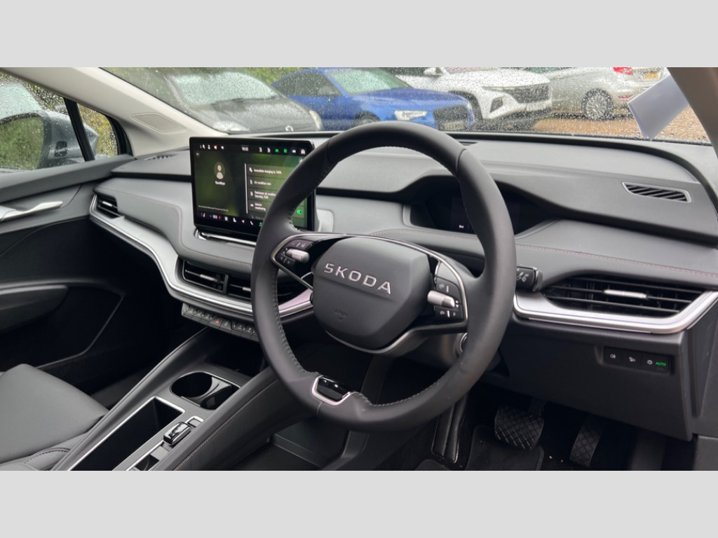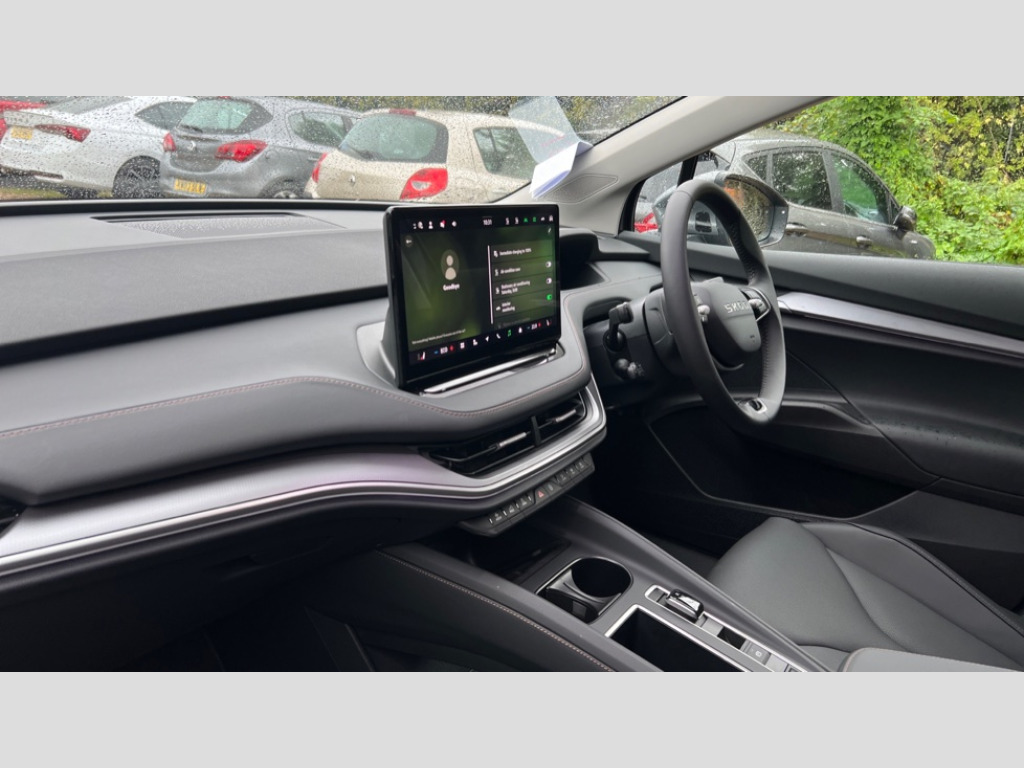 Skoda Enyaq 210kW 85 Edition 82kWh 5dr Auto 13" touchscreen display, Adaptive Cruise Control with traffic jam assist, Blind Spot Detection (BAS), Bluetooth system, Digital cockpit, Drive mode selector, Driver alert system, E-call, Electrically operated tailgate with kick activation (virtual pedal), Electronic engine sound, Exterior temperature indicator, Front and rear parking sensors, Gesture control, Power assist steering, Rear view camera, Satellite navigation system, Skoda Connect iV remote services with charging, air conditioning and smart schedules, Speed assist, Speed limiter, Tailgate unlocking from outside, Traffic sign recognition, Travel assist with emergency assist, lane assist plus with narrow lane assist and urban evasive steering support, Voice control system, Washer fluid level indicator, Wi-Fi hotspot, Wireless charging with cooling function, Wireless smartlink, 135 kW DC charging, 6m mode 3 cable (32A), 8 Speakers, DAB Digital radio, USB-C ports (charging + data) front and rear, Auto dimming rear view mirror, Body colour bumpers, Body colour door mirrors and handles, Dashboard and door moulding light in multiple colours, Door mirror memory, Dynamic headlight range control with cornering light function, Electric adjustable heated folding door mirrors with boarding spots and welcome logo, Electric front and rear windows, Front fog lights, Full LED Matrix beam headlights with variable light distribution, Full LED rear lights with variable lighting functions, Headlight washers, Heat insulating darkened glass in side and rear windows, Heat insulating glass in windshield, Heated rear window, LED daytime running lights, LED third brake light, Light assistant (coming home/tunnel light), Panoramic sunroof, Privacy glass and acoustic side windows, Radiator grille in matt black with chrome surround, Rain and light sensors, Rear side wing doors, Safety reflectors on front and rear doors, Tow bar preparation, 12V socket in boot, 1x umbrella, 2 spoke black leather heated multi function steering wheel with paddles for recuperation level selection, 3 rear headrests, 3 seat bench in 2nd row, 4 foldable roof handles with rear coat hooks, 60:40 foldable rear seat with sliding adjustment and backrest angle adjustment, Boot lighting, Coat hooks on B pillar, Driver's electric adjustable lumbar support, Electrically adjustable driver seat with memory function, Extended interior noise suspension, Front and rear footwell lighting, Front and rear height adjustable headrests, Front courtesy lights, Front headrests, Front reading lights, Glasses storage compartment in front centre armrest, Heated front seats, Height adjustable front passenger seat, High centre console with armrest, Interior door handle lighting in front and rear, Isofix child seat fittings in outer rear seats with top tether, Isofix child seat preparation for front passenger seat, Laminated soft-touch plastic knee rest, LED ambient lighting, Manual lumbar support for front passenger seat, Manual rear window blind, Manually adjustable steering column, Parcel shelf - folding, Pollen filter, Rear reading lights, Rear storage compartment, Single front passenger seat, Sunvisors with illuminated vanity mirrors, Tri zone climate control, Suite design pack - Enyaq, 3 point height adj front seatbelts + pretensioners, Auto door release and activation of warning lights in the event of an accident, Central interaction airbag, Crew protection assist, Driver and front passenger airbags, ESC (incl. ABS+MSR+ASR+EDS+HBA+DSR+RBS+MKB), Front and rear three point safety belt on all seats, Front assist with assisted automatic braking, Front disc brakes, Front passenger airbag deactivation switch, Front side airbags with curtain airbags, Height adjustable seatbelts, Power child locks, Rear drum brakes, Rear side airbags, Single tone horn, Tyre pressure monitor, Visual and acoustic seat belt reminder, Warning lights in front doors, Anti theft alarm system with interior monitoring, backup horn and towing protection, Central locking system with SAFE system, Keyless entry and start/stop system advanced with walk away locking, Anti-theft wheel bolts protection, Tyre repair kit with compressor
