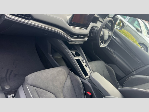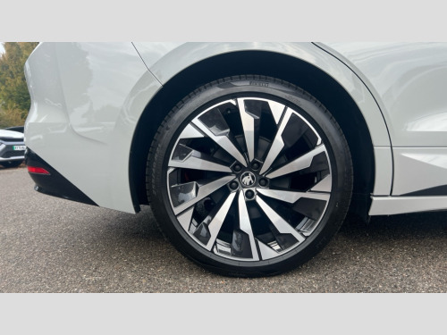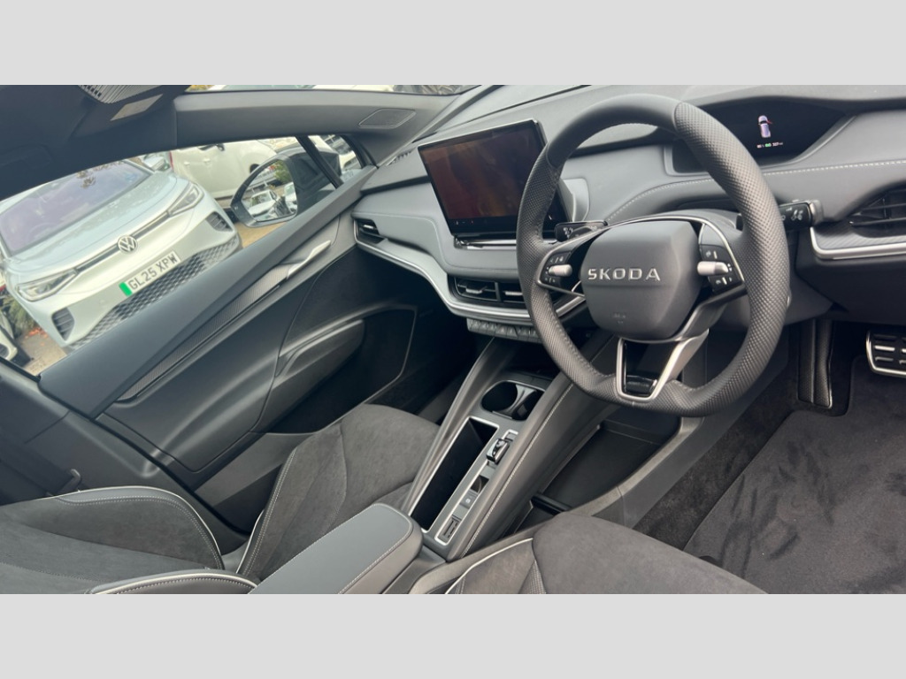 Skoda Enyaq 210kW 85 Sportline 82kWh 5dr Auto 13" touchscreen display, 15W wireless charging with cooling function, 5" Digital cockpit, Blind Spot Detection (BAS), Bluetooth system, Drive mode selector, Driver alert system, E-call, Electrically operated tailgate with kick activation (virtual pedal), Electronic engine sound, Emergency steering support with turn assist, Exterior temperature indicator, Front and rear parking sensors, Front assist with assisted automatic braking to vehicles, pedestrians and cyclists, Gesture control, Predictive adaptive cruise control with traffic jam assist, Progressive steering, Satellite navigation system, Skoda Connect iV remote services with charging, air conditioning and smart schedules, Speed assist, Speed limiter, Traffic sign recognition, Travel assist plus with emergency assist, lane assist plus with narrow lane assist and urban evasive steering support, Voice control system, Washer fluid level indicator, Wi-Fi hotspot, Wireless smartlink, 135 kW DC charging, 6m mode 3 cable (32A), Sports suspension, 45W USB-C ports (charging + data) front and rear, DAB Digital radio, Auto dimming rear view mirror, Body colour door mirrors and handles, Body colour door sills, Dashboard and door moulding light in multiple colours, Door mirror memory, Dynamic headlight range control with cornering light function, Electric adjustable heated folding door mirrors with boarding spots and welcome logo, Electric front and rear windows, Full LED Matrix beam headlights with variable light distribution, Gloss black tailgate lettering, Gloss black window surround, Heat insulating darkened glass in side and rear windows, Heat insulating glass in windshield, Integrated fog light with all-weather function, LED daytime running lights, LED rear lights with animated indicators, LED third brake light, Light assistant (coming and leaving home), Panoramic opening glass sunroof, Privacy glass and acoustic side windows, Radiator grille in gloss black, Rain and light sensors, Rear side wing doors, Rear wiper, Safety reflectors on front and rear doors, Sports bumpers, Variable front intermittent wipers, 12V socket in boot, 1x umbrella, 3 rear headrests, 3 seat bench in 2nd row, 3-spoke leather heated sports multifunction steering wheel with paddles for recuperation level selection, 60:40 foldable rear seat with sliding adjustment and backrest angle adjustment, Aluminium pedals, Black artificial leather dashboard with grey stitching, Black textile floor mats with grey stitching, Boot lighting, Electrically adjustable driver seat with memory function, Extended interior noise suppression, Folding boot cover, Front courtesy lights, Front reading lights, Front sport seats, Front sports head restraints, Heated front seats, Height adjustable drivers seat, Height adjustable front passenger seat, High centre console with armrest, Isofix child seat fittings in outer rear seats with top tether, Isofix child seat preparation for front passenger seat, Laminated soft-touch plastic knee rest, LED ambient lighting, Manual rear window blind, Manually adjustable steering column, Massage functionality for drivers seat, Microsuede/artificial leather upholstery, Pollen filter, Power adjustable lumbar front seats, Rear reading lights, Single front passenger seat, Sunvisors with illuminated vanity mirrors, Tri zone climate control, White front and rear footwell lighting and door handle lighting, Advanced package with head up display - Enyaq, 3 point height adj front seatbelts + pretensioners, Auto door release and activation of warning lights in the event of an accident, Black seatbelts, Central interaction airbag, Crew protection assist, Driver and front passenger airbags, ESC (incl. ABS+MSR+ASR+EDS+HBA+DSR+RBS+MKB), Front and rear three point safety belt on all seats, Front disc brakes, Front passenger airbag deactivation switch, Front side airbags with curtain airbags, Height adjustable seatbelts, Power child locks, Rear drum brakes, Rear side airbags, Two tone horn, Tyre pressure monitor, Visual and acoustic seat belt reminder, Warning lights in front doors, Anti theft alarm system with interior monitoring, backup horn and towing protection, Central locking system with SAFE system, Keyless entry and start/stop system advanced with walk away locking, Black fabric headlining, Carbon effect decorative inserts, Matte black lining around drive selector, Anti-theft wheel bolts protection, Tyre repair kit with compressor