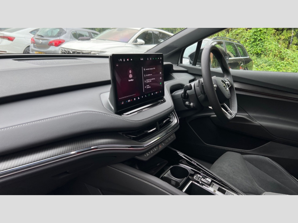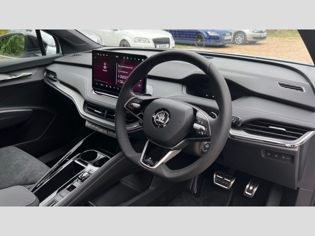 The performance of this Enyaq is truly noteworthy, with an acceleration of 0-60mph achieved in a swift 6.4 seconds, demonstrating its dynamic capabilities. This indicates how the vehicle is better than other similar vehicles in its class. For home charging, a full charge from empty takes approximately 12 hours and 13 minutes using a 7kW charger, while rapid public charging can replenish the battery from empty to 80% in as little as 28 minutes, highlighting its convenience for longer journeys. With only one owner from new, this Skoda Enyaq represents a superb blend of cutting edge electric technology, comfort, and performance. 13" touchscreen display, Adaptive Cruise Control with traffic jam assist, Blind Spot Detection (BAS), Bluetooth system, Digital cockpit, Drive mode selector, Driver alert system, E-call, Electrically operated tailgate with kick activation (virtual pedal), Electronic engine sound, Exterior temperature indicator, Front and rear parking sensors, Gesture control, Progressive steering, Rear view camera, Satellite navigation system, Skoda Connect iV remote services with charging, air conditioning and smart schedules, Speed assist, Speed limiter, Tailgate unlocking from outside, Traffic sign recognition, Travel assist with emergency assist, lane assist plus with narrow lane assist and urban evasive steering support, Voice control system, Washer fluid level indicator, Wi-Fi hotspot, Wireless charging with cooling function, Wireless smartlink, 175 kW DC charging, 6m mode 3 cable (32A), Four wheel drive, Shock absorption in front, Shock absorption in rear, 8 Speakers, DAB Digital radio, USB-C ports (charging + data) front and rear, Auto dimming rear view mirror, Black decorative trims (including window and grille surround), Body colour bumpers, Body colour door mirrors and handles, Body colour door sills, Chrome side window surrounds, Dashboard and door moulding light in multiple colours, Door mirror memory, Dynamic headlight range control with cornering light function, Electric adjustable heated folding door mirrors with boarding spots and welcome logo, Electric front and rear windows, Front fog lights, Full LED Matrix beam headlights with variable light distribution, Full LED rear lights with variable lighting functions, Headlight washers, Heat insulating darkened glass in side and rear windows, Heat insulating glass in windshield, Heated rear window, LED daytime running lights, LED third brake light, Light assistant (coming home/tunnel light), Panoramic sunroof, Privacy glass and acoustic side windows, Radiator grille in gloss black, Rain and light sensors, Rear side wing doors, Safety reflectors on front and rear doors, Skoda lettering on tailgate in black, Sports bumpers, Tow bar preparation, 12V socket in boot, 1x umbrella, 3 rear headrests, 3 seat bench in 2nd row, 3-spoke black leather heated sports multifunction steering wheel with black stitching and paddles for recuperation level selection, 4 foldable roof handles with rear coat hooks, 60:40 foldable rear seat with sliding adjustment and backrest angle adjustment, Aluminium pedals, Boot lighting, Coat hooks on B pillar, Driver's electric adjustable lumbar support, Electrically adjustable driver seat with memory function, Extended interior noise suspension, Front and rear footwell lighting, Front and rear height adjustable headrests, Front courtesy lights, Front headrests, Front reading lights, Front sport seats, Glasses storage compartment in front centre armrest, Heated front seats, Height adjustable front passenger seat, High centre console with armrest, Illuminated and cooled glovebox, Interior door handle lighting in front and rear, Isofix child seat fittings in outer rear seats with top tether, Isofix child seat preparation for front passenger seat, Laminated soft-touch plastic knee rest, LED ambient lighting, Manual lumbar support for front passenger seat, Manual rear window blind, Manually adjustable steering column, Parcel shelf - folding, Pollen filter, Rear reading lights, Rear storage compartment, Single front passenger seat, Sunvisors with illuminated vanity mirrors, Tri zone climate control, SportLine design pack with Microsuede/leather - Enyaq, 3 point height adj front seatbelts + pretensioners, Auto door release and activation of warning lights in the event of an accident, Central interaction airbag, Crew protection assist, Driver and front passenger airbags, ESC (incl. ABS+MSR+ASR+EDS+HBA+DSR+RBS+MKB), Front and rear three point safety belt on all seats, Front assist with assisted automatic braking, Front disc brakes, Front passenger airbag deactivation switch, Front side airbags with curtain airbags, Height adjustable seatbelts, Power child locks, Rear drum brakes, Rear side airbags, Single tone horn, Tyre pressure monitor, Visual and acoustic seat belt reminder, Warning lights in front doors, Anti theft alarm system with interior monitoring, backup horn and towing protection, Central locking system with SAFE system, Keyless entry and start/stop system advanced with walk away locking, 20" Vega anthracite metallic alloy wheels, Anti-theft wheel bolts protection, Tyre repair kit with compressor