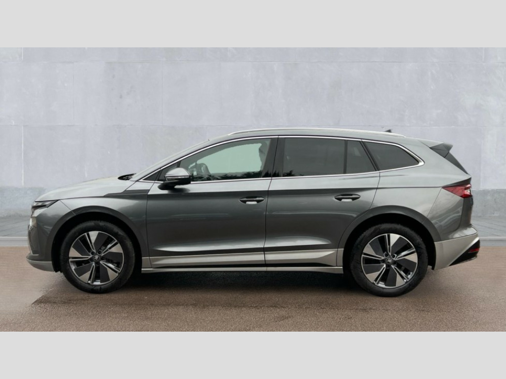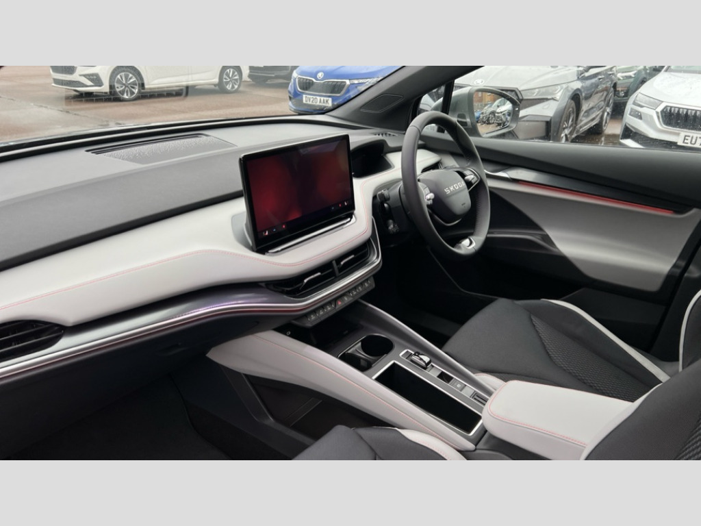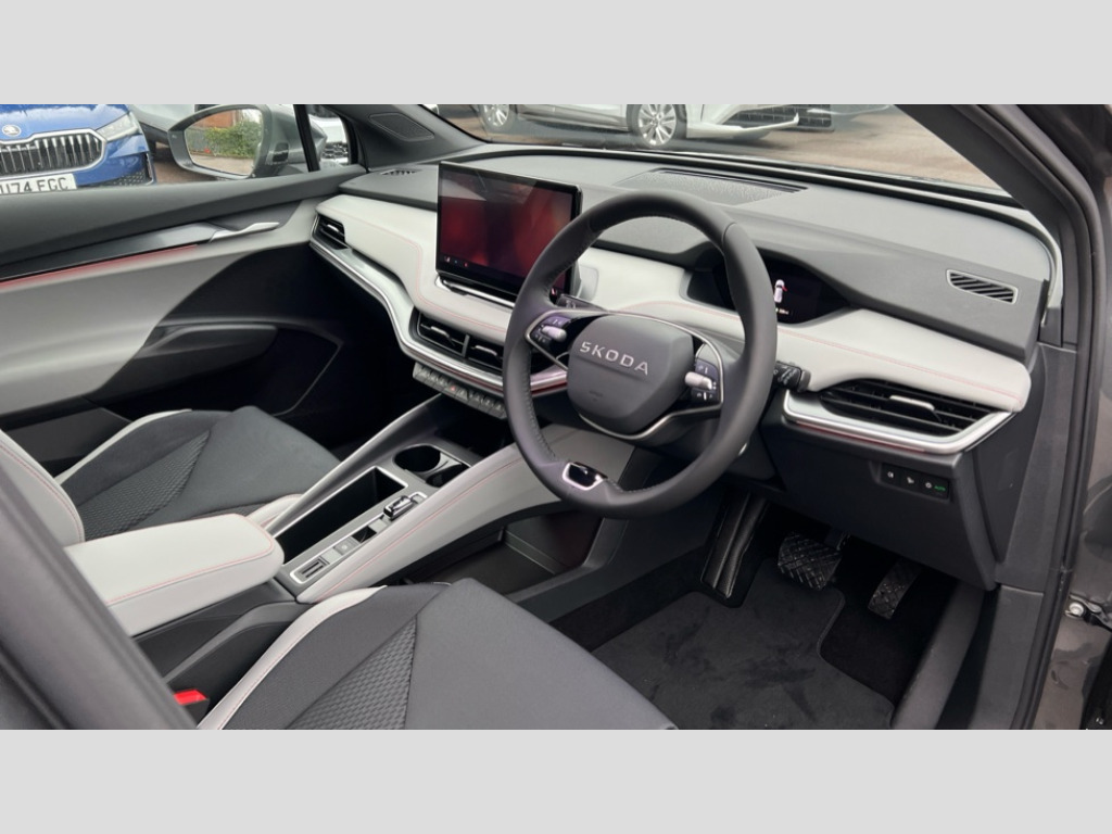 Skoda Enyaq 150kW 60 Edition 63kWh 5dr Auto 13" touchscreen display, Adaptive Cruise Control with traffic jam assist, Blind Spot Detection (BAS), Bluetooth system, Digital cockpit, Drive mode selector, Driver alert system, E-call, Electrically operated tailgate with kick activation (virtual pedal), Electronic engine sound, Exterior temperature indicator, Front and rear parking sensors, Gesture control, Power assist steering, Rear view camera, Satellite navigation system, Skoda Connect iV remote services with charging, air conditioning and smart schedules, Speed assist, Speed limiter, Tailgate unlocking from outside, Traffic sign recognition, Travel assist with emergency assist, lane assist plus with narrow lane assist and urban evasive steering support, Voice control system, Washer fluid level indicator, Wi-Fi hotspot, Wireless charging, Wireless smartlink, 120 kW DC charging, 6m mode 3 cable (32A), 8 Speakers, DAB Digital radio, USB-C ports (charging + data) front and rear, Auto dimming rear view mirror, Black roof rails, Body colour bumpers, Body colour door mirrors and handles, Door mirror memory, Door moulding light in multiple colours, Dynamic headlight range control with cornering light function, Electric adjustable heated folding door mirrors with boarding spots and welcome logo, Electric front and rear windows, Front fog lights, Full LED Matrix beam headlights with variable light distribution, Full LED rear lights with variable lighting functions, Headlight washers, Heat insulating darkened glass in side and rear windows, Heat insulating glass in windshield, Heated rear window, Heated washer nozzles, LED daytime running lights, LED third brake light, Light assistant (coming home/tunnel light), Privacy glass and acoustic side windows, Radiator grille in matt black with chrome surround, Rain and light sensors, Rear side wing doors, Rear spoiler, Rear window wiper with washer system and intermittent control, Rear wiper, Safety reflectors on front and rear doors, Tow bar preparation, Variable front intermittent wipers, 12V socket in boot, 1x umbrella, 2 spoke black leather heated multi function steering wheel with paddles for recuperation level selection, 3 rear headrests, 3 seat bench in 2nd row, 4 foldable roof handles with rear coat hooks, 60:40 foldable rear seat with sliding adjustment and backrest angle adjustment, Boot lighting, Coat hooks on B pillar, Driver's electric adjustable lumbar support, Electrically adjustable driver seat with memory function, Extended interior noise suspension, Front and rear footwell lighting, Front and rear height adjustable headrests, Front centre armrest, Front courtesy lights, Front headrests, Front reading lights, Glasses storage compartment in front centre armrest, Heated front seats, Height adjustable front passenger seat, High centre console, Illuminated and cooled glovebox, Interior door handle lighting in front and rear, Isofix child seat fittings in outer rear seats with top tether, Isofix child seat preparation for front passenger seat, Laminated soft-touch plastic knee rest, LED ambient lighting, Manual lumbar support for front passenger seat, Manual rear window blind, Manually adjustable steering column, Pollen filter, Rear reading lights, Rear storage compartment, Single front passenger seat, Sliding boot cover, Sunvisors with illuminated vanity mirrors, Tri zone climate control, Loft design pack - Enyaq, 3 point height adj front seatbelts + pretensioners, Auto door release and activation of warning lights in the event of an accident, Central interaction airbag, Crew protection assist, Driver and front passenger airbags, ESC (incl. ABS+MSR+ASR+EDS+HBA+DSR+RBS+MKB), Front and rear three point safety belt on all seats, Front assist with assisted automatic braking, Front disc brakes, Front passenger airbag deactivation switch, Front side airbags with curtain airbags, Power child locks, Rear drum brakes, Rear side airbags, Single tone horn, Tyre pressure monitor, Visual and acoustic seat belt reminder, Warning lights in front doors, Anti theft alarm system with interior monitoring, backup horn and towing protection, Central locking system with SAFE system, Keyless entry and start/stop system advanced with walk away locking, Anti-theft wheel bolts protection, Tyre repair kit with compressor
